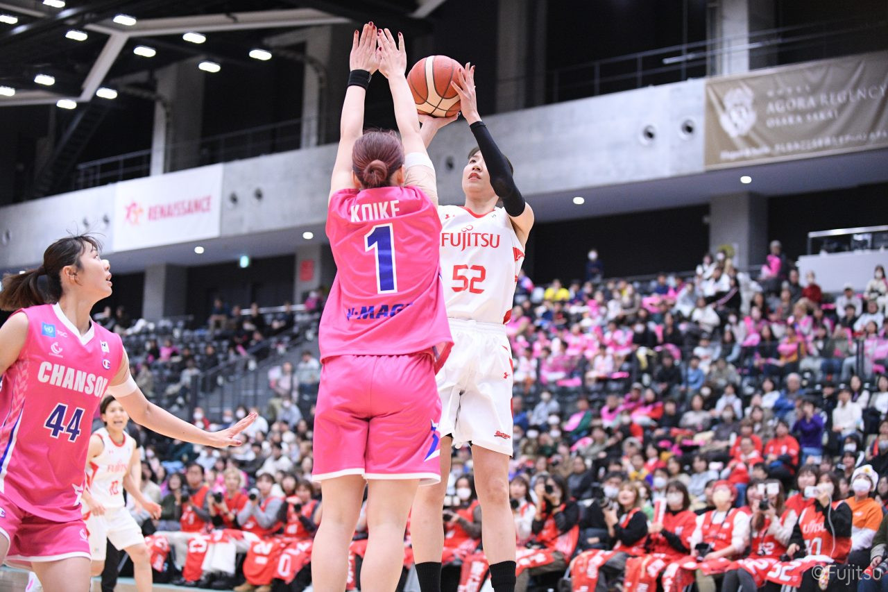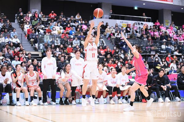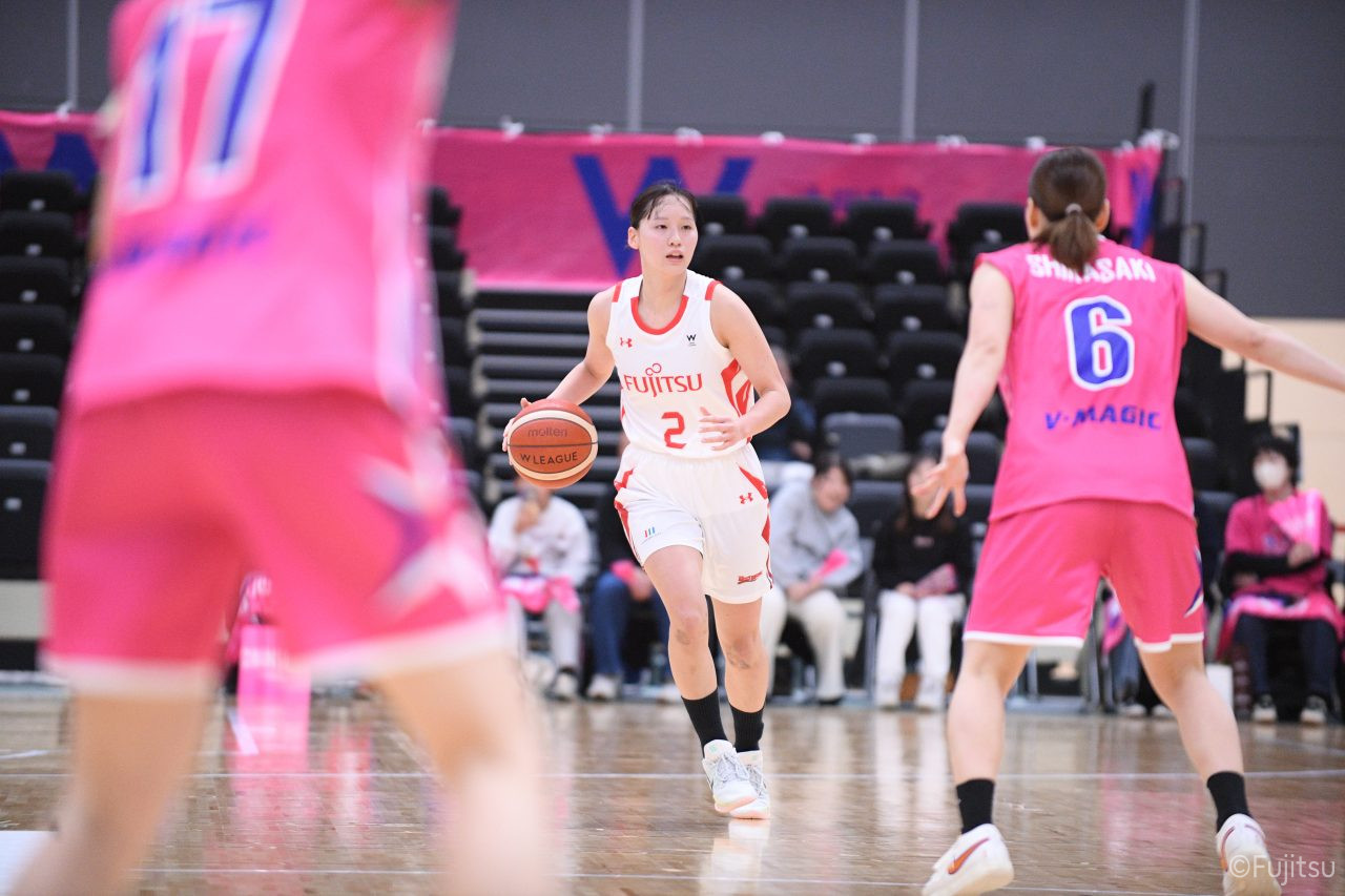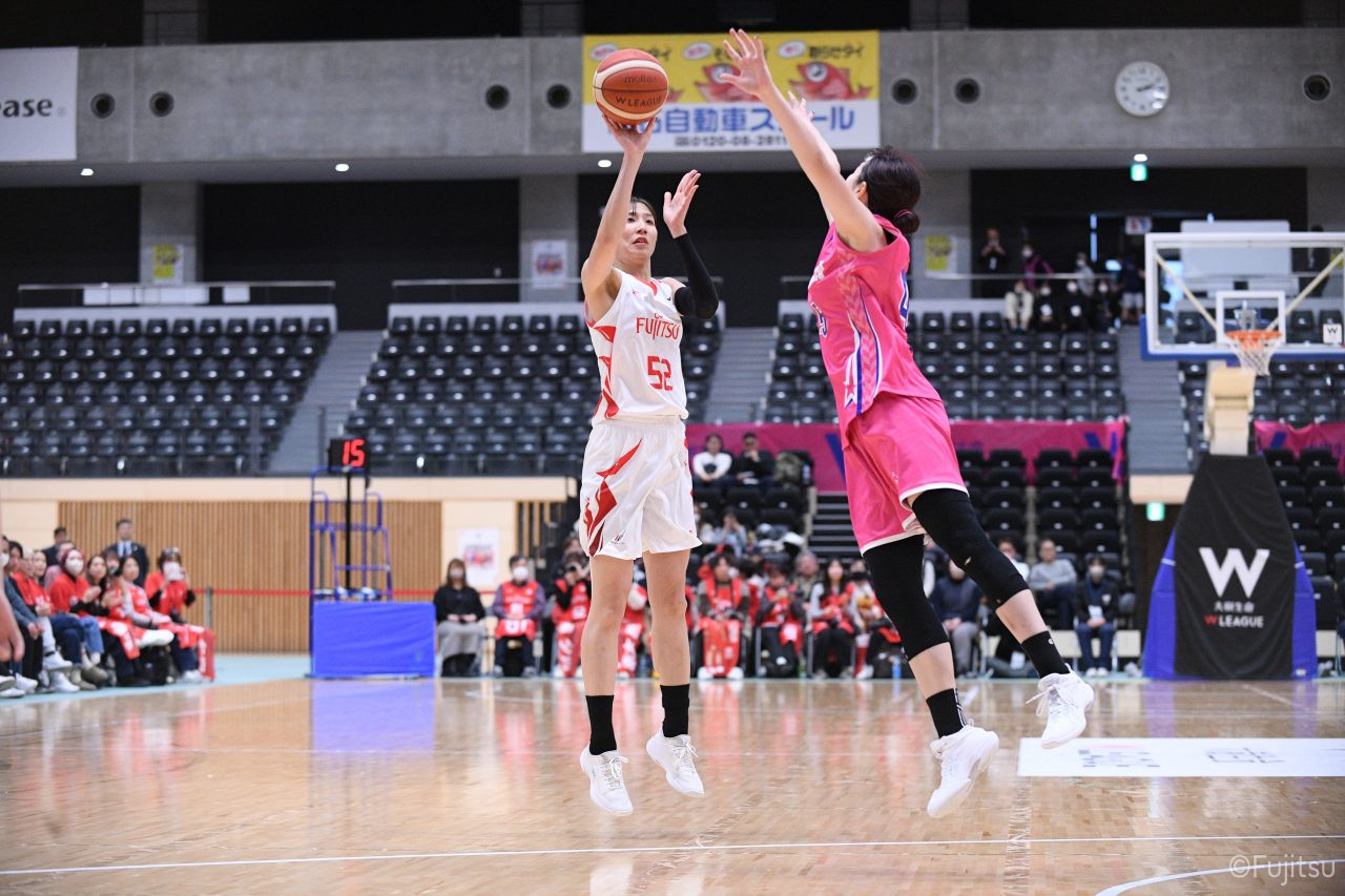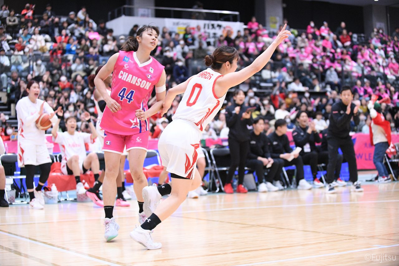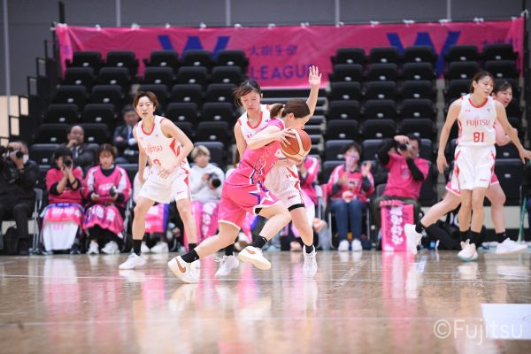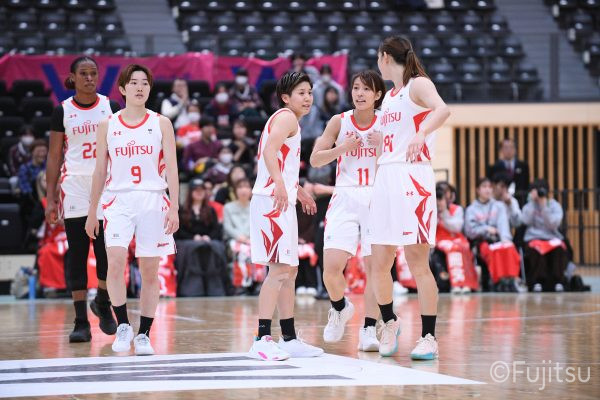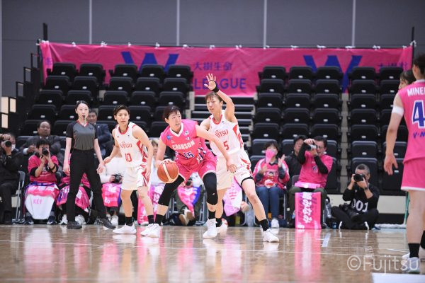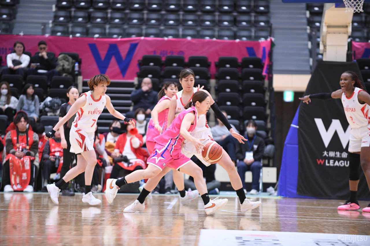 #9赤木のジャンプシュートを皮切りに、#81宮下のWリーグ通算2000得点目となるシュート、#9赤木と\0山田の高速コンビネーションで3連続得点。シャンソン化粧品にタイムアウトを取らせる。その後、両チームともに得点が伸びないなか、#18藤本がフリースローで続いて4連続得点に。ディフェンスは開始から約6分、失点をゼロに抑えていたが、そこから3ポイントシュートを含む3連続失点で2点差とされる。それでも粘り強くプレーし、終盤には#10町田がジャンプシュートを決め、最後は#11前澤が3ポイントシュート。32-27で前半を折り返す。