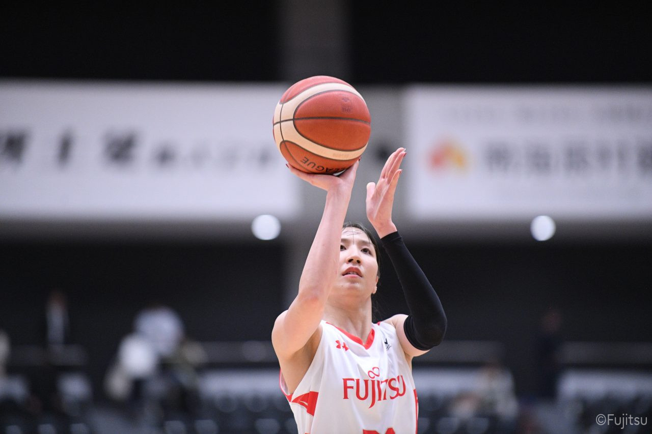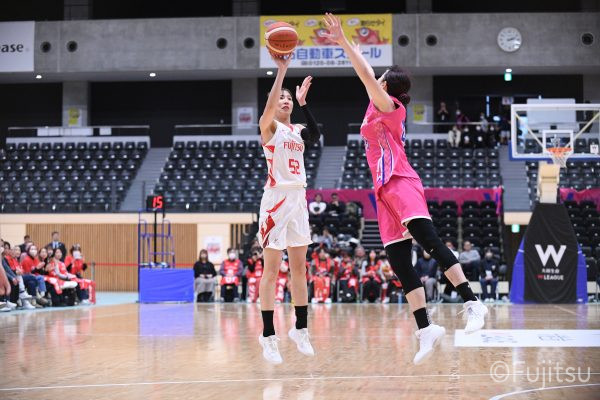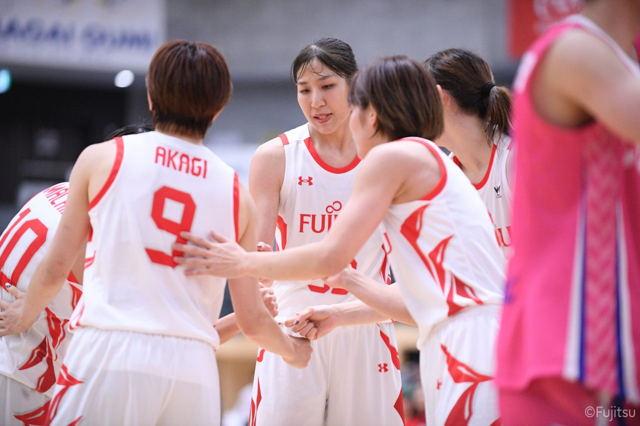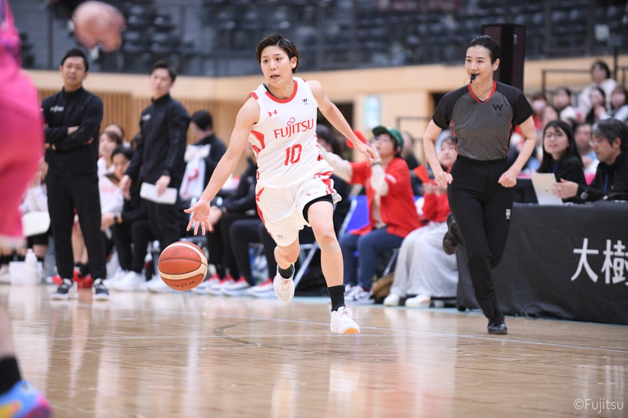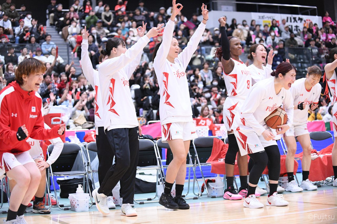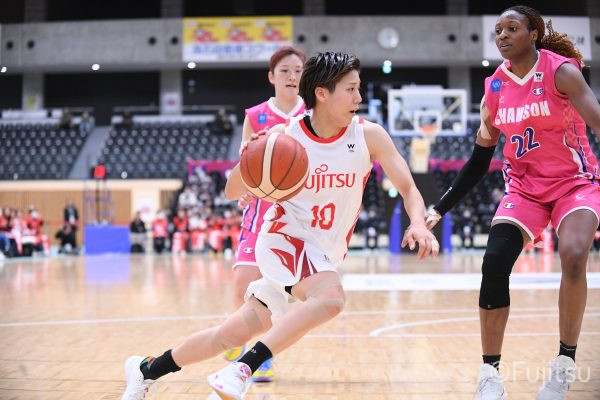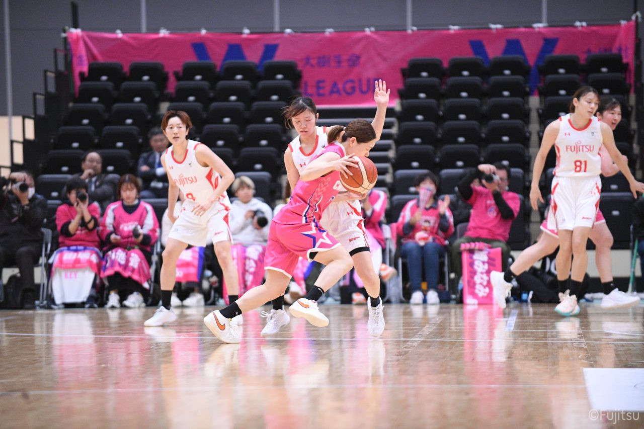 #9赤木のジャンプシュートを皮切りに、#81宮下のWリーグ通算2000得点目となるシュート、#9赤木と\0山田の高速コンビネーションで3連続得点。シャンソン化粧品にタイムアウトを取らせる。その後、両チームともに得点が伸びないなか、#18藤本がフリースローで続いて4連続得点に。ディフェンスは開始から約6分、失点をゼロに抑えていたが、そこから3ポイントシュートを含む3連続失点で2点差とされる。それでも粘り強くプレーし、終盤には#10町田がジャンプシュートを決め、最後は#11前澤が3ポイントシュート。32-27で前半を折り返す。