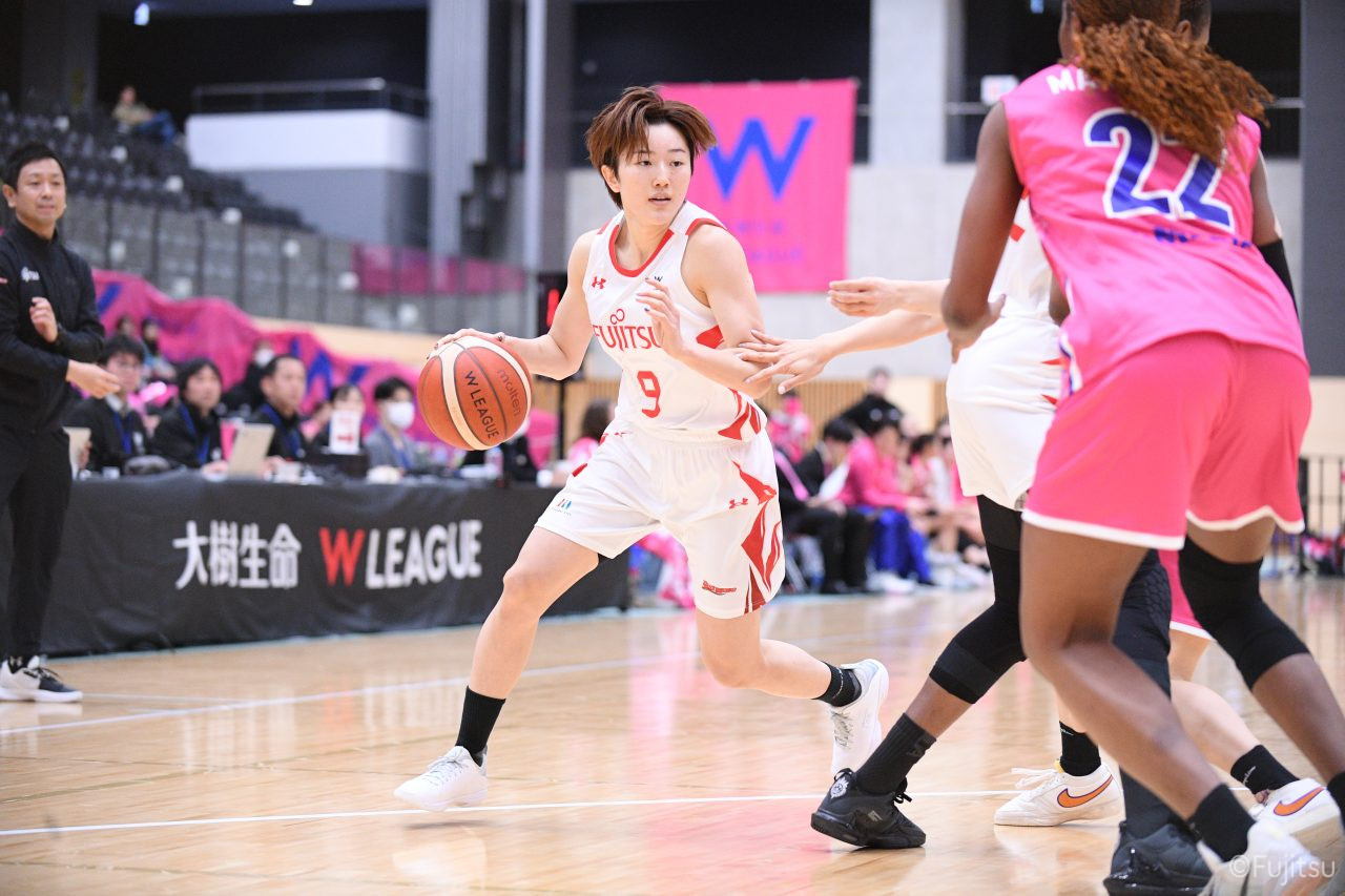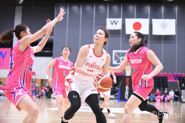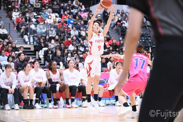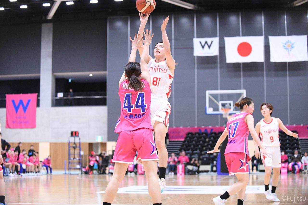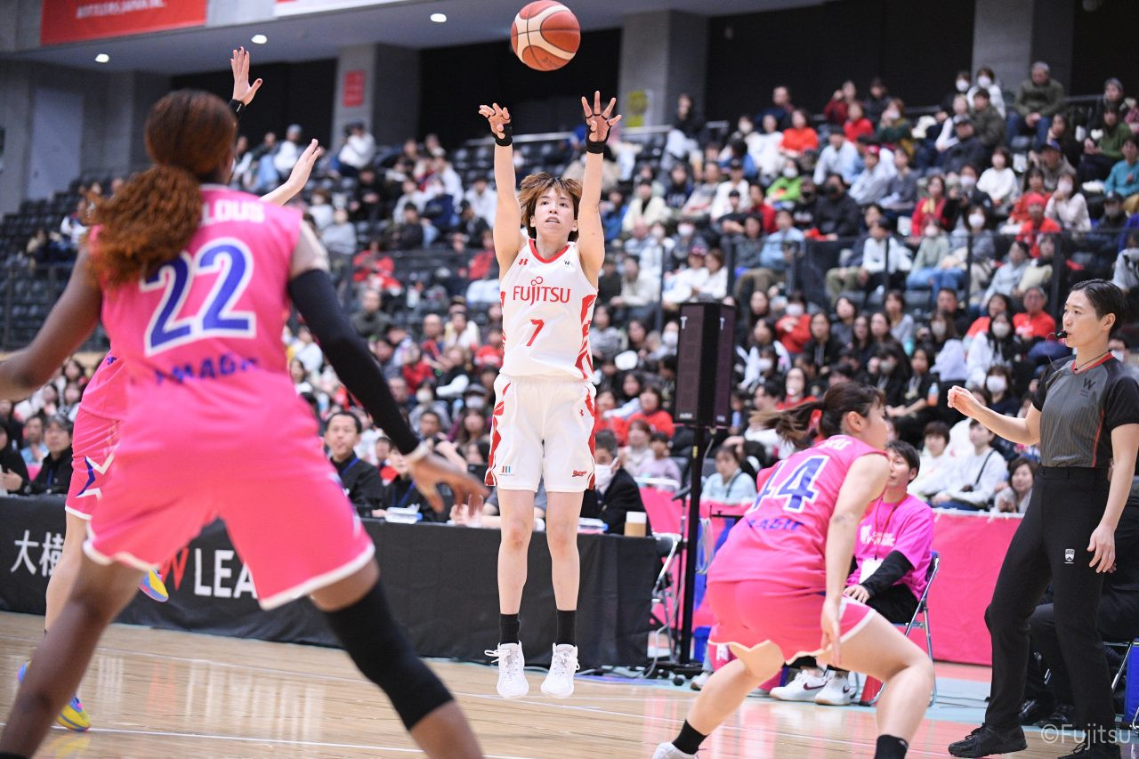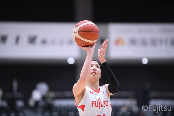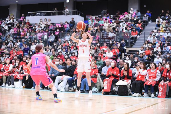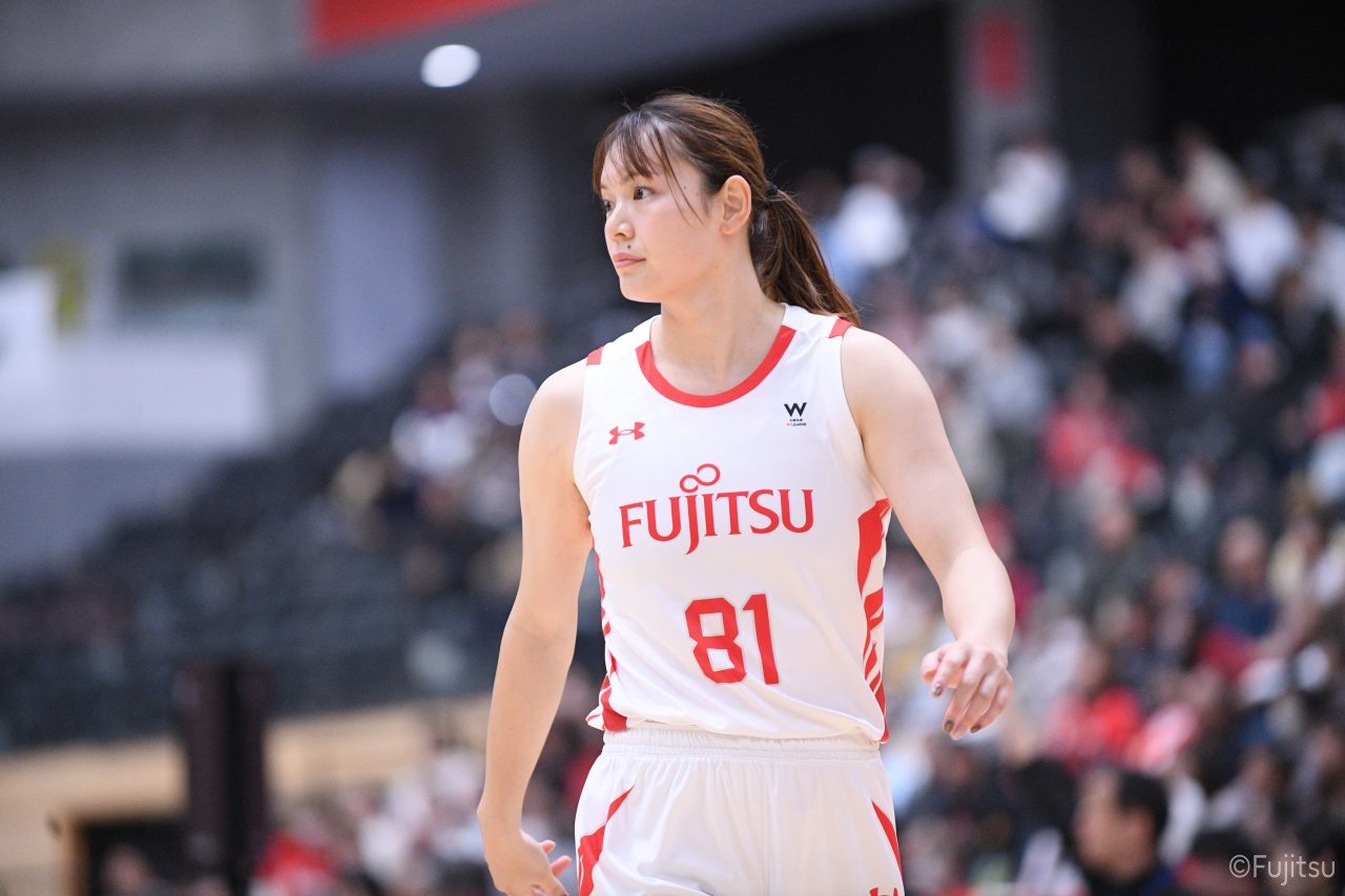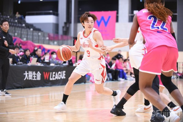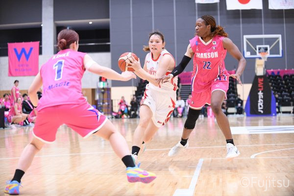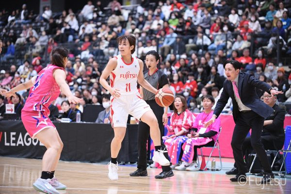 #9赤木のジャンプシュートを皮切りに、#81宮下のWリーグ通算2000得点目となるシュート、#9赤木と\0山田の高速コンビネーションで3連続得点。シャンソン化粧品にタイムアウトを取らせる。その後、両チームともに得点が伸びないなか、#18藤本がフリースローで続いて4連続得点に。ディフェンスは開始から約6分、失点をゼロに抑えていたが、そこから3ポイントシュートを含む3連続失点で2点差とされる。それでも粘り強くプレーし、終盤には#10町田がジャンプシュートを決め、最後は#11前澤が3ポイントシュート。32-27で前半を折り返す。