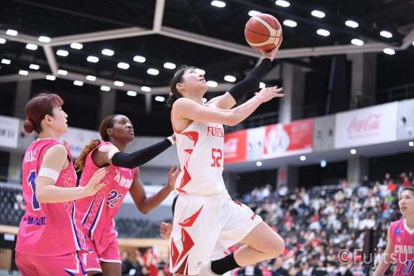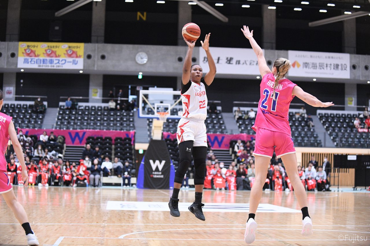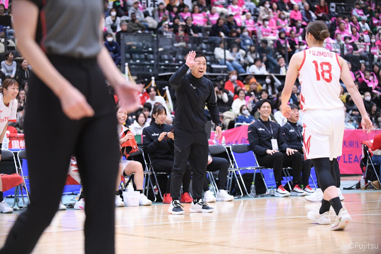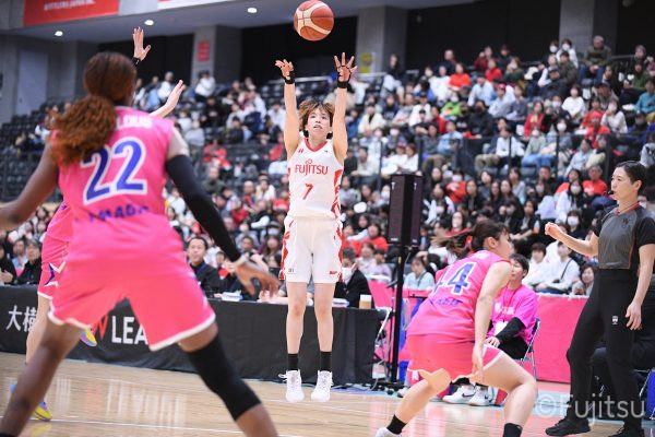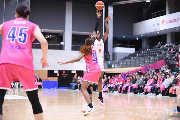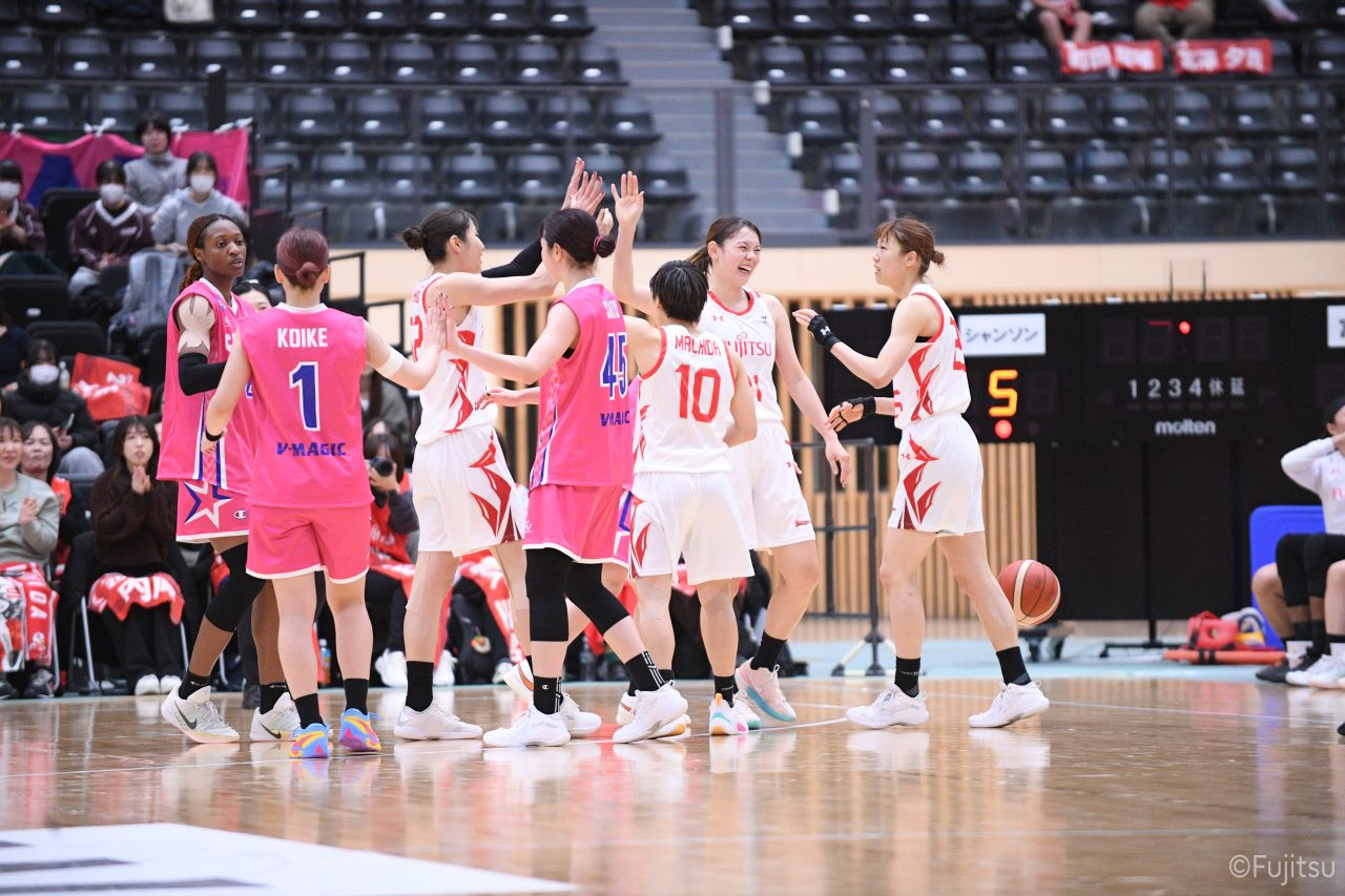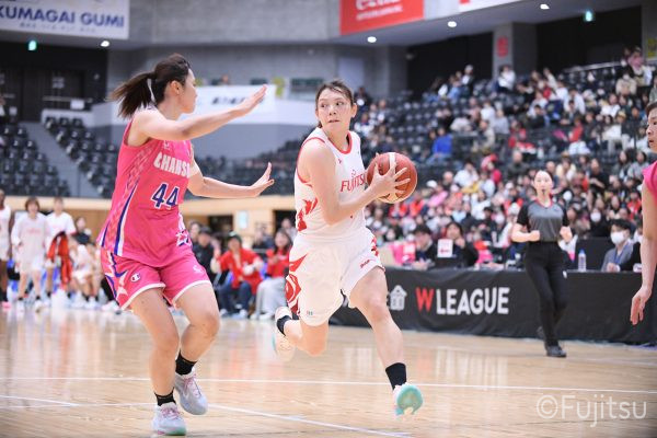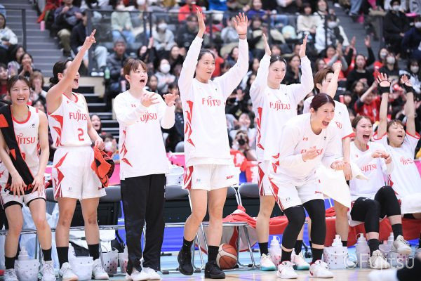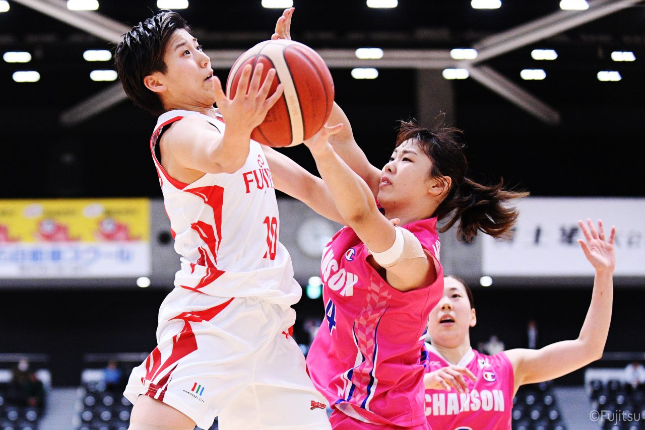 #9赤木のジャンプシュートを皮切りに、#81宮下のWリーグ通算2000得点目となるシュート、#9赤木と\0山田の高速コンビネーションで3連続得点。シャンソン化粧品にタイムアウトを取らせる。その後、両チームともに得点が伸びないなか、#18藤本がフリースローで続いて4連続得点に。ディフェンスは開始から約6分、失点をゼロに抑えていたが、そこから3ポイントシュートを含む3連続失点で2点差とされる。それでも粘り強くプレーし、終盤には#10町田がジャンプシュートを決め、最後は#11前澤が3ポイントシュート。32-27で前半を折り返す。