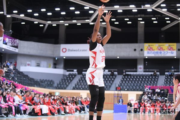 後半は3ポイントシュートで流れを作る。#52宮澤が連続で決めると、#7林(咲)も続いて、一気に突き放す。連続失点の後には#7林(咲)がこのQの2本目を、次の失点の後には#52宮澤が同じく3本目を沈めて、シャンソン化粧品にタイムアウトを取らせる。次の失点の後には#81宮下が3ポイントシュートで返す。終盤に入ると#22エブリンがジャンプシュートとゴール下のシュートを決めて、リードを広げる。残り2分をきってからは#81宮下が3度のフリースローをすべて決め、#11前澤も3ポイントシュートを沈めるなど.さらにリードを広げる。最後は連続失点をしたものの、63-48で第3Qを終える。