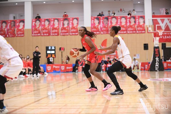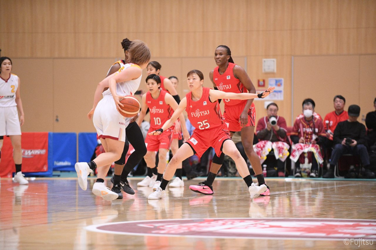 ホーム・川崎にトヨタ紡織を迎えたシリーズ第3戦。レッドウェーブのスタメンは#7林(咲)、#8テミトペ、#10町田、#25内尾、#52宮澤。立ち上がりからリードを許してしまい、追いかける展開となる。しかしレッドウェーブは#52宮澤と#10町田が3ポイントシュートを交互に、それぞれ2本ずつ決めて、中盤で同点に追いつく。#25内尾のフリースローで抜け出し、さらに#7林(咲)から#22エブリンにつながるプレーも決まるが、終盤にまたもリードを奪われてしまう。最後も#22エブリンのシュートが決まった後に連続失点。17-23で第1Qを終える。