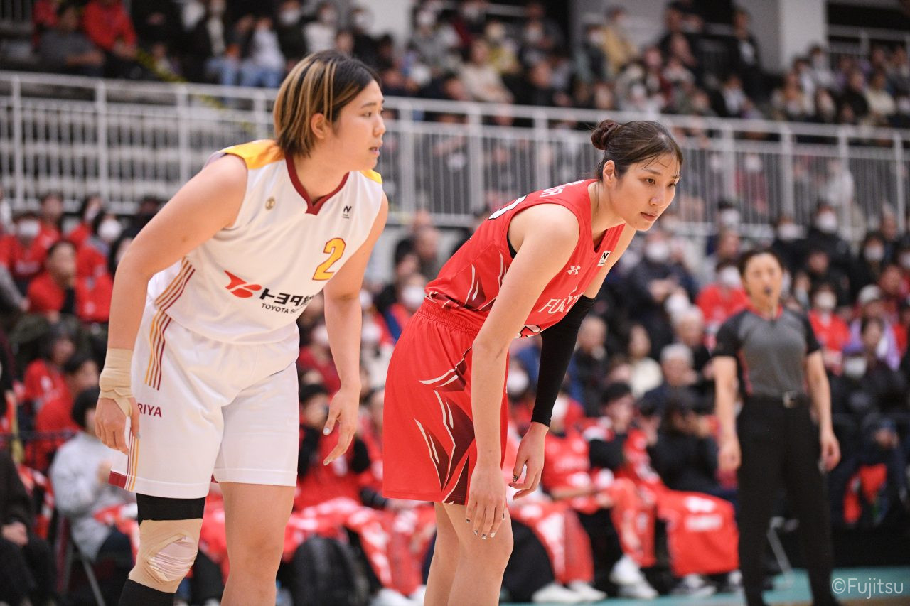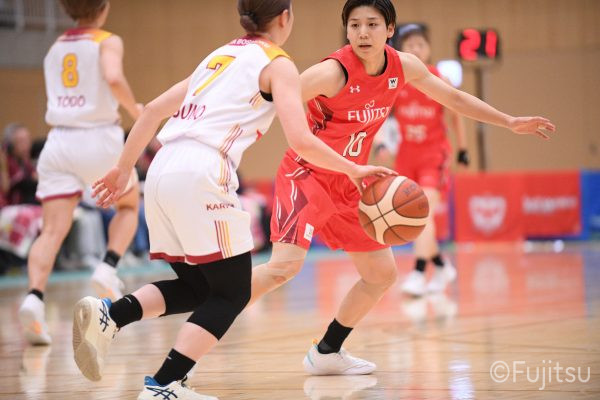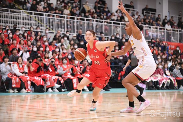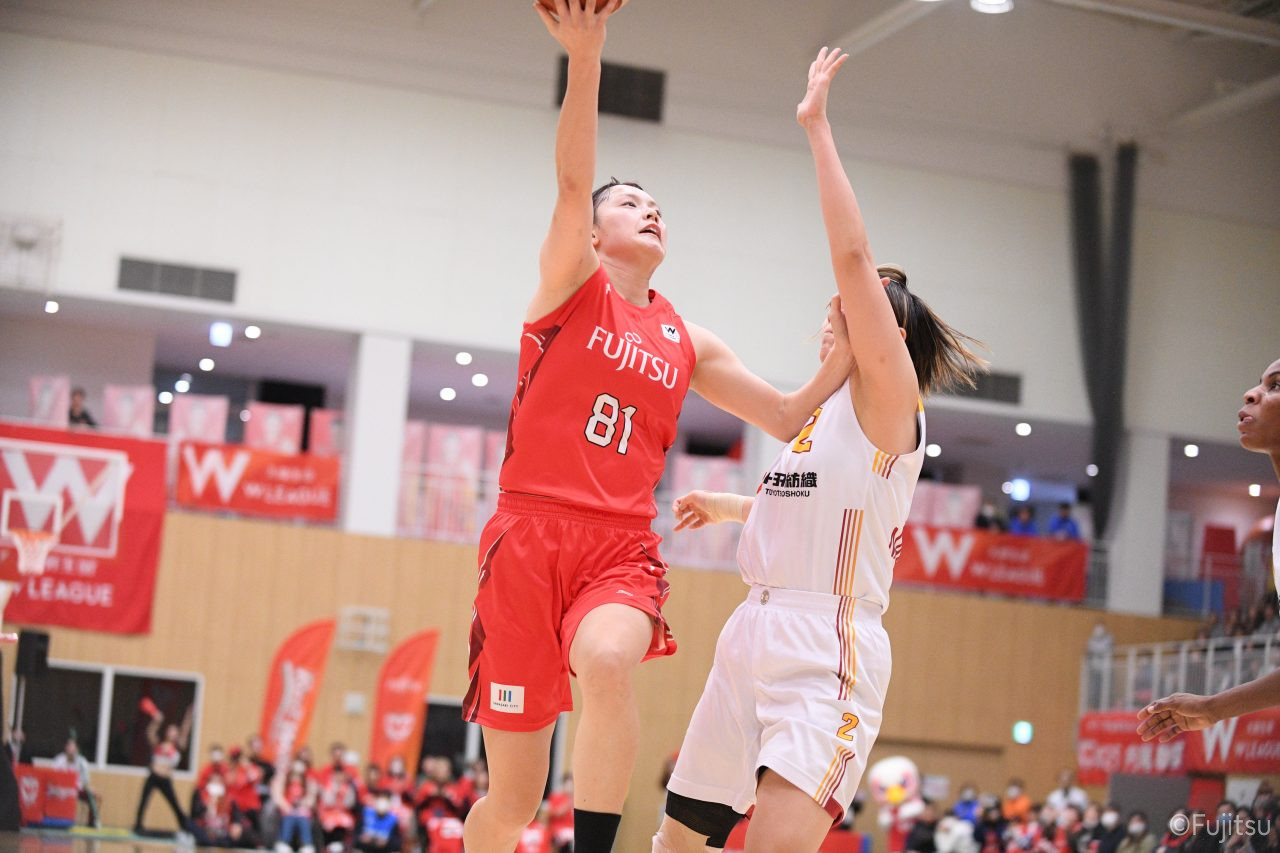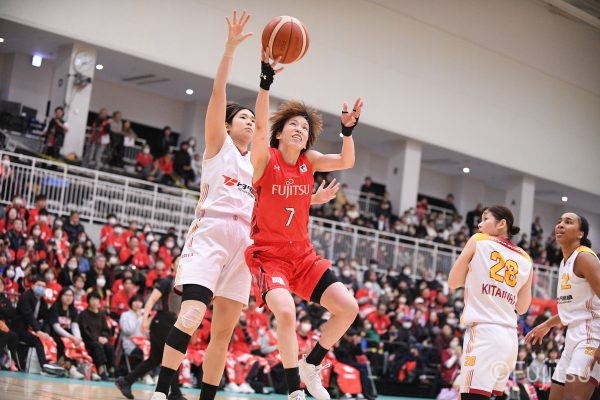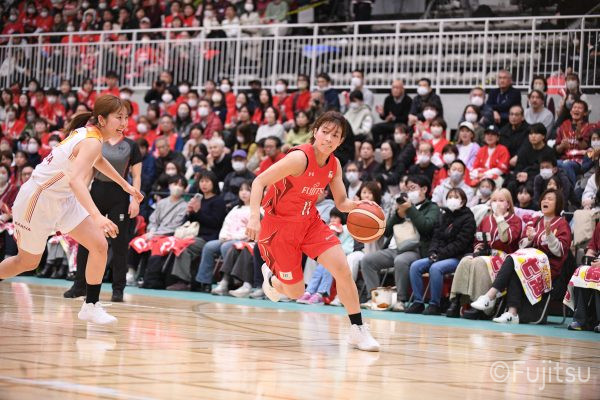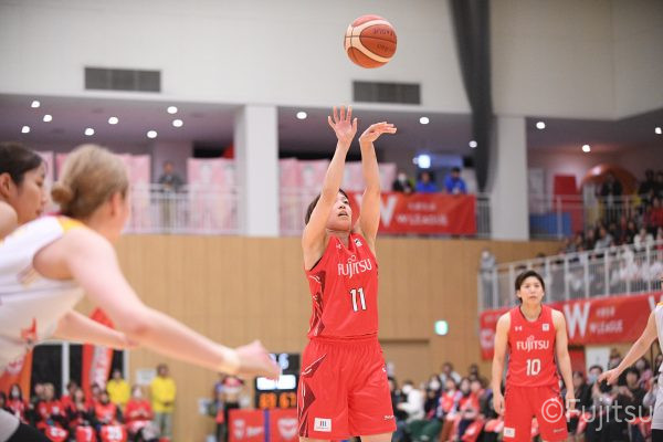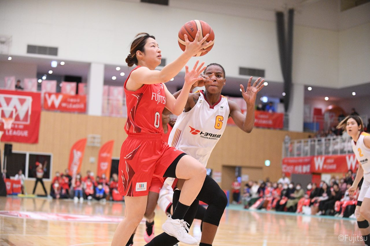 #22エブリンのアシストから#0山田が3ポイントシュートを沈めて、第2Qをスタートさせる。連続失点でビハインドは広がるが、#10町田が1対1と3ポイントシュートで返して、トヨタ紡織にタイムアウトを取らせる。その後、1点差に詰め寄るものの、2本の3ポイントシュートを決められて我慢の展開は続く。それでも終盤に#7林(咲)のドライブと#52宮澤のフリースロー、#22エブリンから#11前澤につながる速攻で再び1点差に詰め寄る。最後は#11前澤がフリースローを決め、ディフェンスでも守りきって、33-33で前半を折り返す。