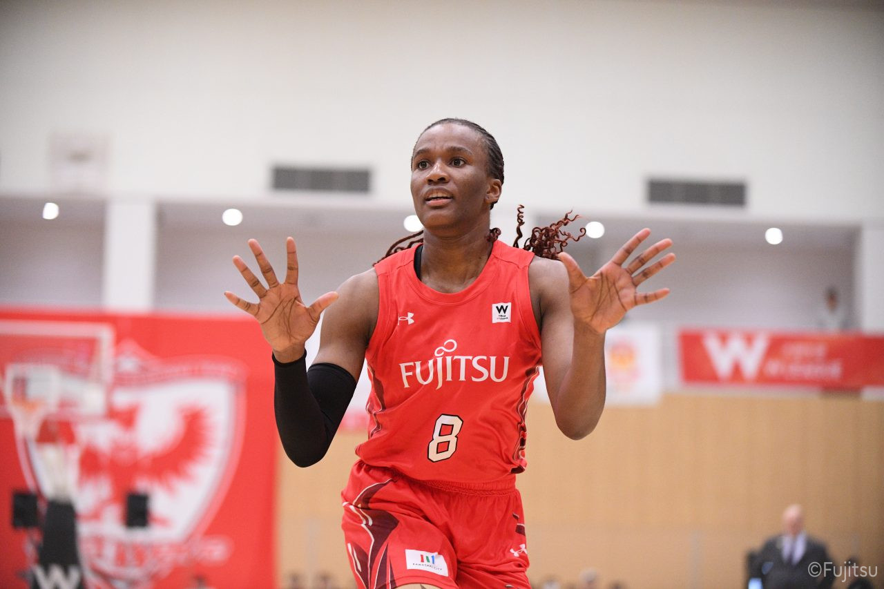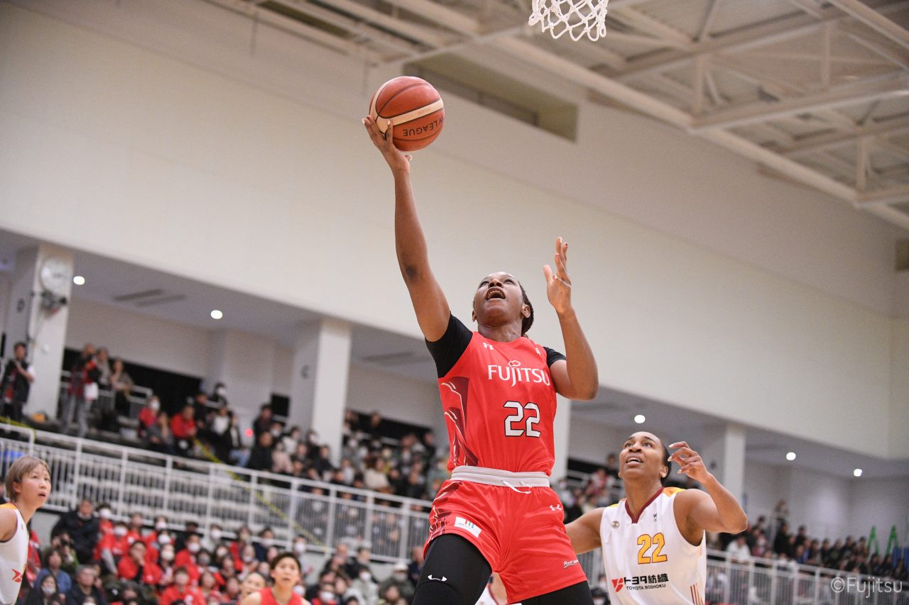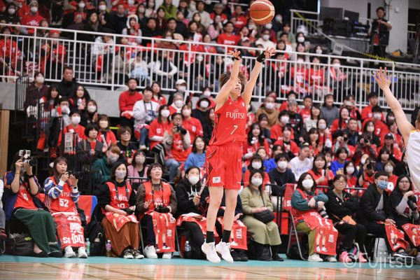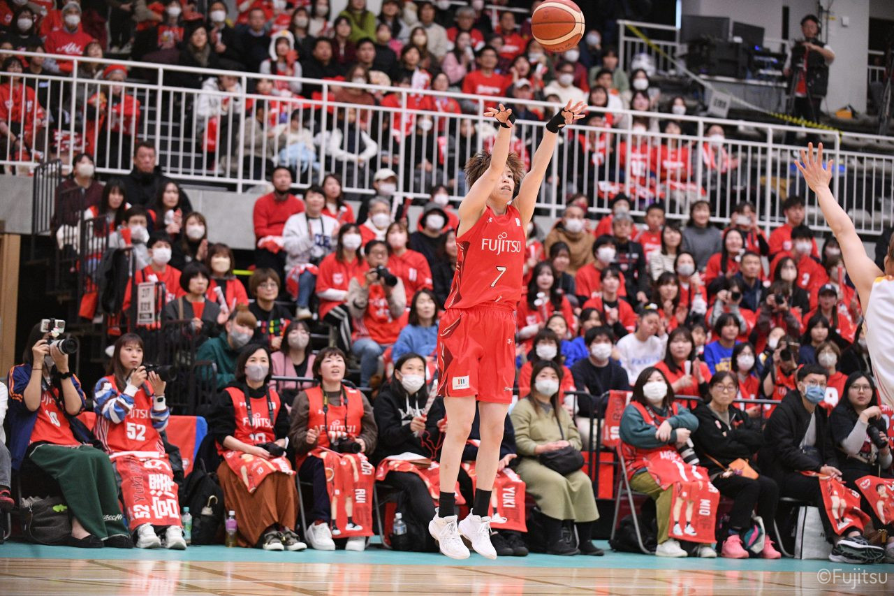 #22エブリンのアシストから#0山田が3ポイントシュートを沈めて、第2Qをスタートさせる。連続失点でビハインドは広がるが、#10町田が1対1と3ポイントシュートで返して、トヨタ紡織にタイムアウトを取らせる。その後、1点差に詰め寄るものの、2本の3ポイントシュートを決められて我慢の展開は続く。それでも終盤に#7林(咲)のドライブと#52宮澤のフリースロー、#22エブリンから#11前澤につながる速攻で再び1点差に詰め寄る。最後は#11前澤がフリースローを決め、ディフェンスでも守りきって、33-33で前半を折り返す。