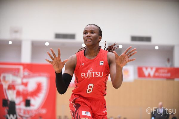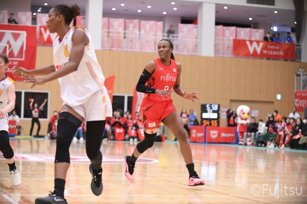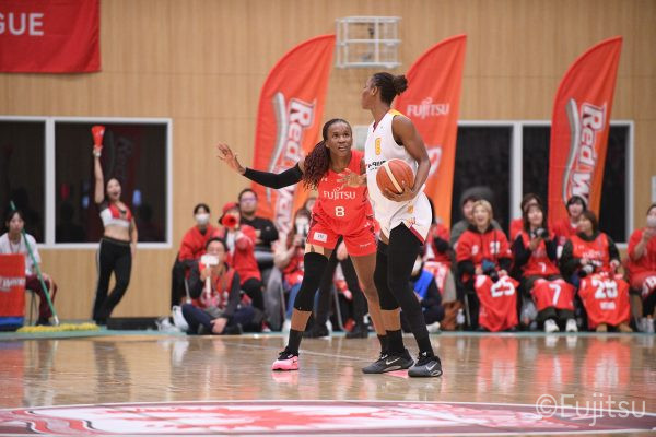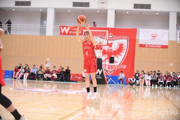 後半も立ち上がりから3連続失点。すぐにタイムアウトを取る。するとレッドウェーブらしいボールムーブから#25内尾がドライブを決め、さらに#52宮澤から#8テミトペにつながるプレーと、#25内尾の速攻で点差を縮めていく。しかしそこから4連続失点で12点差をつけられてしまう。終盤、#22エブリンがバスケットカウントによる3点プレーを決めると、#81宮下から#18藤本につながるプレー、#11前澤のドライブも決まって、追い上げていく。しかし最後はフリースローを決められて46-55で第3Qを終える。