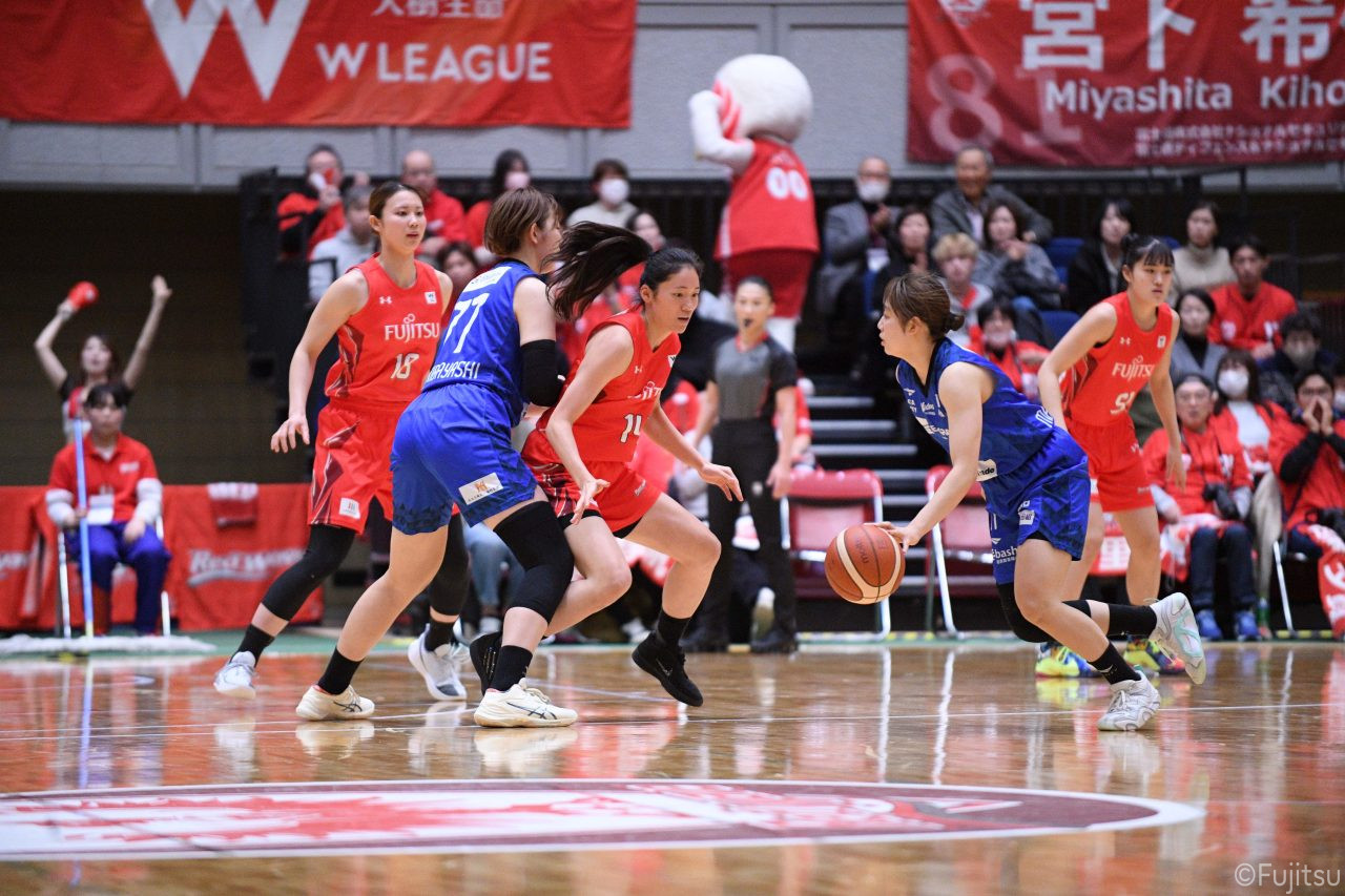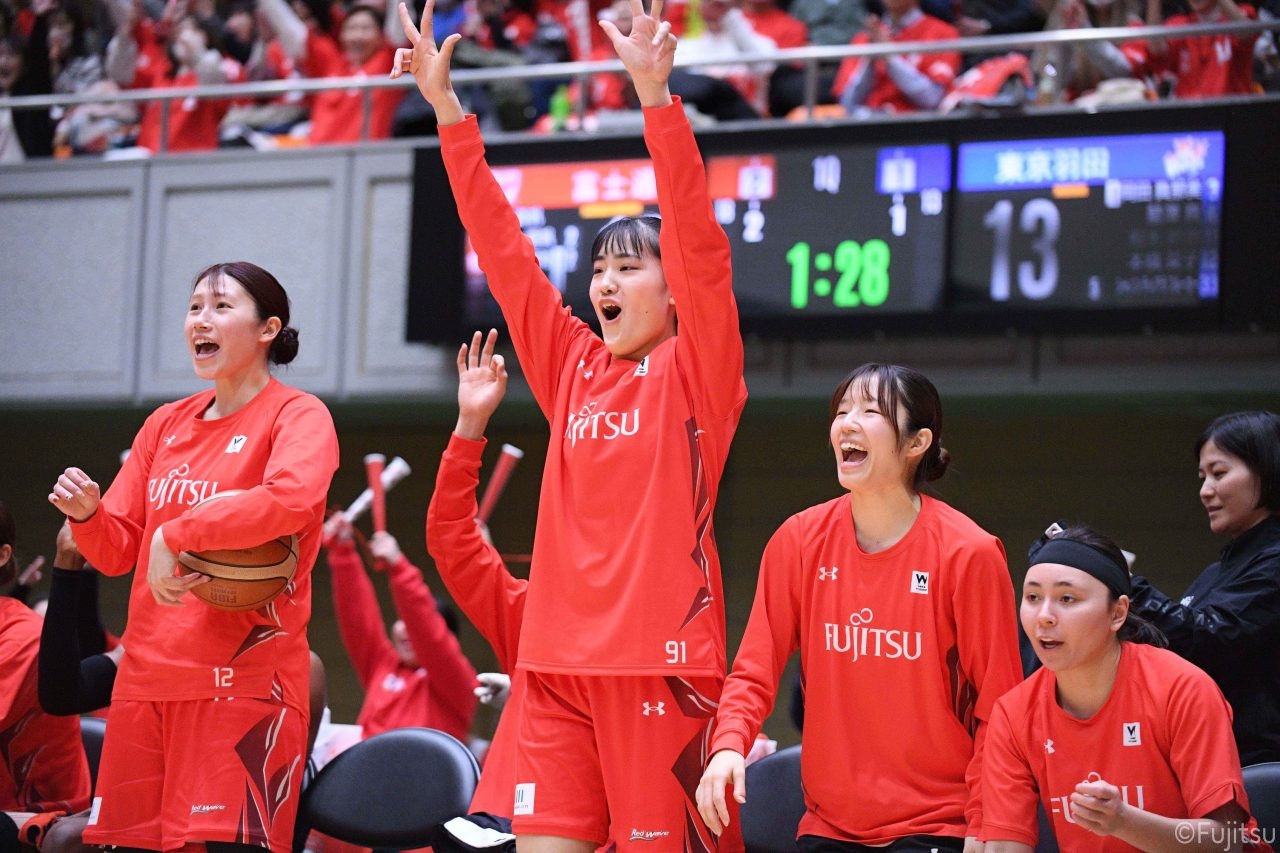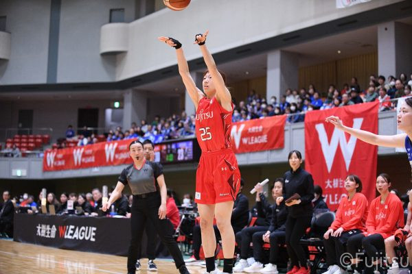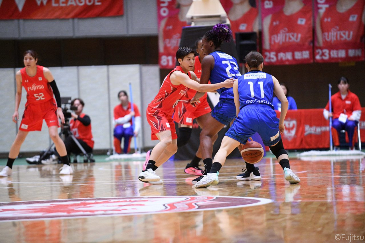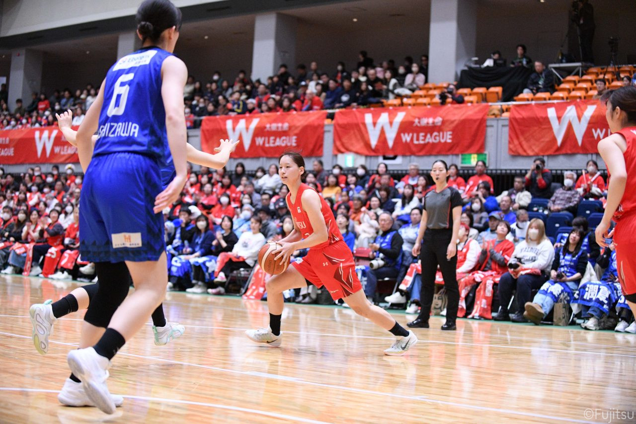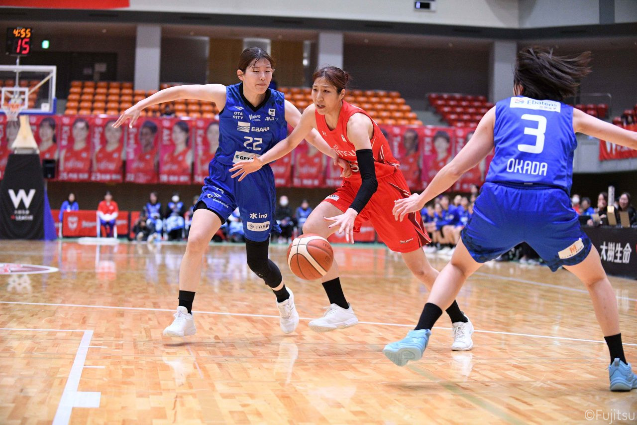 Wリーグ・レギュラーシーズン再開のゲームは平塚で東京羽田と対戦。スタメンは#7林(咲)、#8テミトペ、#10町田、#25内尾、#52宮澤。#7林(咲)のジャンプシュートで先制すると、#8テミトペが続く。東京羽田に粘り強くついて来られるが、#10町田のジャンプシュートや、#7林(咲)と#52宮澤の3ポイントシュートなどでリードを少しずつ広げる。さらに#25内尾の合わせや、#9赤木のジャンプシュートも決まって、東京羽田にタイムアウトを取らせる。終盤、失点するシーンもあったが、#2林(真)の3ポイントシュートと、#81宮下から#22エブリンにつながるプレーで得点し、23-15で第1Qを終える。