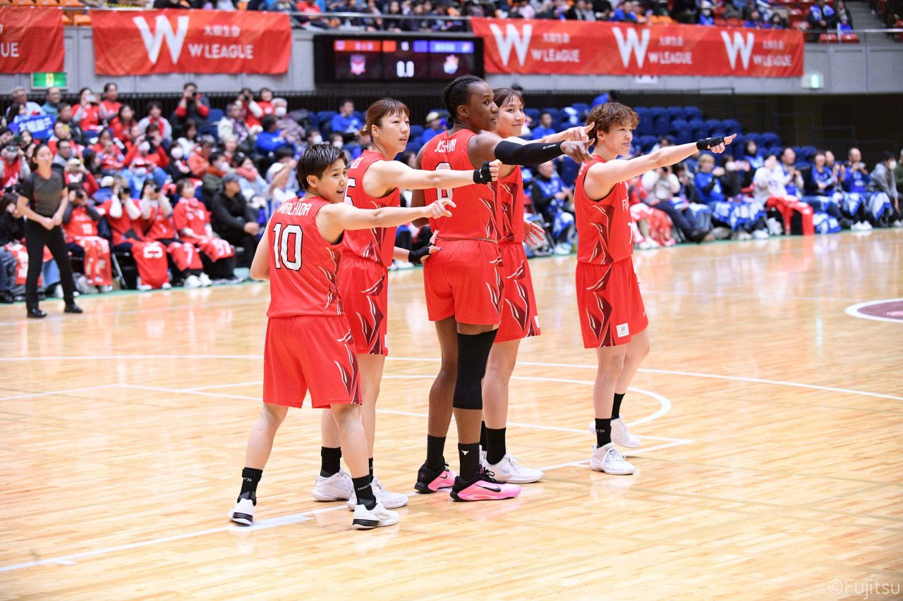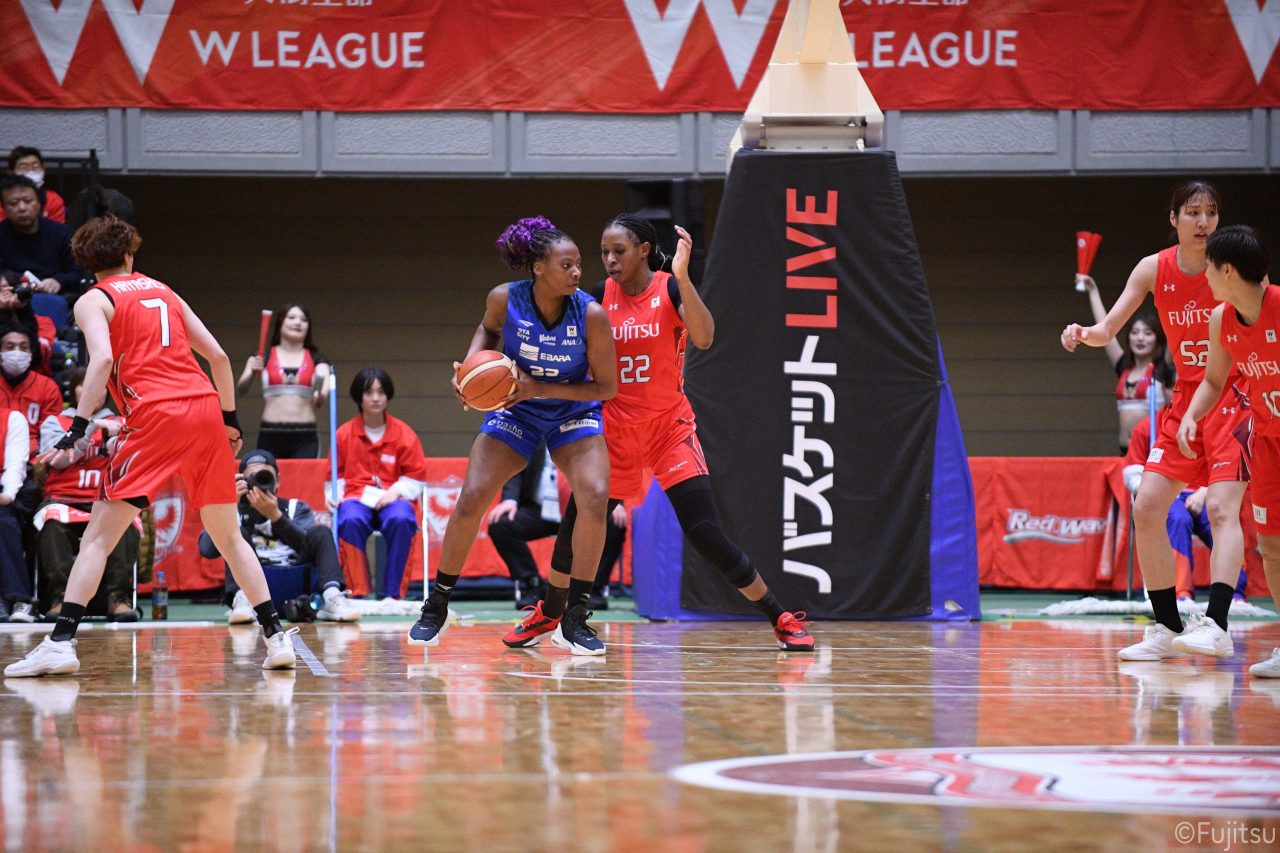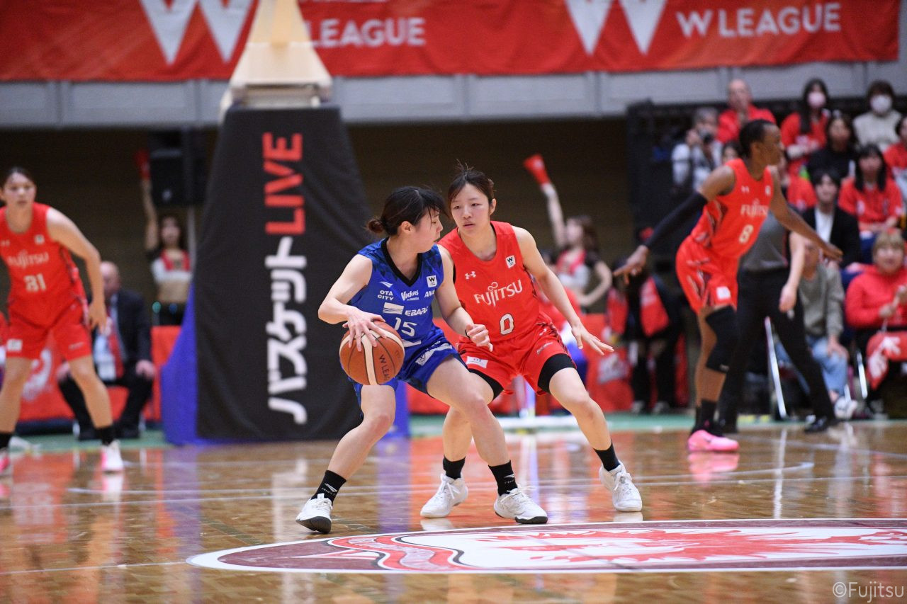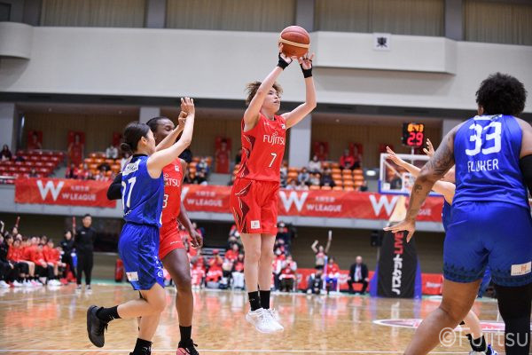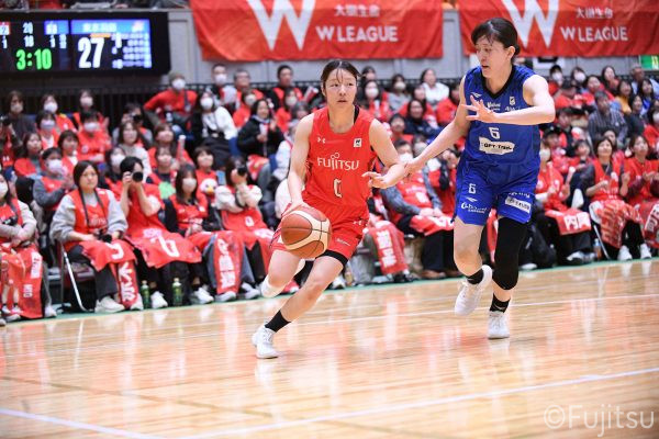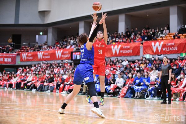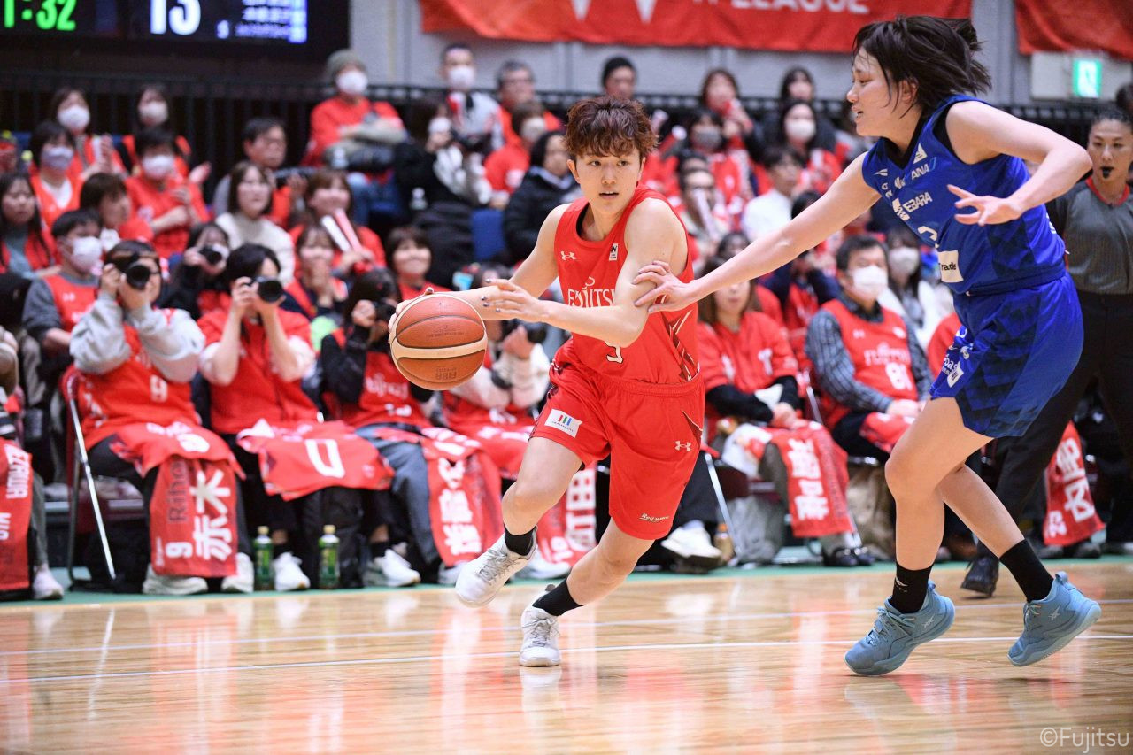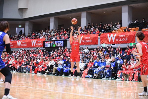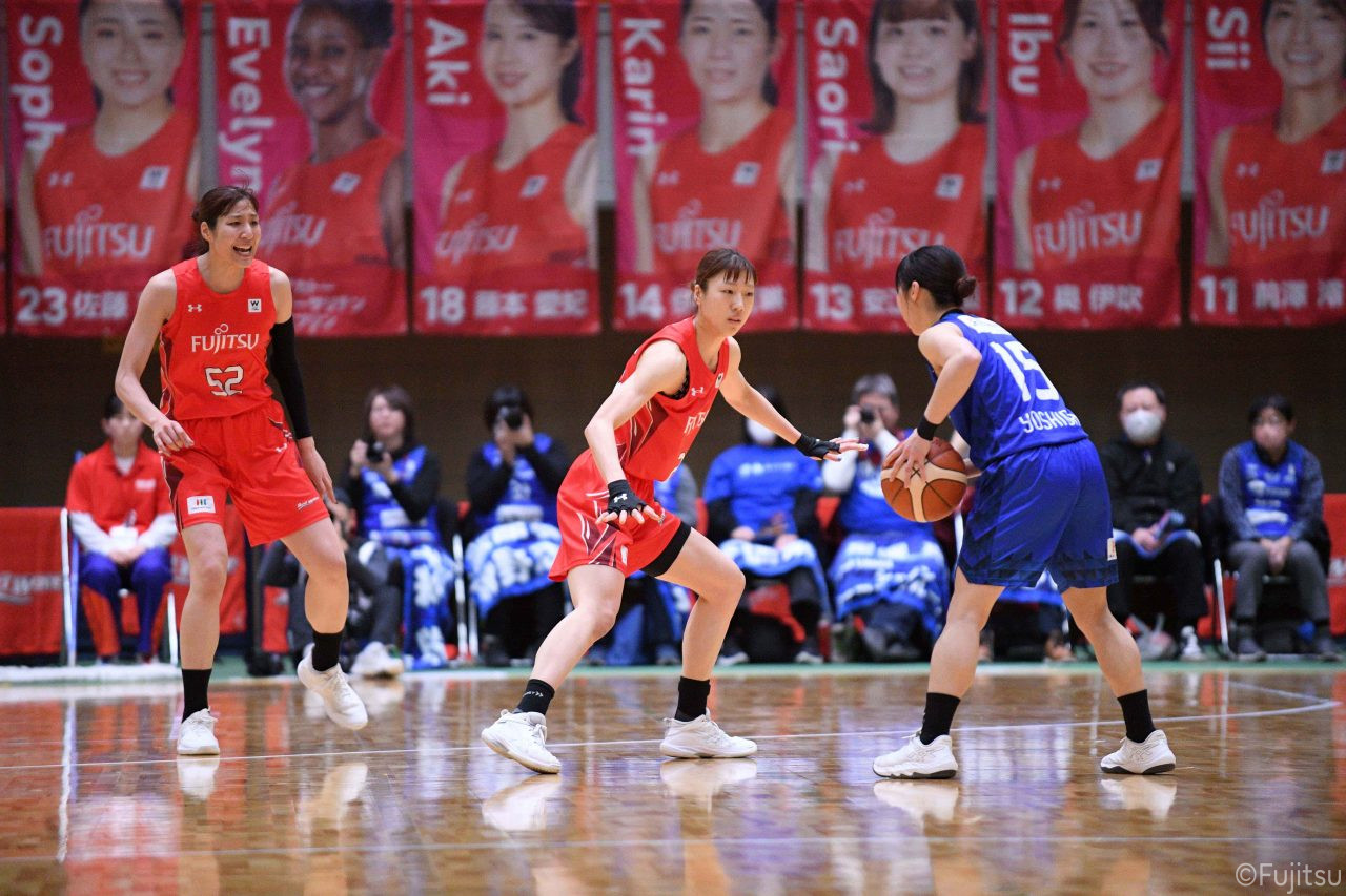 Wリーグ・レギュラーシーズン再開のゲームは平塚で東京羽田と対戦。スタメンは#7林(咲)、#8テミトペ、#10町田、#25内尾、#52宮澤。#7林(咲)のジャンプシュートで先制すると、#8テミトペが続く。東京羽田に粘り強くついて来られるが、#10町田のジャンプシュートや、#7林(咲)と#52宮澤の3ポイントシュートなどでリードを少しずつ広げる。さらに#25内尾の合わせや、#9赤木のジャンプシュートも決まって、東京羽田にタイムアウトを取らせる。終盤、失点するシーンもあったが、#2林(真)の3ポイントシュートと、#81宮下から#22エブリンにつながるプレーで得点し、23-15で第1Qを終える。