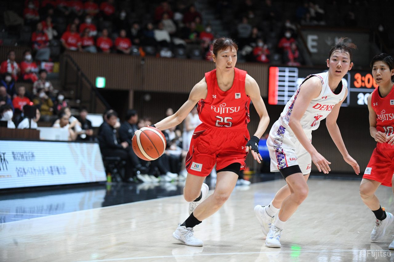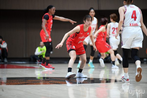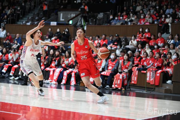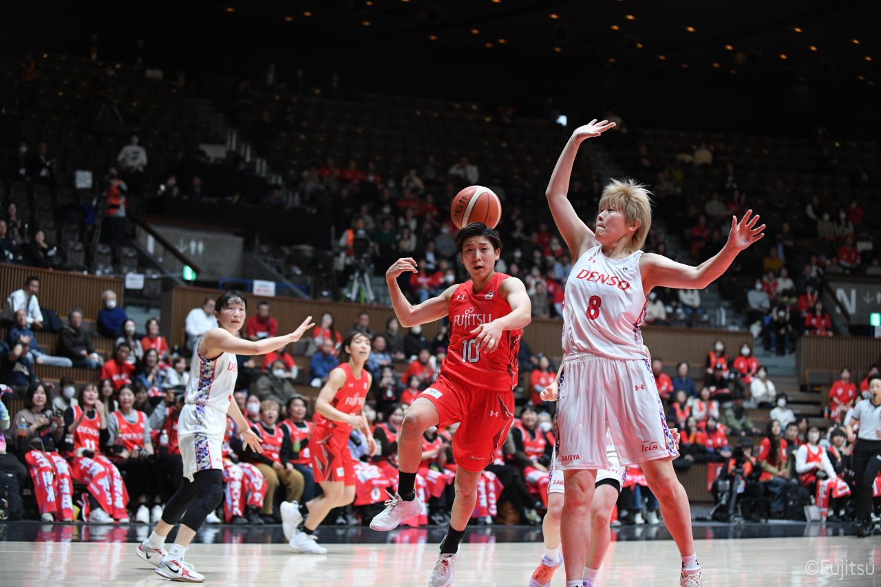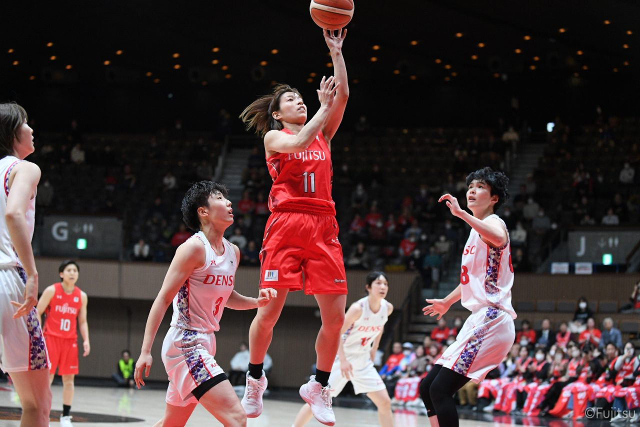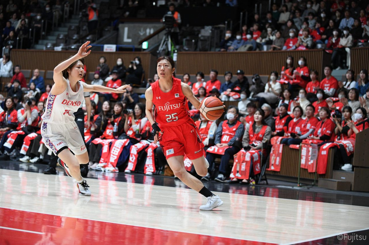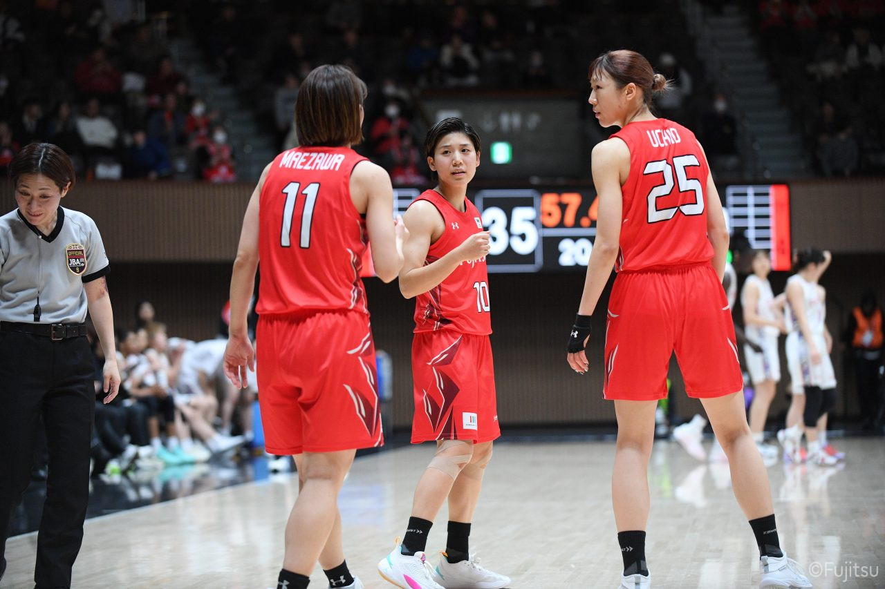皇后杯のセミファイナルは5年連続でデンソーと対戦。レッドウェーブのスタメンは#7林(咲)、#8テミトペ、#10町田、#25内尾、#52宮澤。#25内尾のフリースローでゲームを動かすと、#10町田から#8テミトペにつながるコンビネーションで続く。その後も#52宮澤の3ポイントシュートや#11前澤のドライブ、#10町田の3ポイントシュートなどで得点を重ねていく。終盤には#0山田から#22エブリンにつながるプレーが連続で決まり、最後も#22エブリンがフリースローを決めて、19-15で第1Qを終える。