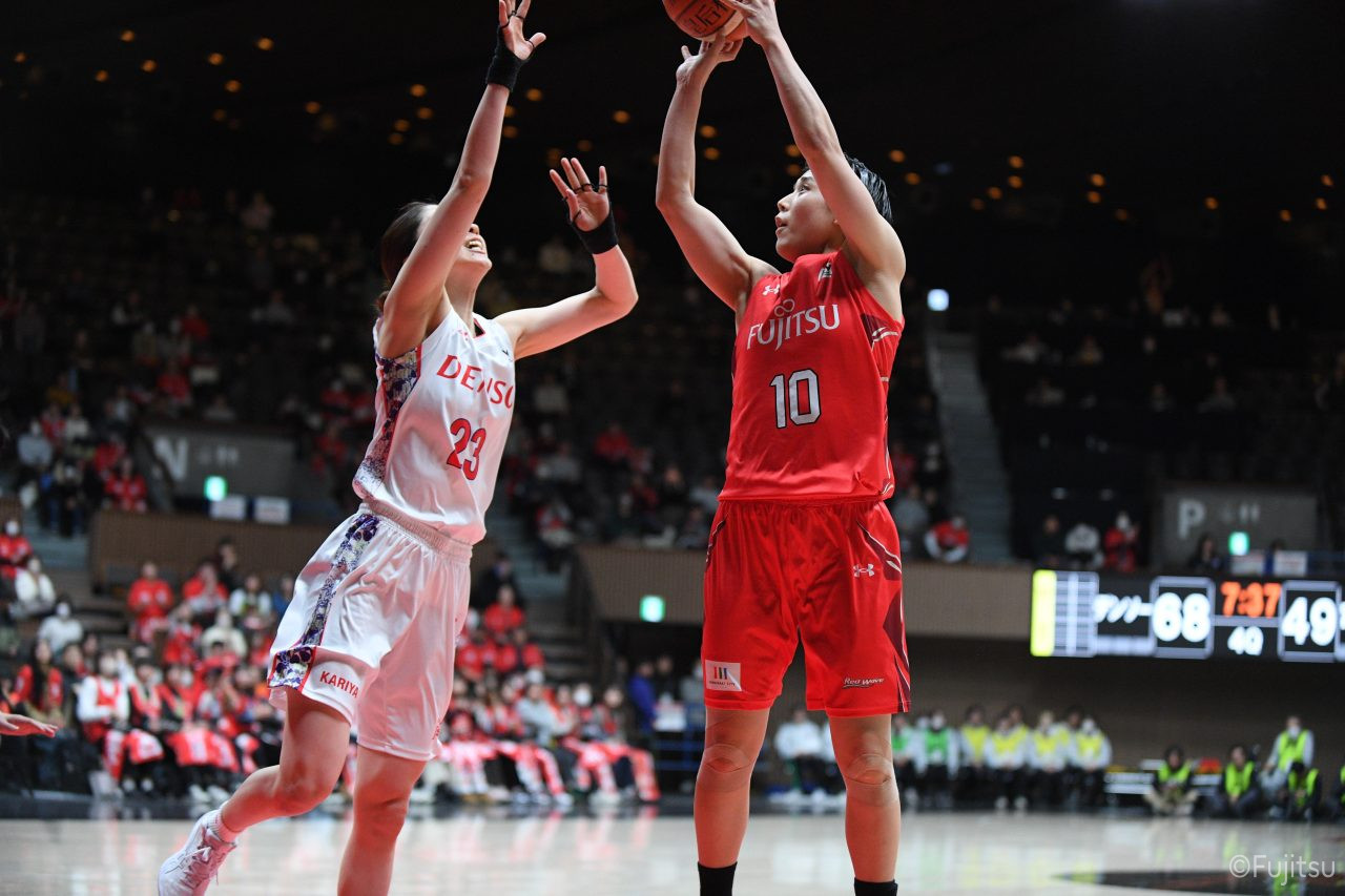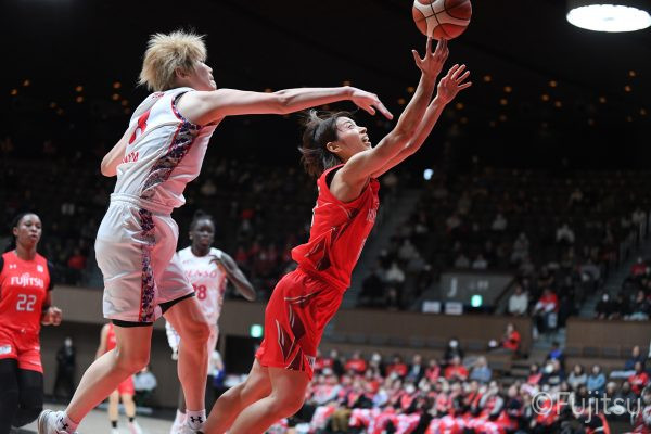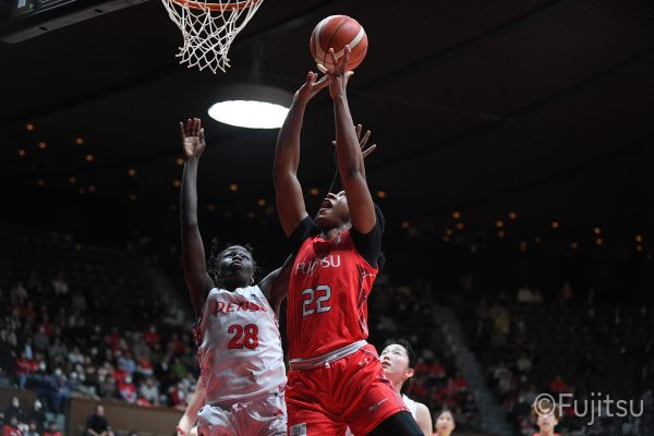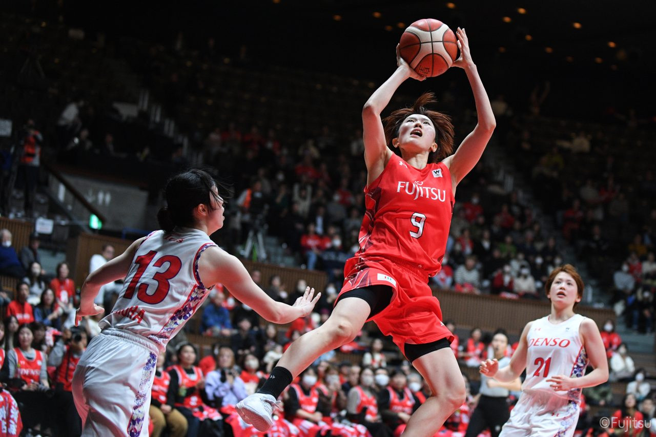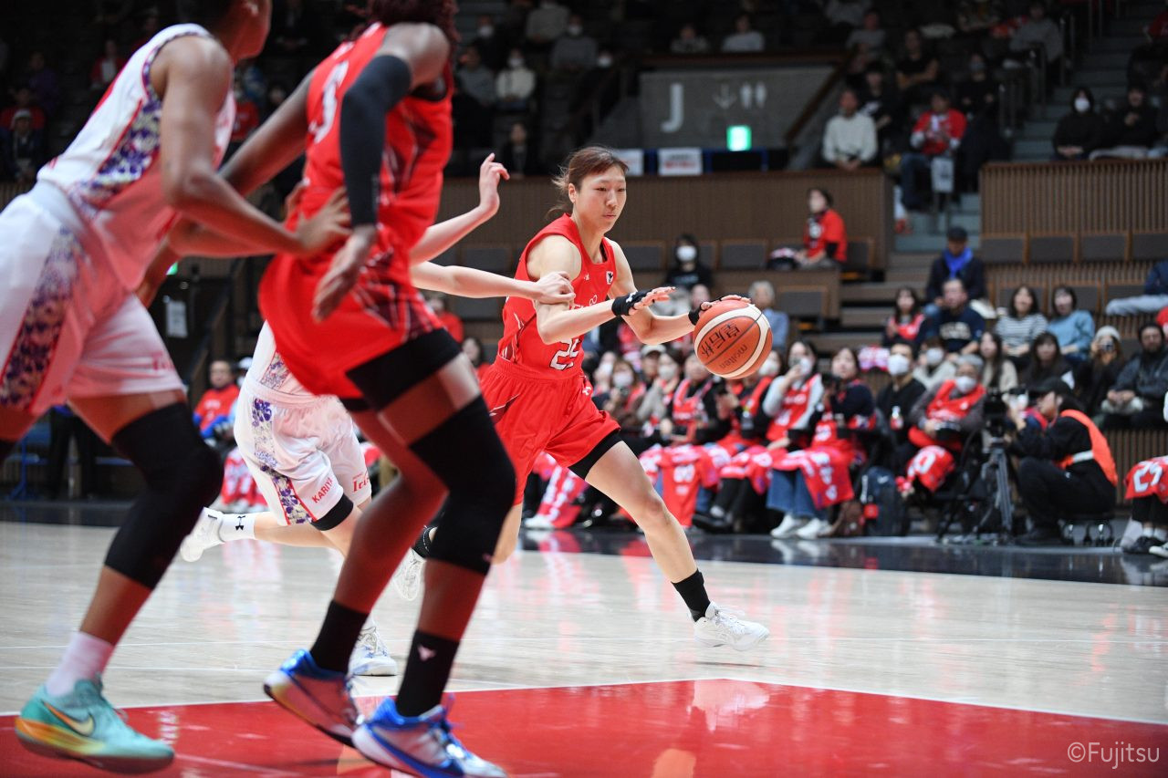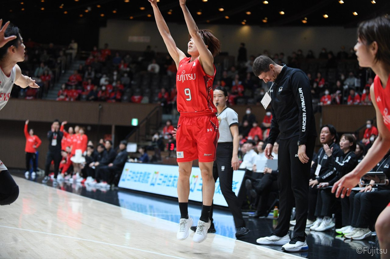 皇后杯のセミファイナルは5年連続でデンソーと対戦。レッドウェーブのスタメンは#7林(咲)、#8テミトペ、#10町田、#25内尾、#52宮澤。#25内尾のフリースローでゲームを動かすと、#10町田から#8テミトペにつながるコンビネーションで続く。その後も#52宮澤の3ポイントシュートや#11前澤のドライブ、#10町田の3ポイントシュートなどで得点を重ねていく。終盤には#0山田から#22エブリンにつながるプレーが連続で決まり、最後も#22エブリンがフリースローを決めて、19-15で第1Qを終える。