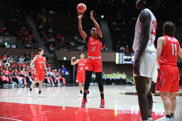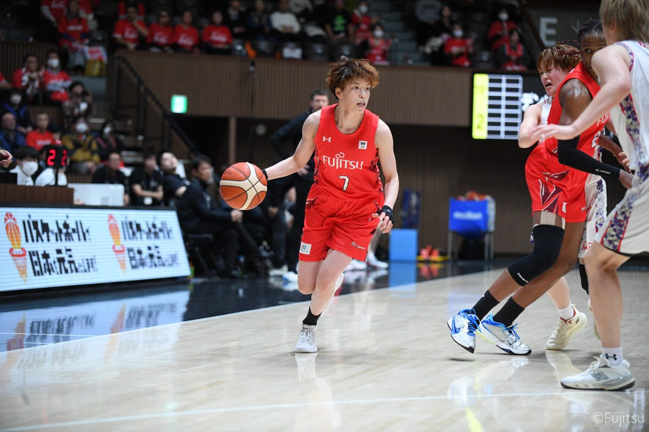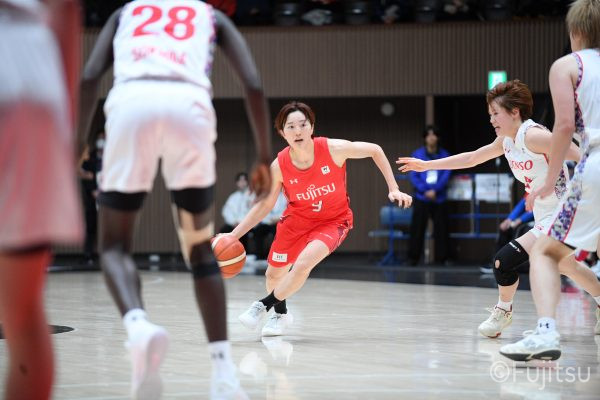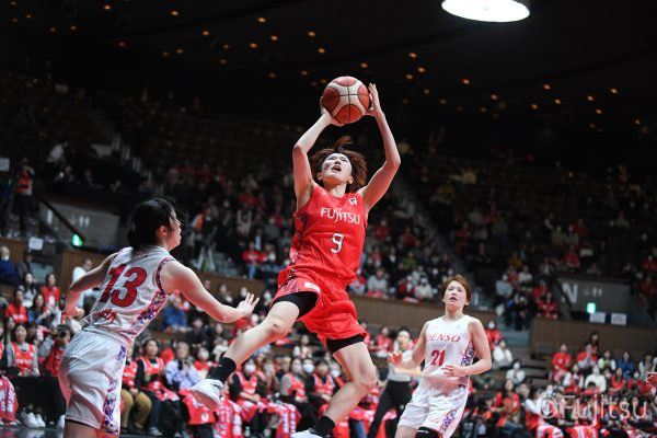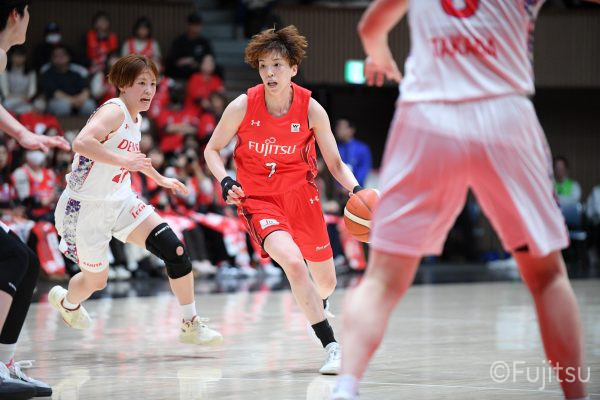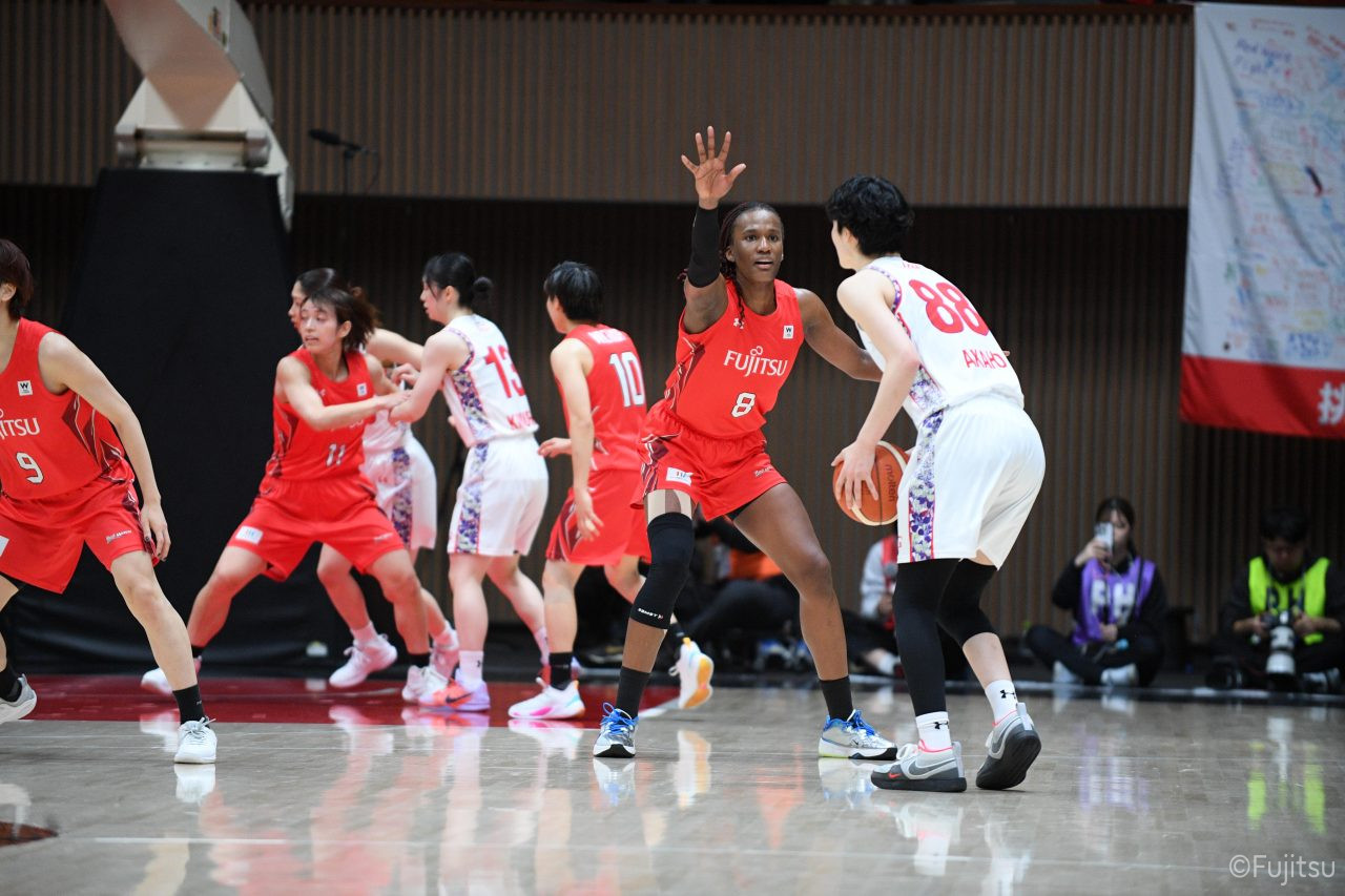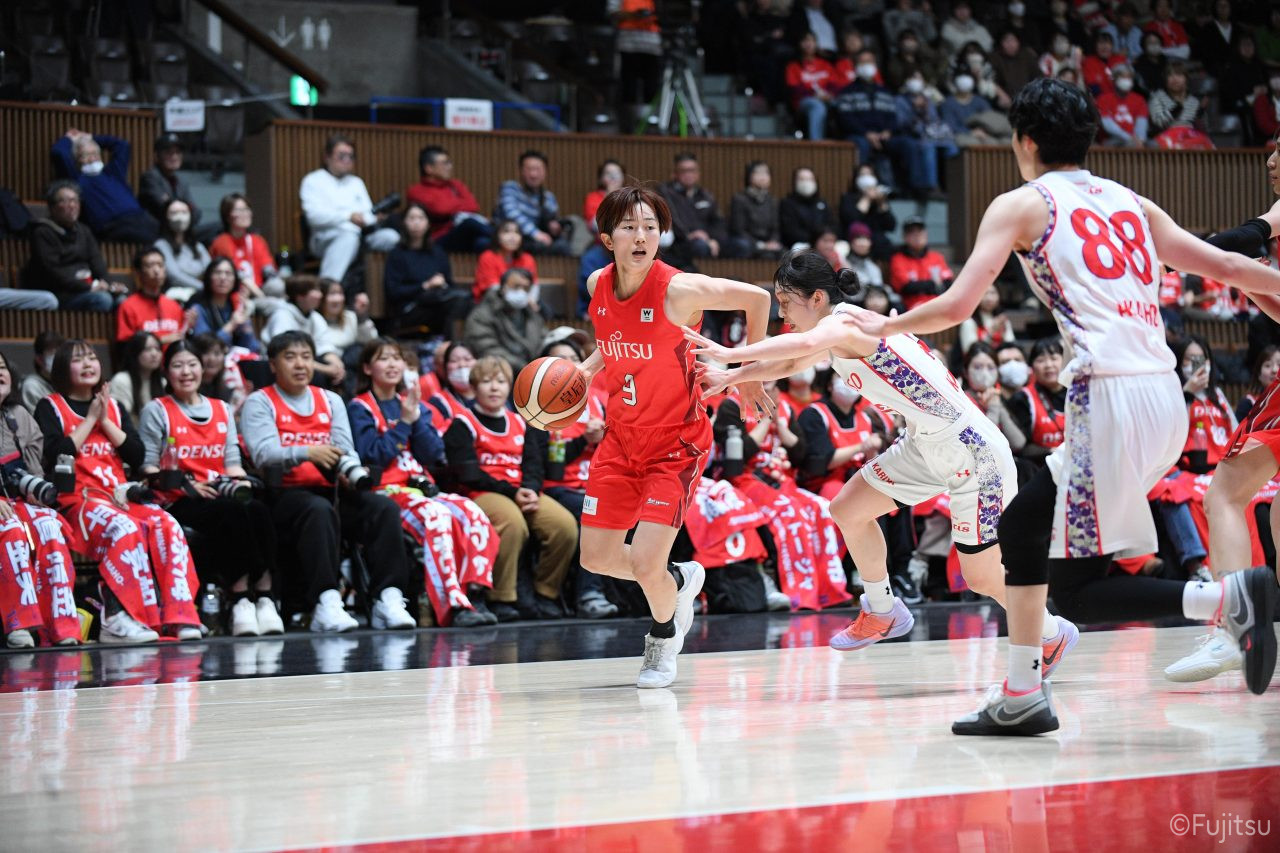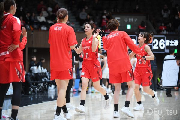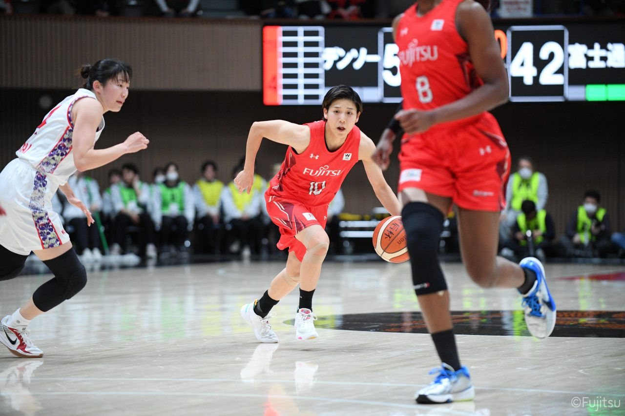 皇后杯のセミファイナルは5年連続でデンソーと対戦。レッドウェーブのスタメンは#7林(咲)、#8テミトペ、#10町田、#25内尾、#52宮澤。#25内尾のフリースローでゲームを動かすと、#10町田から#8テミトペにつながるコンビネーションで続く。その後も#52宮澤の3ポイントシュートや#11前澤のドライブ、#10町田の3ポイントシュートなどで得点を重ねていく。終盤には#0山田から#22エブリンにつながるプレーが連続で決まり、最後も#22エブリンがフリースローを決めて、19-15で第1Qを終える。