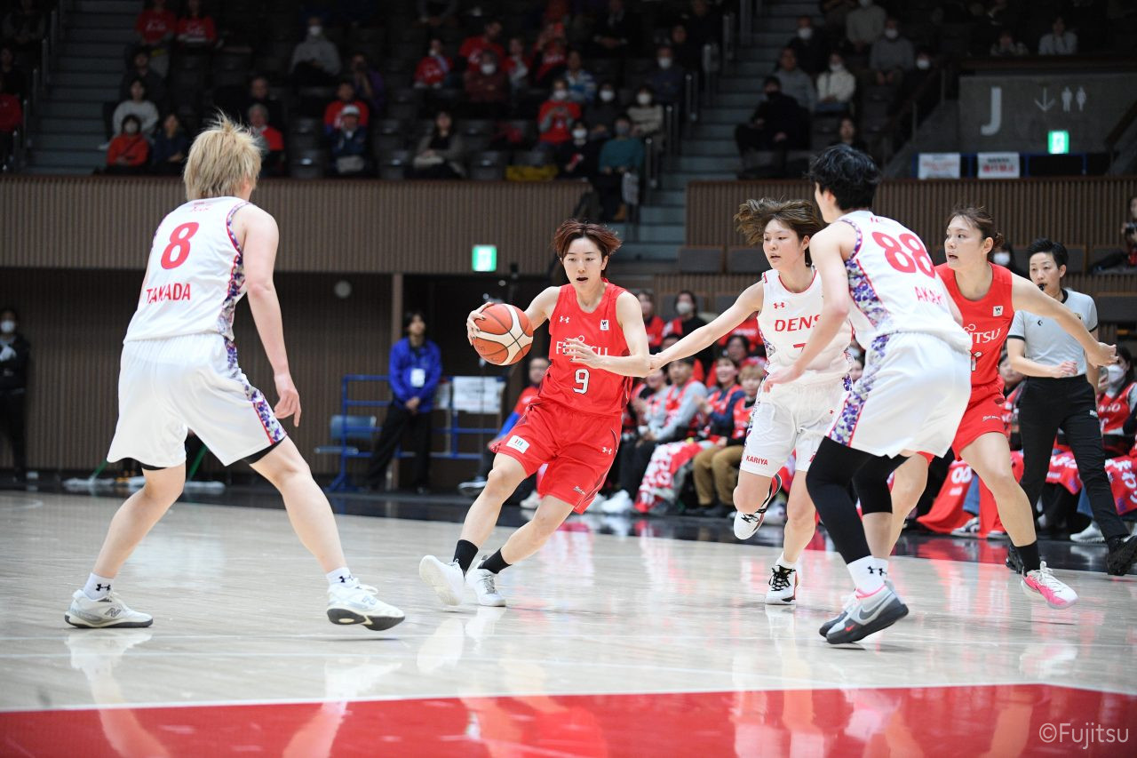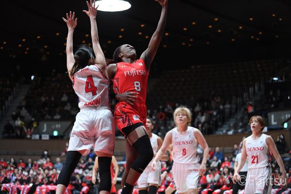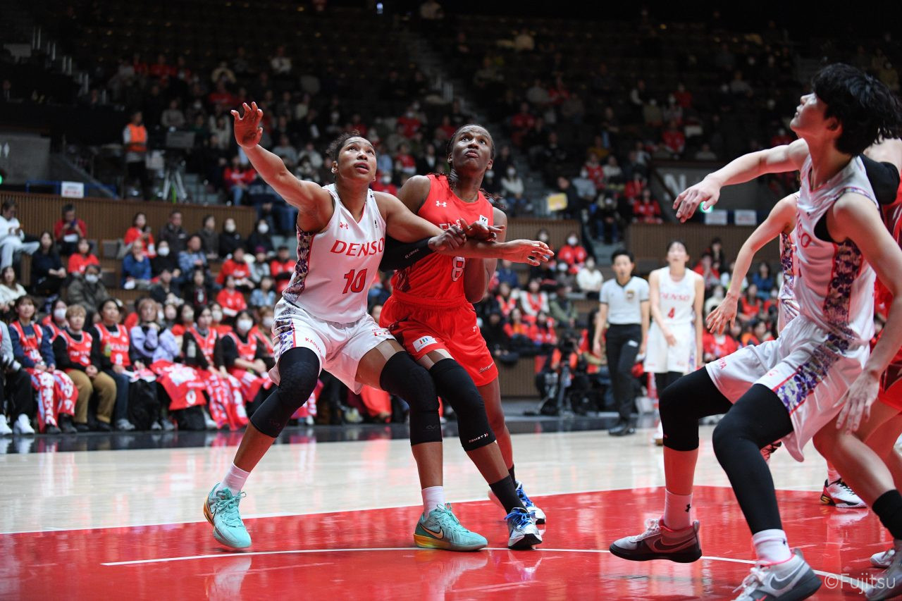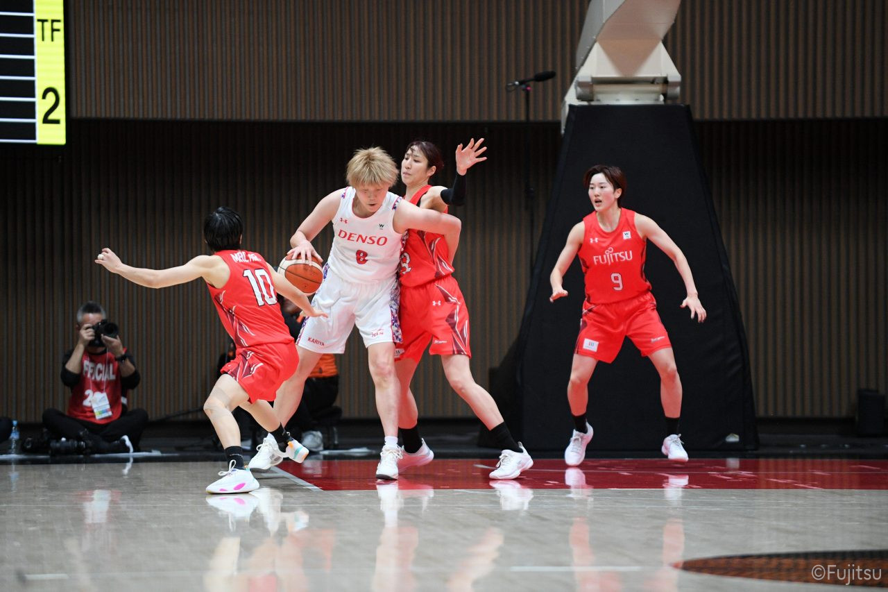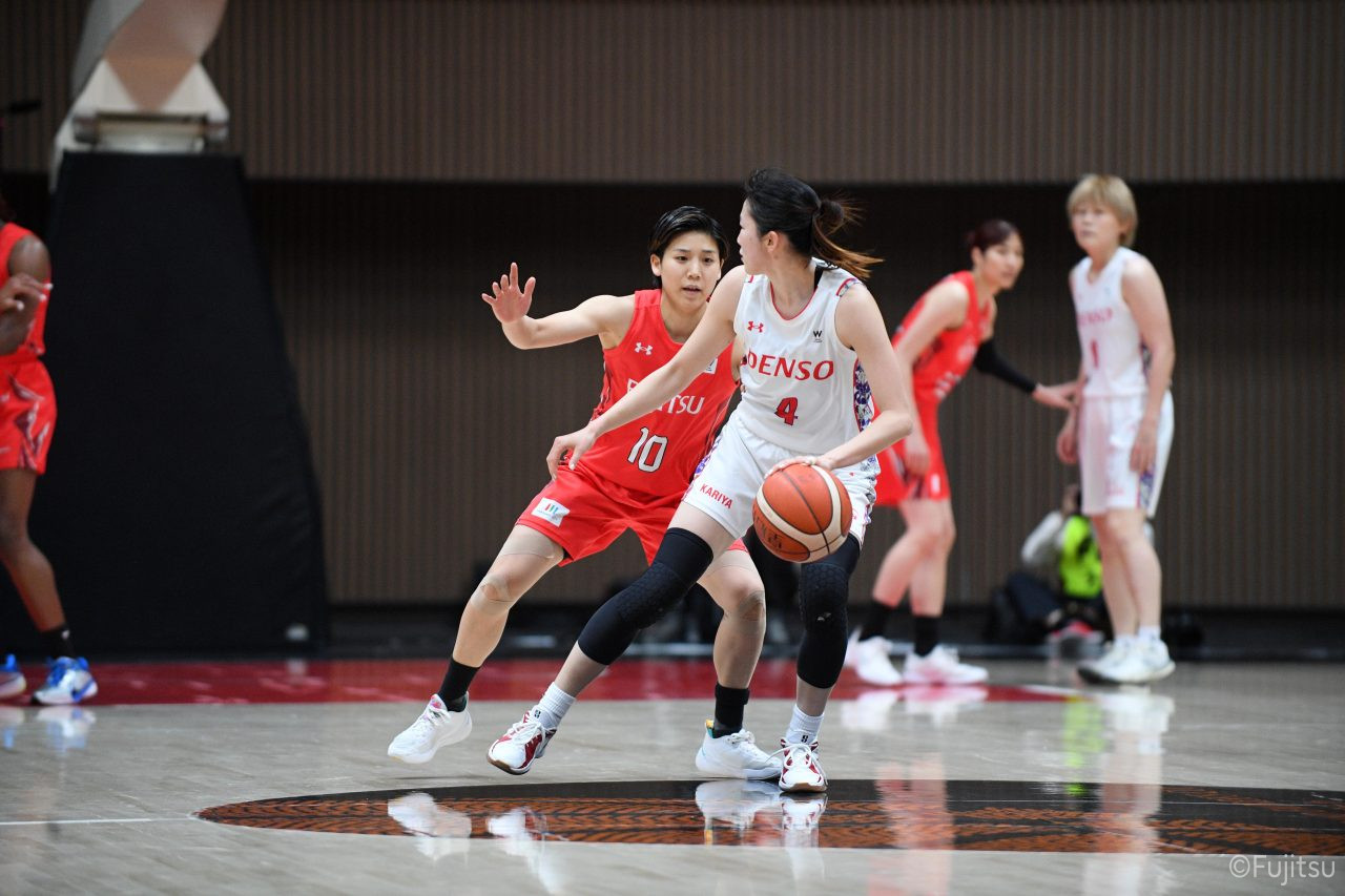 第2Qは失点からスタートするが、#0山田の3ポイントシュートを含む連続得点でリードを広げて、デンソーにタイムアウトを取らせる。さらに#22エブリンのフリースローも決まるが、そこからバスケットカウントを含む連続失点。一度は#22エブリンのリバウンドシュートで返すが、そこから3連続失点で逆転を許してしまう。#8テミトペのバスケットカウントと、#81宮下のジャンプシュートで再逆転するが、またしても連続失点で逆転される。一度は#22エブリンのバスケットカウントで同点に追いつくが、最後も連続失点し、35-39で前半を折り返す。