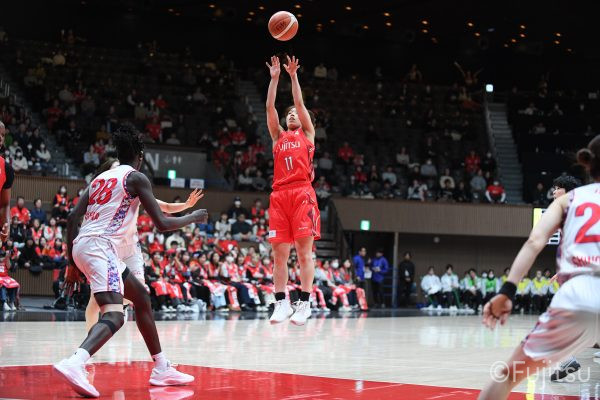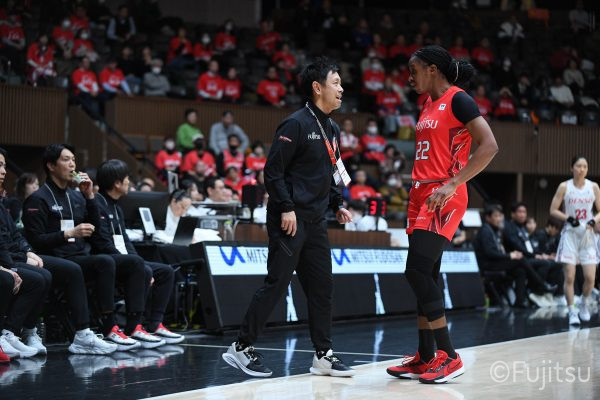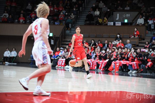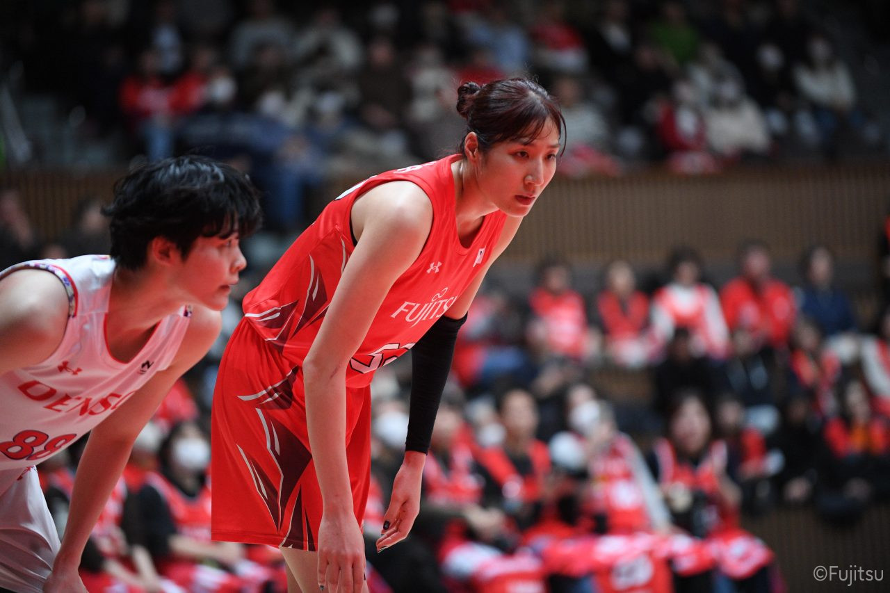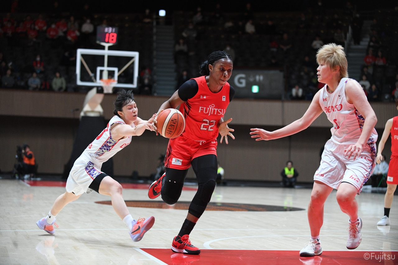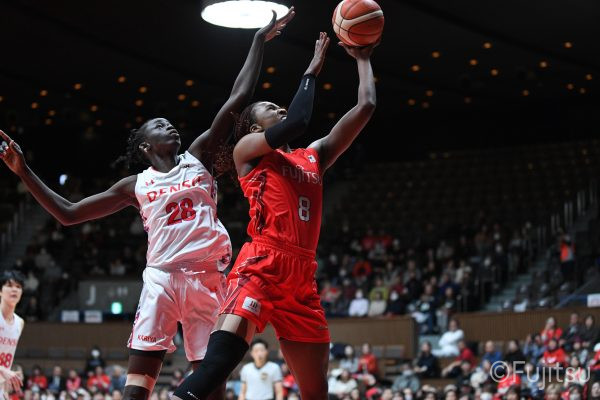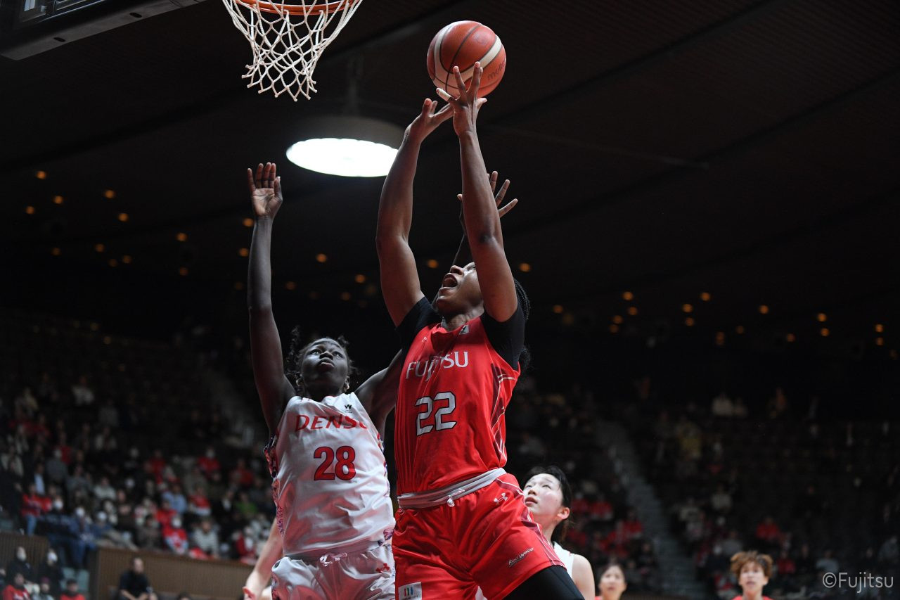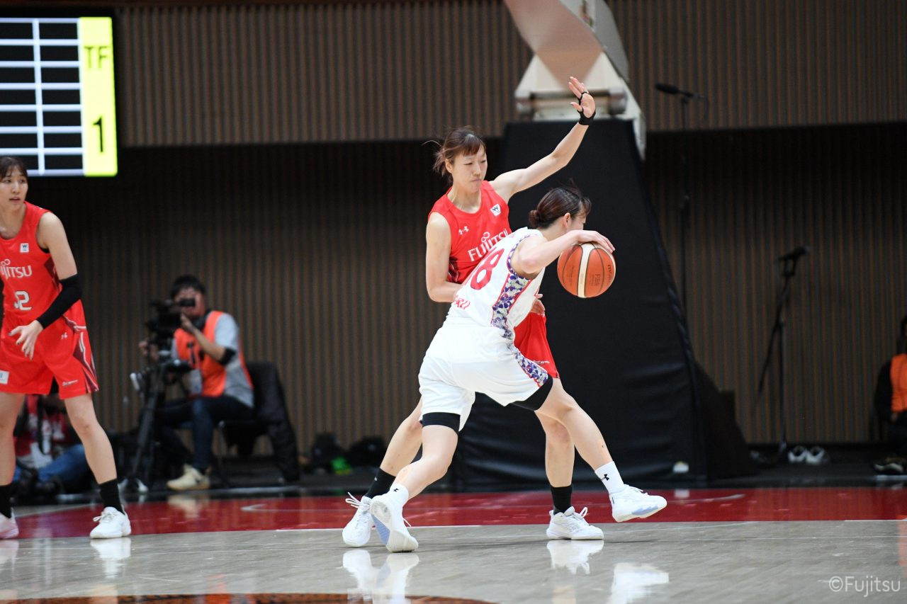 第2Qは失点からスタートするが、#0山田の3ポイントシュートを含む連続得点でリードを広げて、デンソーにタイムアウトを取らせる。さらに#22エブリンのフリースローも決まるが、そこからバスケットカウントを含む連続失点。一度は#22エブリンのリバウンドシュートで返すが、そこから3連続失点で逆転を許してしまう。#8テミトペのバスケットカウントと、#81宮下のジャンプシュートで再逆転するが、またしても連続失点で逆転される。一度は#22エブリンのバスケットカウントで同点に追いつくが、最後も連続失点し、35-39で前半を折り返す。