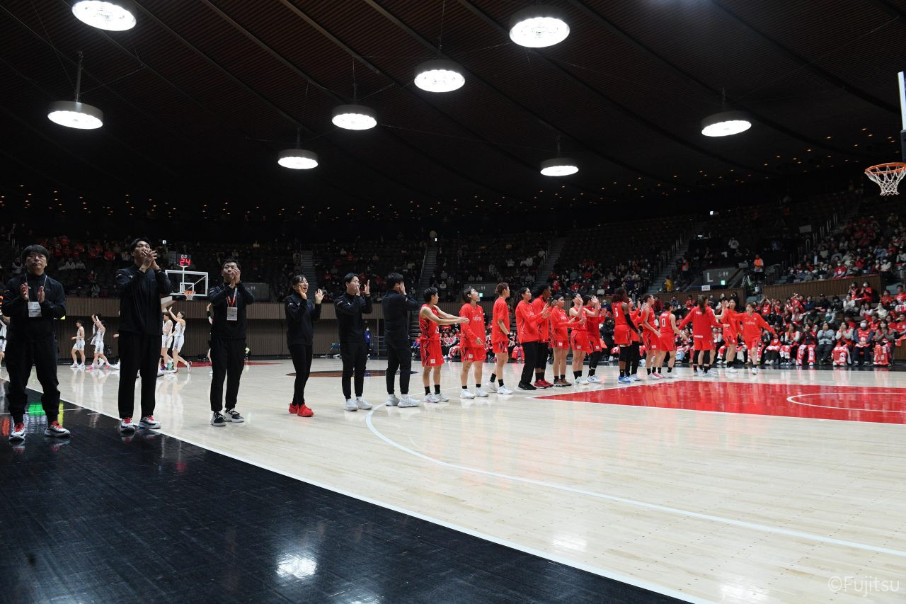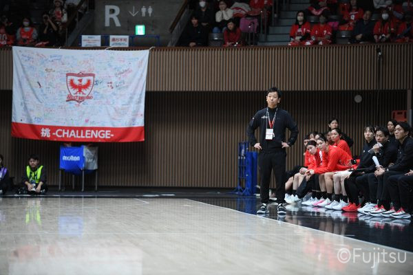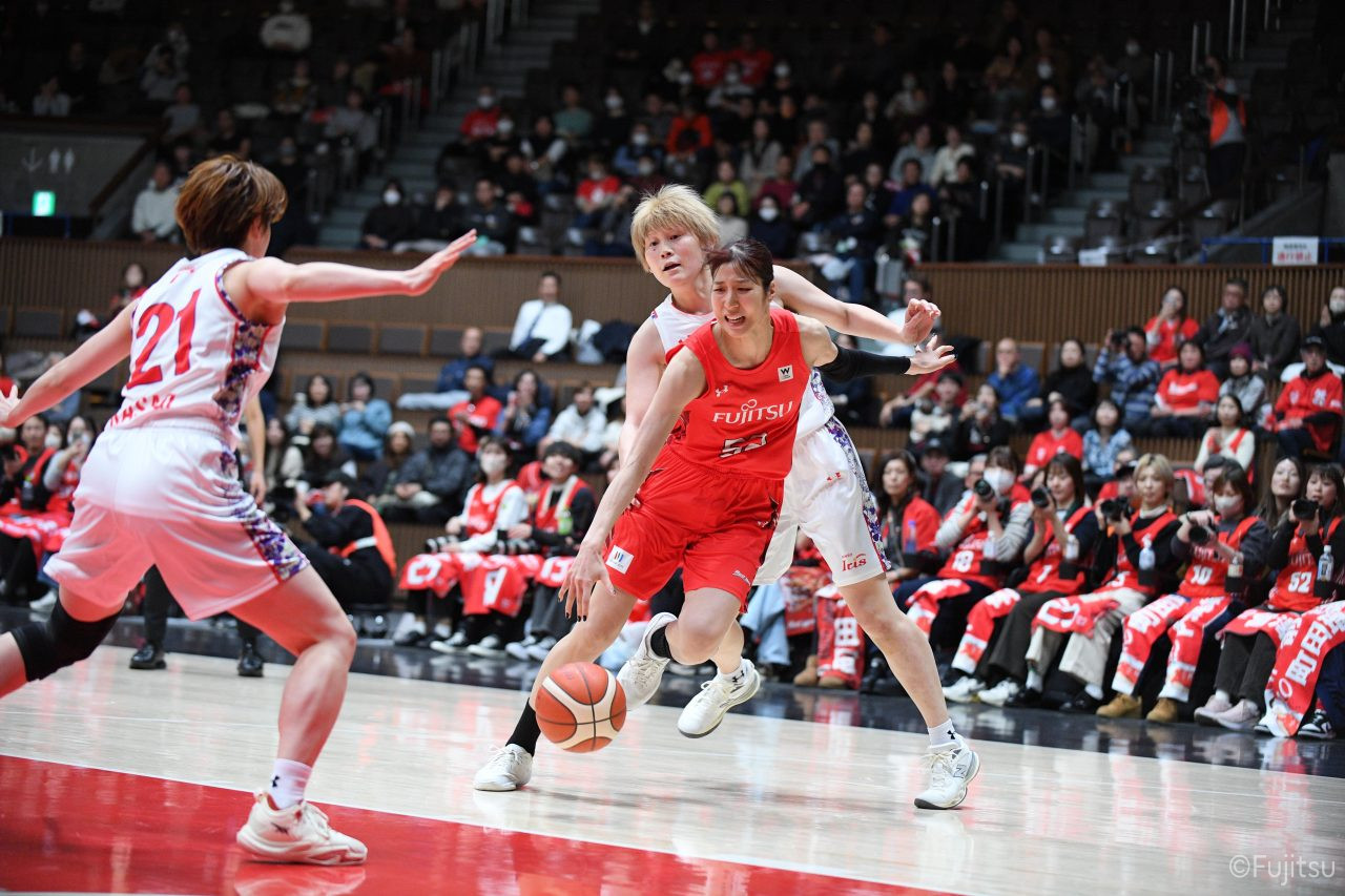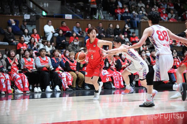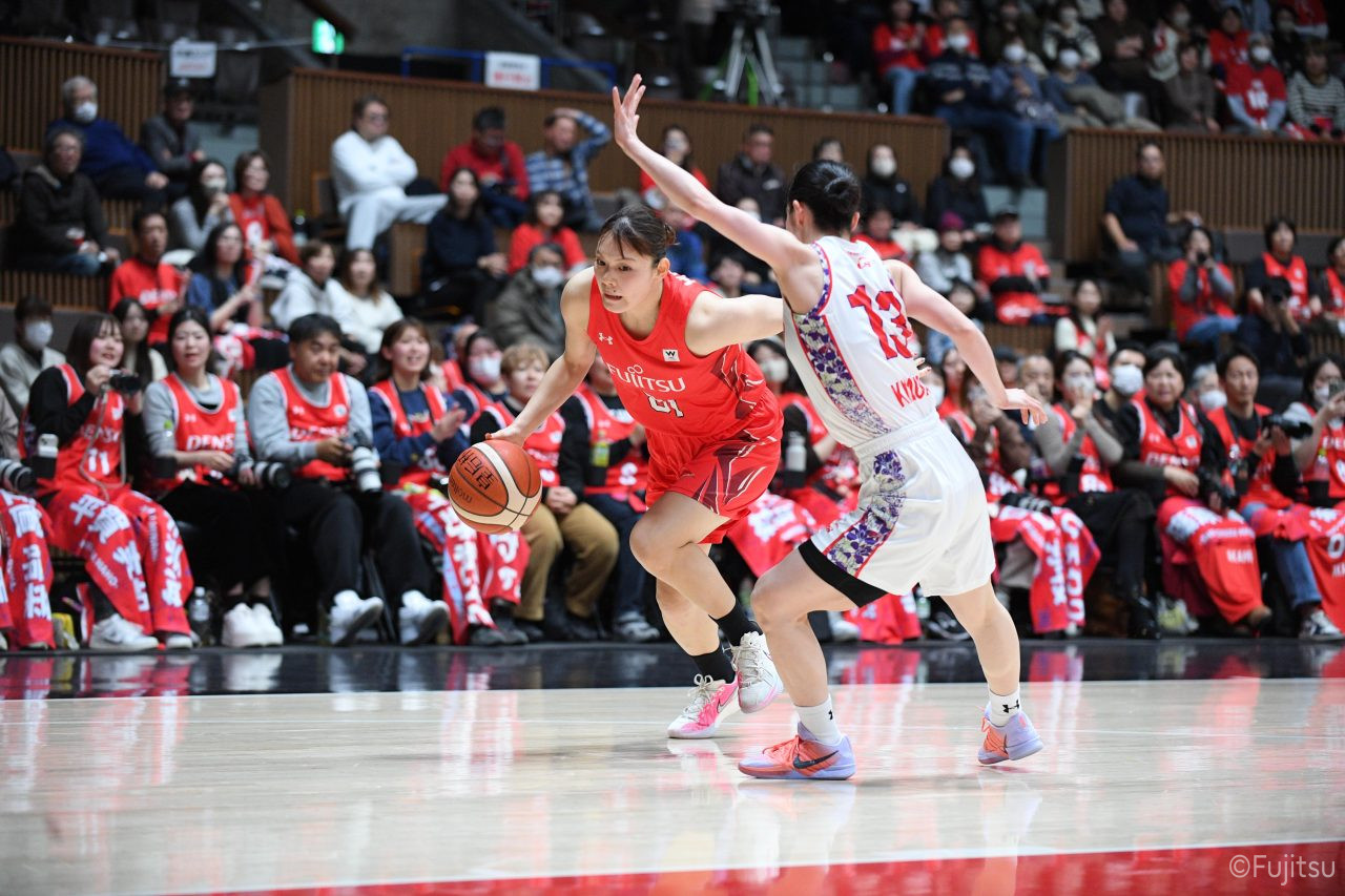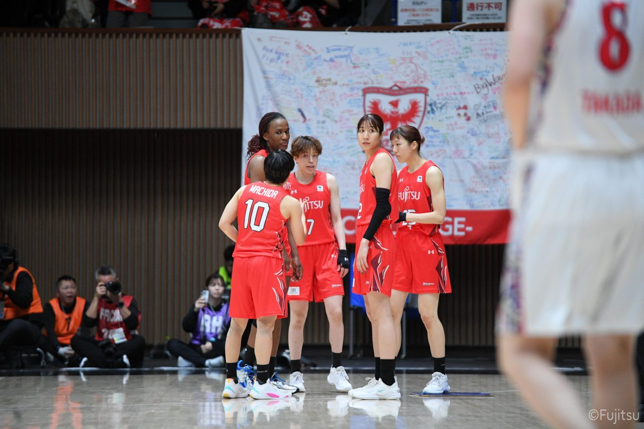 第2Qは失点からスタートするが、#0山田の3ポイントシュートを含む連続得点でリードを広げて、デンソーにタイムアウトを取らせる。さらに#22エブリンのフリースローも決まるが、そこからバスケットカウントを含む連続失点。一度は#22エブリンのリバウンドシュートで返すが、そこから3連続失点で逆転を許してしまう。#8テミトペのバスケットカウントと、#81宮下のジャンプシュートで再逆転するが、またしても連続失点で逆転される。一度は#22エブリンのバスケットカウントで同点に追いつくが、最後も連続失点し、35-39で前半を折り返す。