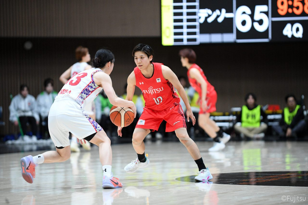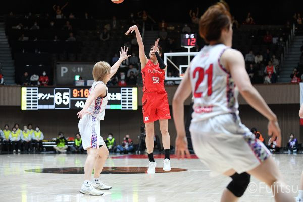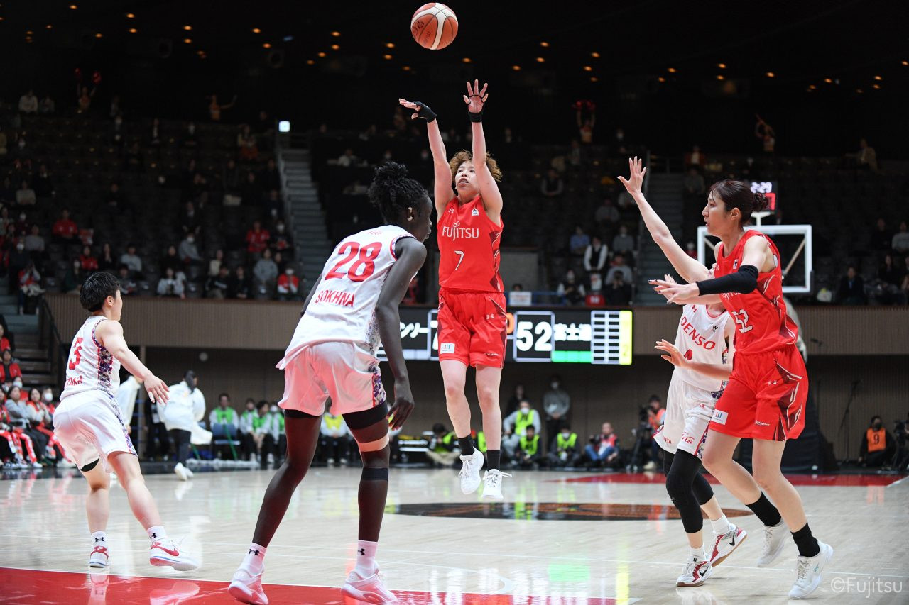 後半も立ちあがりから連続失点。タイムアウトで流れを断ち切り、#52宮澤のパスから#10町田がジャンプシュートを決めるが、後が続かない。その後、2度目のタイムアウトを挟みながらも、3ポイントシュート2本を含む4連続失点で突き放されてしまう。#22エブリンがドライブとフリースローで得点をつなぐが、デンソーに傾いた流れを大きく変えるには至らない。それでも終盤、#10町田のジャンプシュートや#11前澤のフリースローで連続得点をあげると、3ポイントシュートを決められたあとに#9赤木が3ポイントシュートで返し、さらに#11前澤が再びフリースローを沈める。しかし最後も3ポイントシュートを決められ、49-65で第3Qを終える。