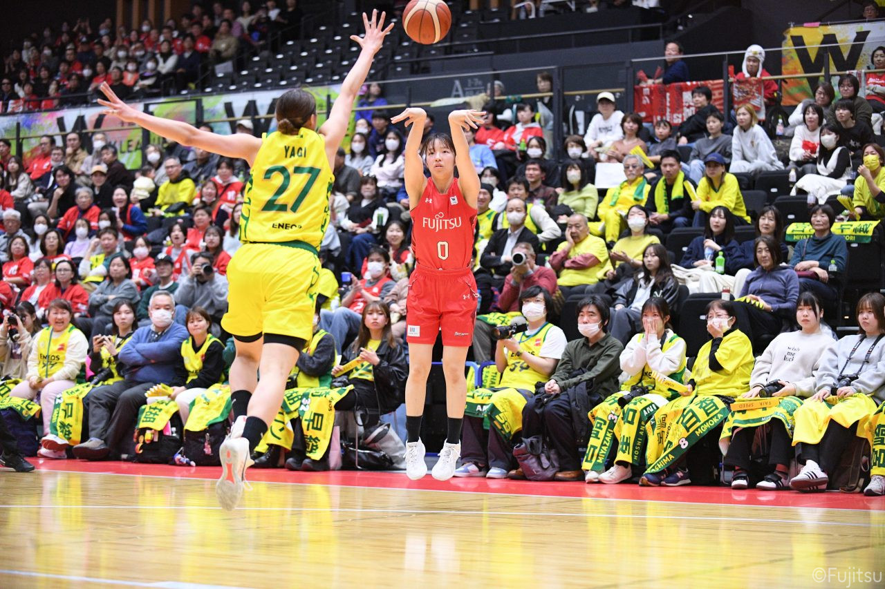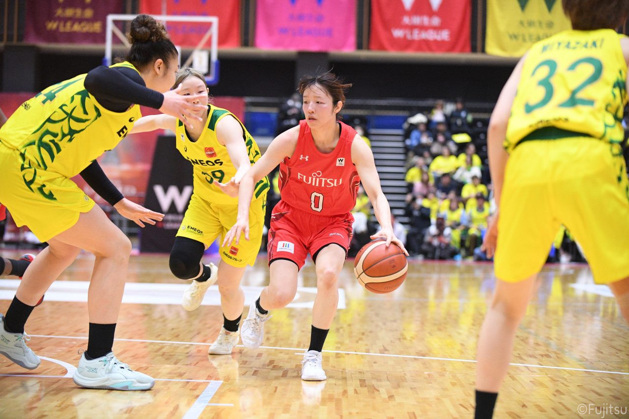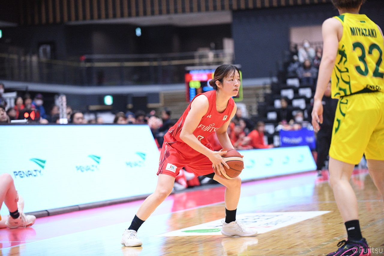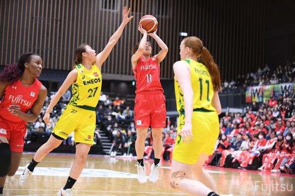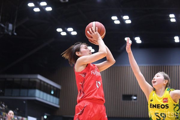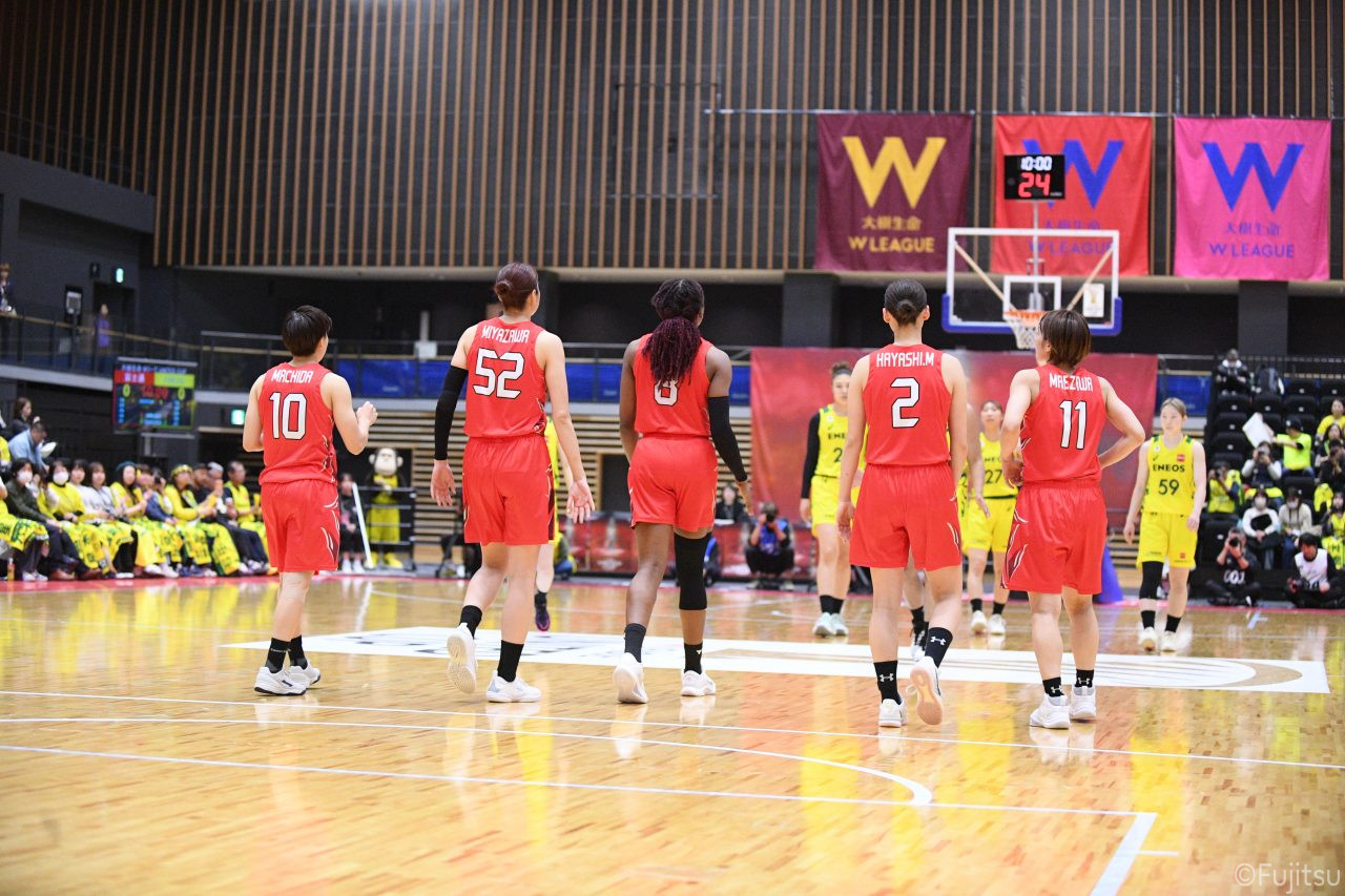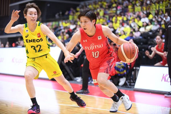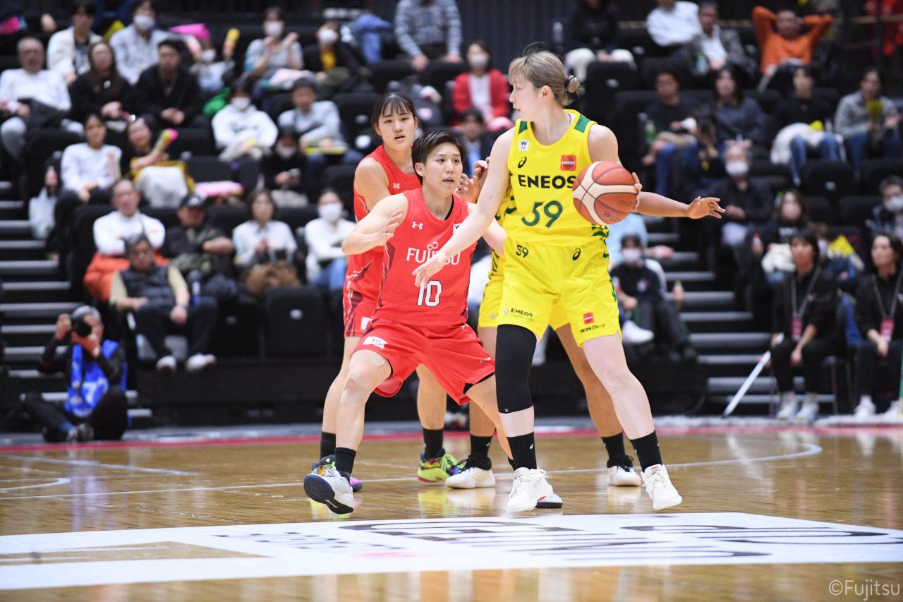 失点からスタートするが、スローインプレーで#0山田が決め返すと、#91大脇のリバウンドシュートで逆転。さらに#91大脇が速攻で連続得点をあげ、ENEOSにタイムアウトを取らせる。#22エブリンのジャンプシュートでリードを広げると、連続失点には#11前澤がステップバックのジャンプシュートで返す。中盤には#12奥が連続で3ポイントシュートを決め、#18藤本も積極的なアタックからフリースローを獲得。#0山田の3ポイントシュートや#22エブリンのバスケットカウントで得点を積み上げていく。失点もするが、最後は#52宮澤から#22エブリンにつながるプレーで得点し、47-43で前半を折り返す。
