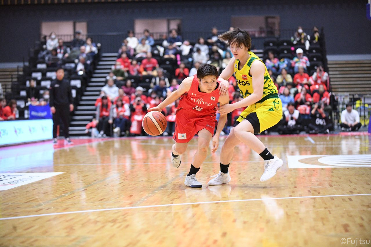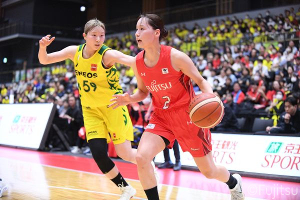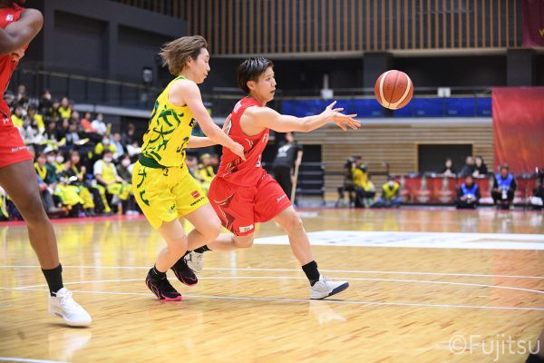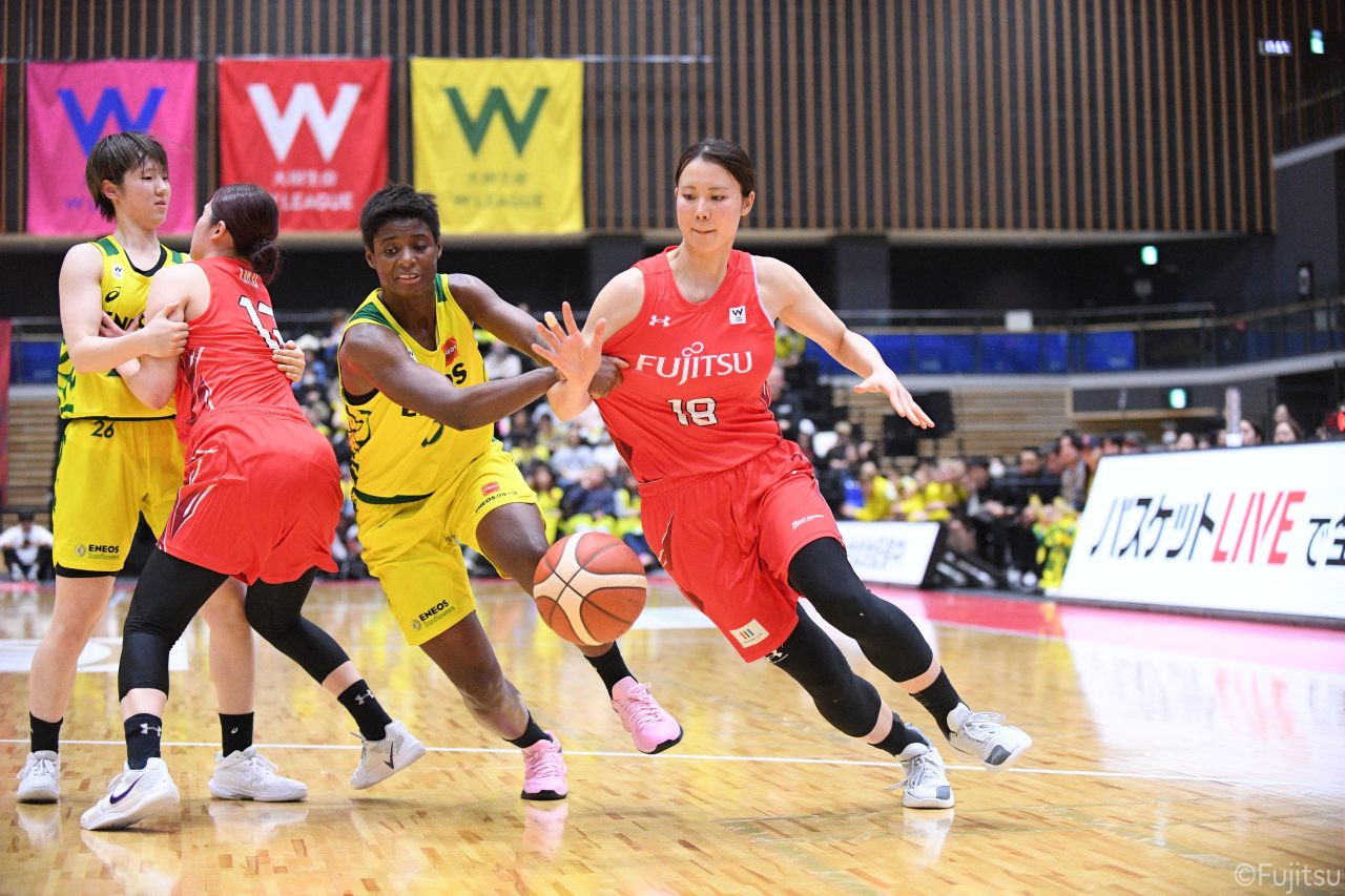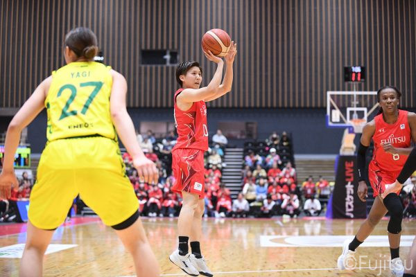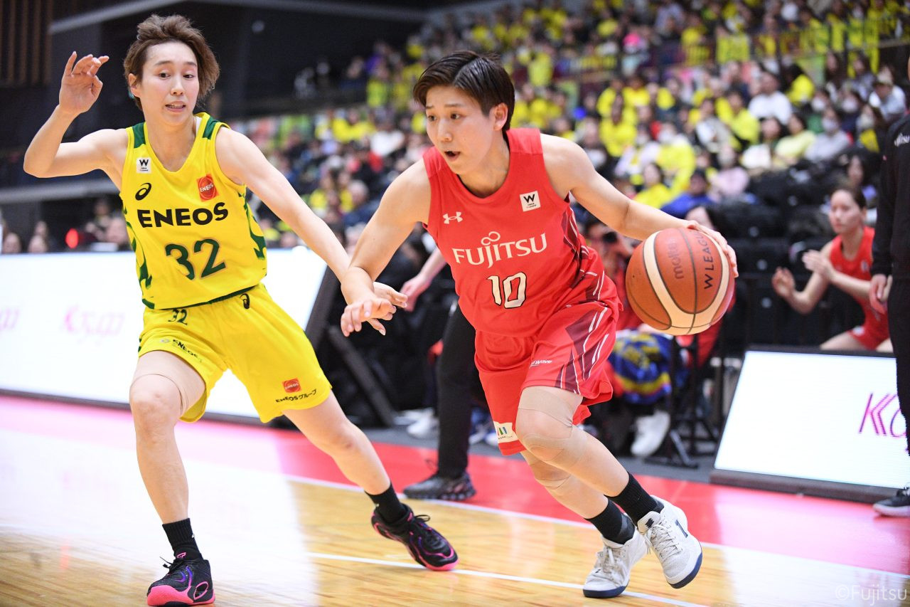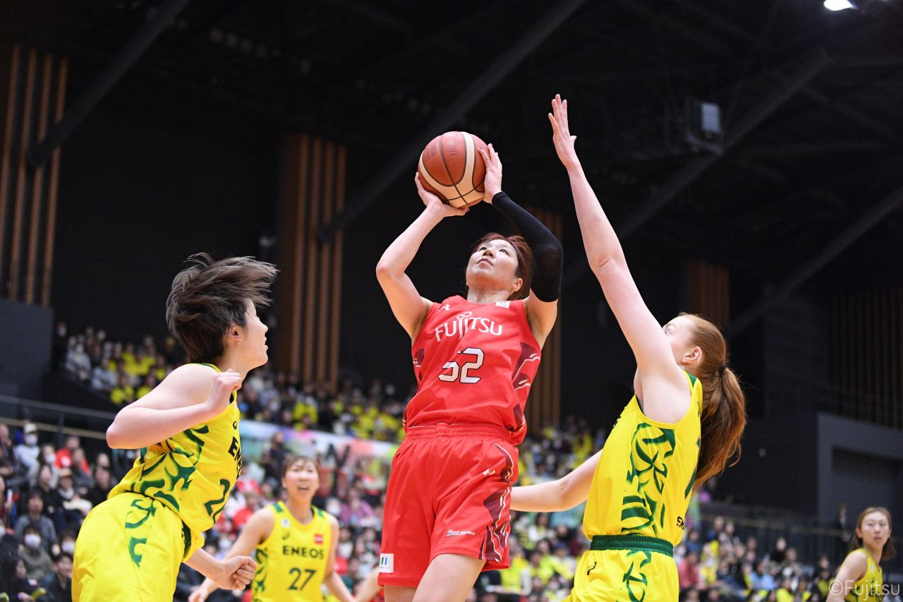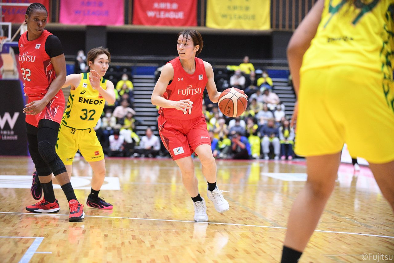 失点からスタートするが、スローインプレーで#0山田が決め返すと、#91大脇のリバウンドシュートで逆転。さらに#91大脇が速攻で連続得点をあげ、ENEOSにタイムアウトを取らせる。#22エブリンのジャンプシュートでリードを広げると、連続失点には#11前澤がステップバックのジャンプシュートで返す。中盤には#12奥が連続で3ポイントシュートを決め、#18藤本も積極的なアタックからフリースローを獲得。#0山田の3ポイントシュートや#22エブリンのバスケットカウントで得点を積み上げていく。失点もするが、最後は#52宮澤から#22エブリンにつながるプレーで得点し、47-43で前半を折り返す。