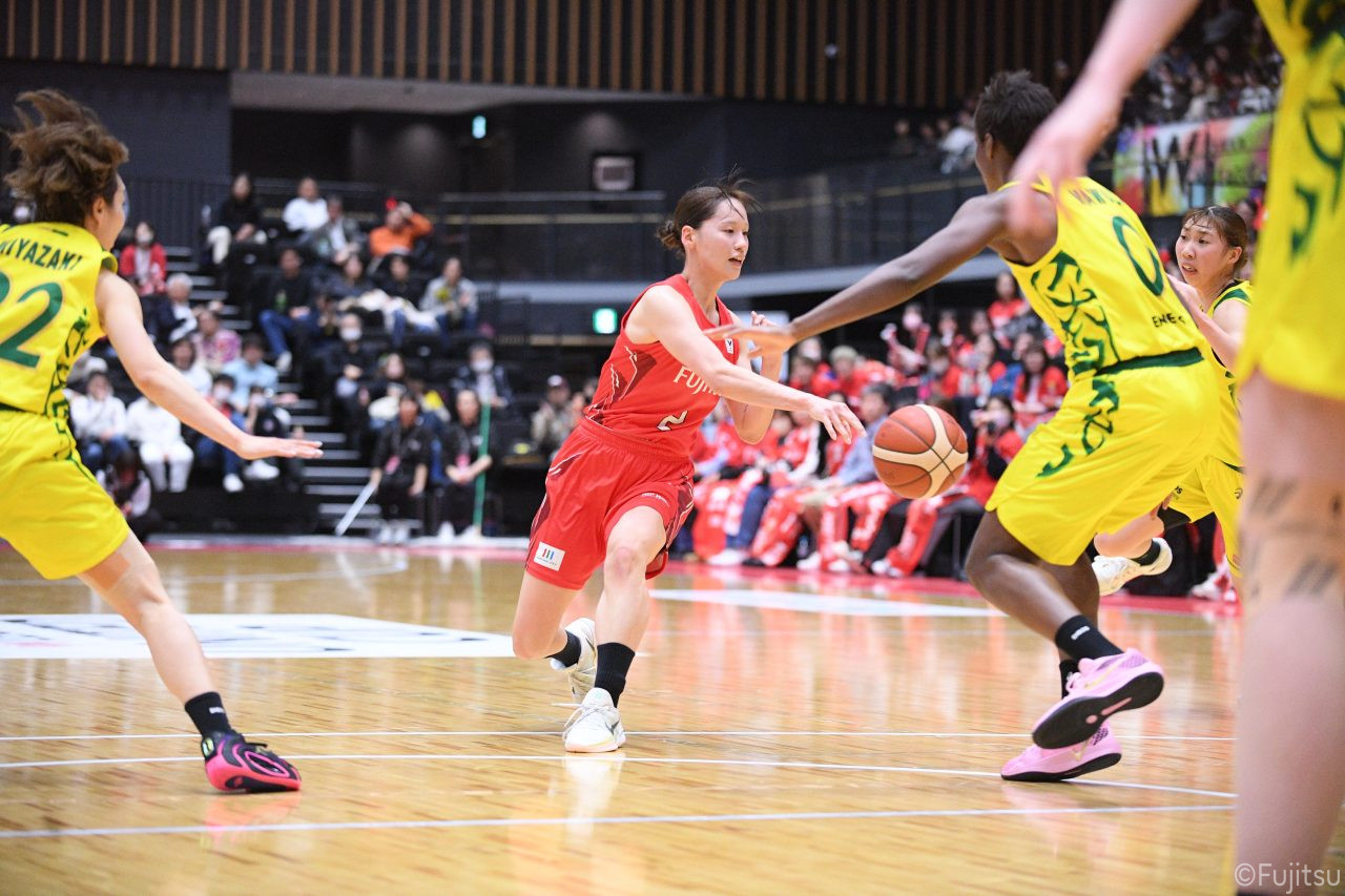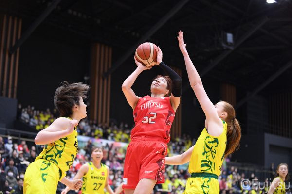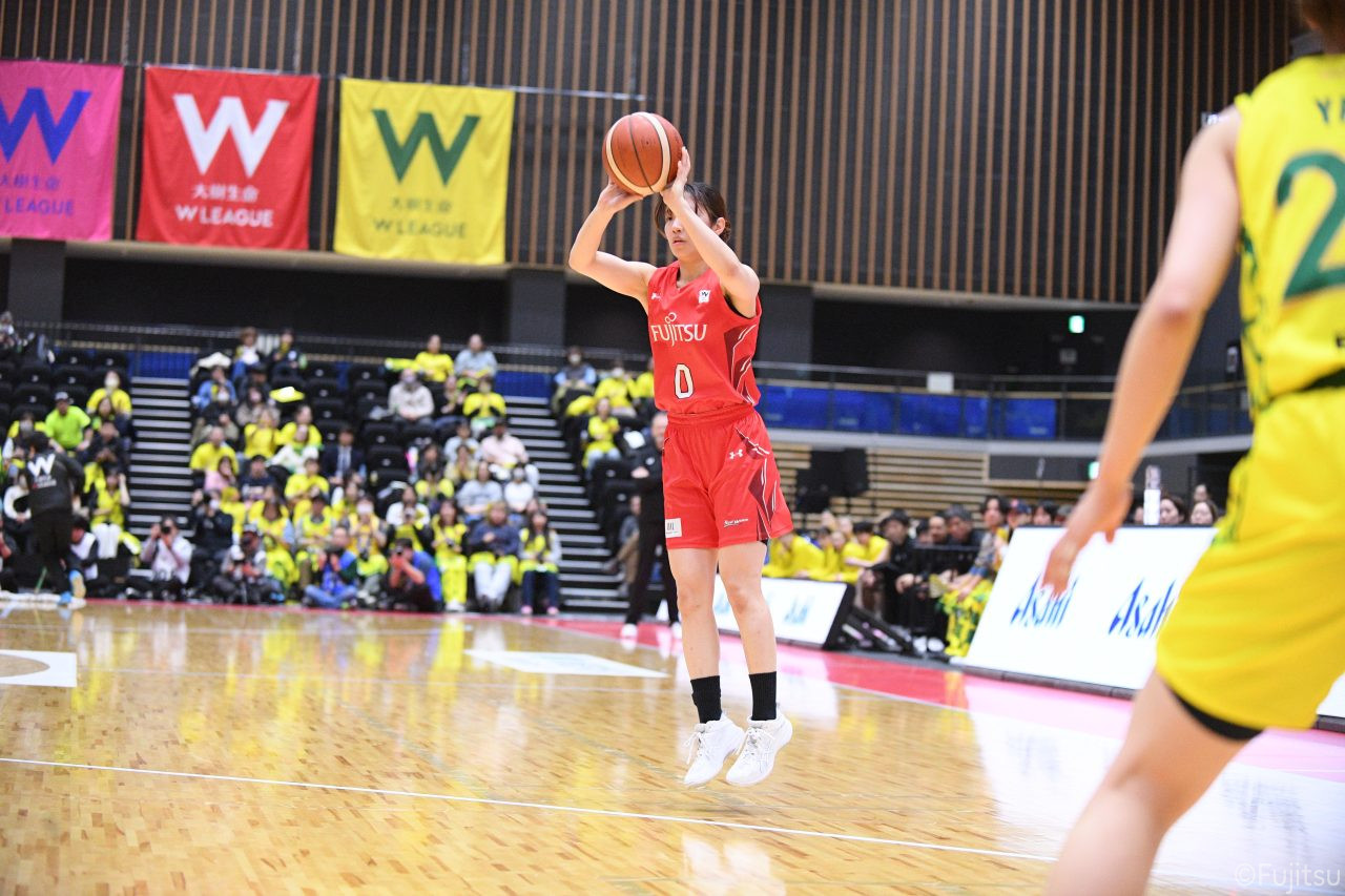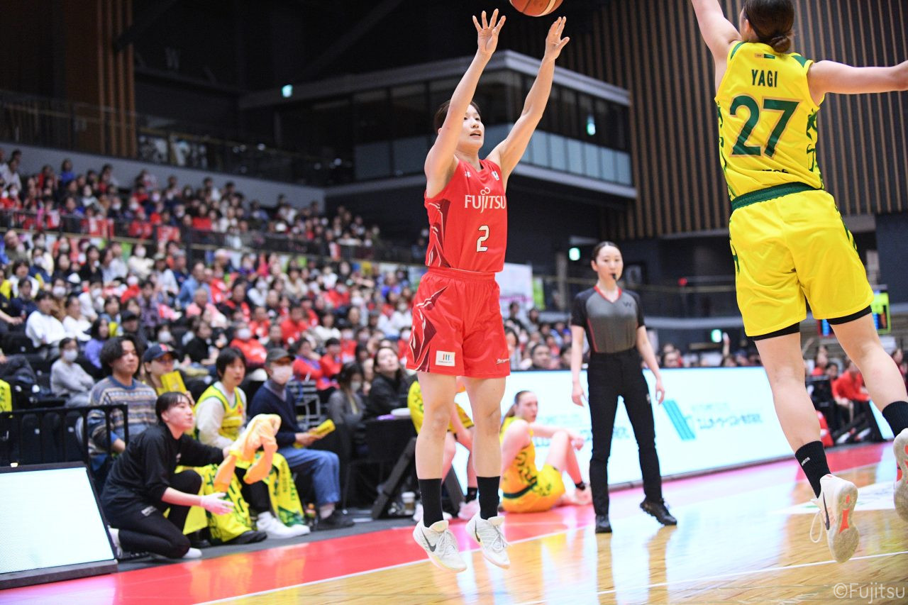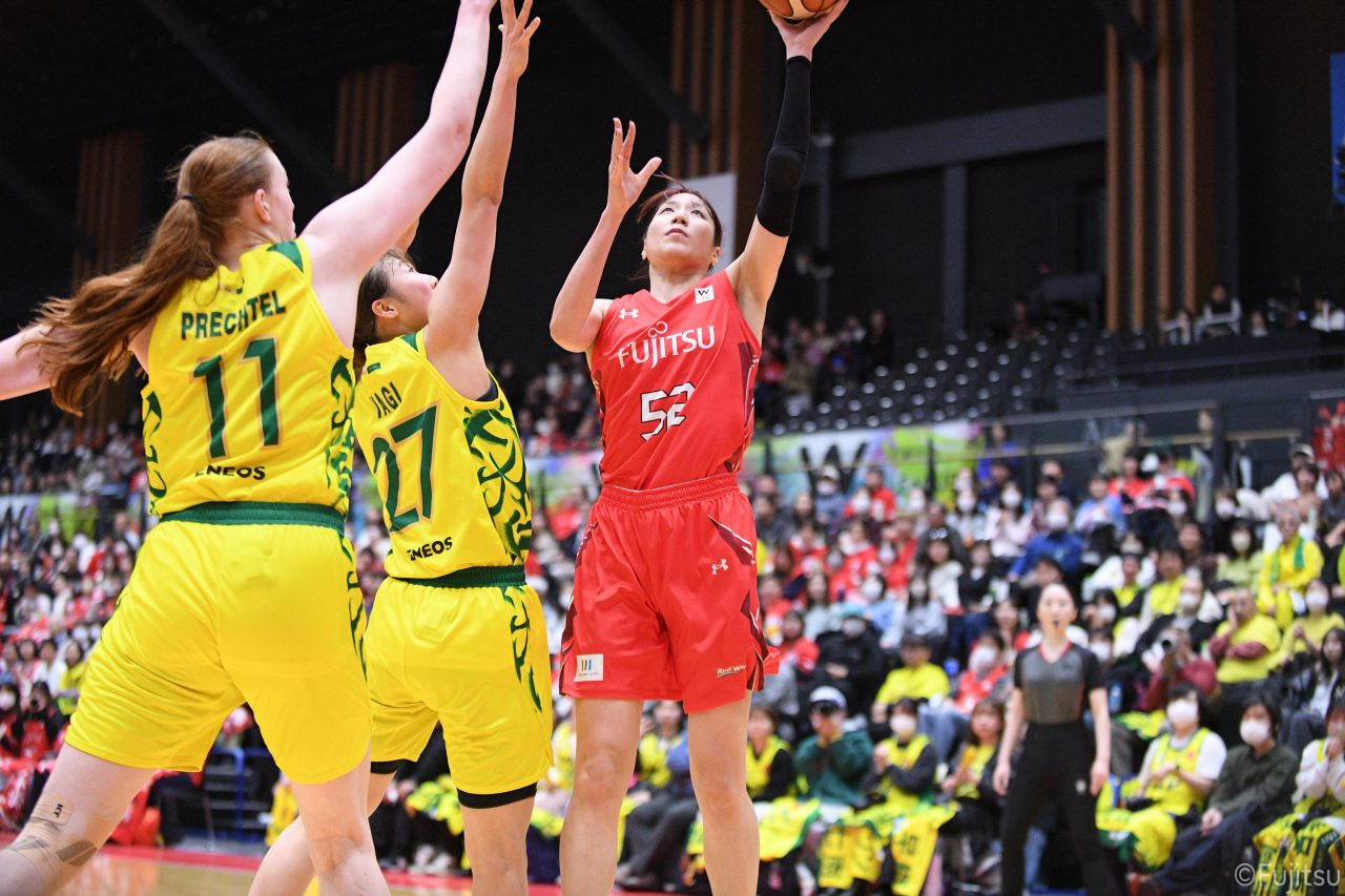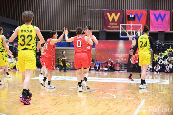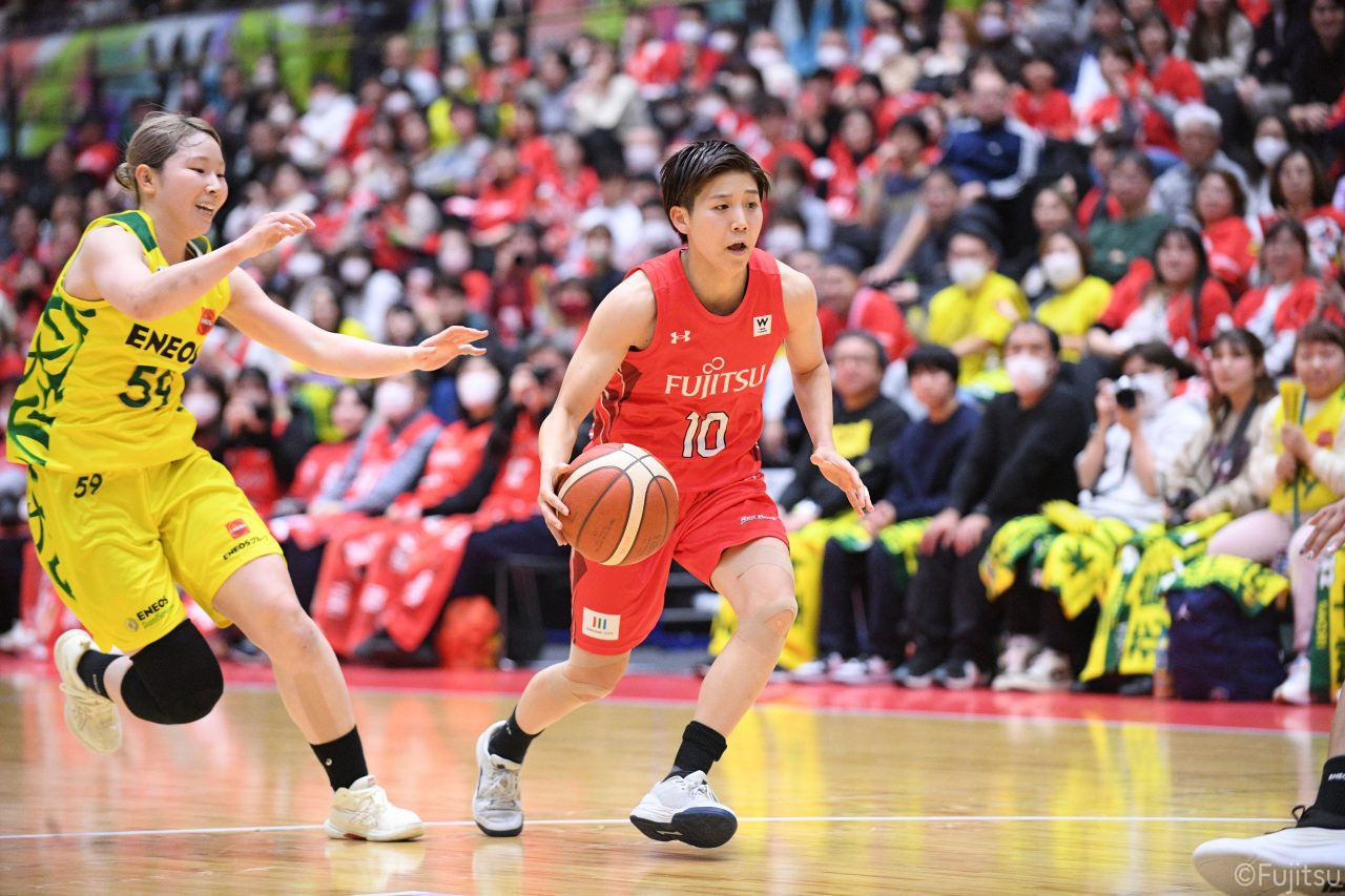 失点からスタートするが、スローインプレーで#0山田が決め返すと、#91大脇のリバウンドシュートで逆転。さらに#91大脇が速攻で連続得点をあげ、ENEOSにタイムアウトを取らせる。#22エブリンのジャンプシュートでリードを広げると、連続失点には#11前澤がステップバックのジャンプシュートで返す。中盤には#12奥が連続で3ポイントシュートを決め、#18藤本も積極的なアタックからフリースローを獲得。#0山田の3ポイントシュートや#22エブリンのバスケットカウントで得点を積み上げていく。失点もするが、最後は#52宮澤から#22エブリンにつながるプレーで得点し、47-43で前半を折り返す。