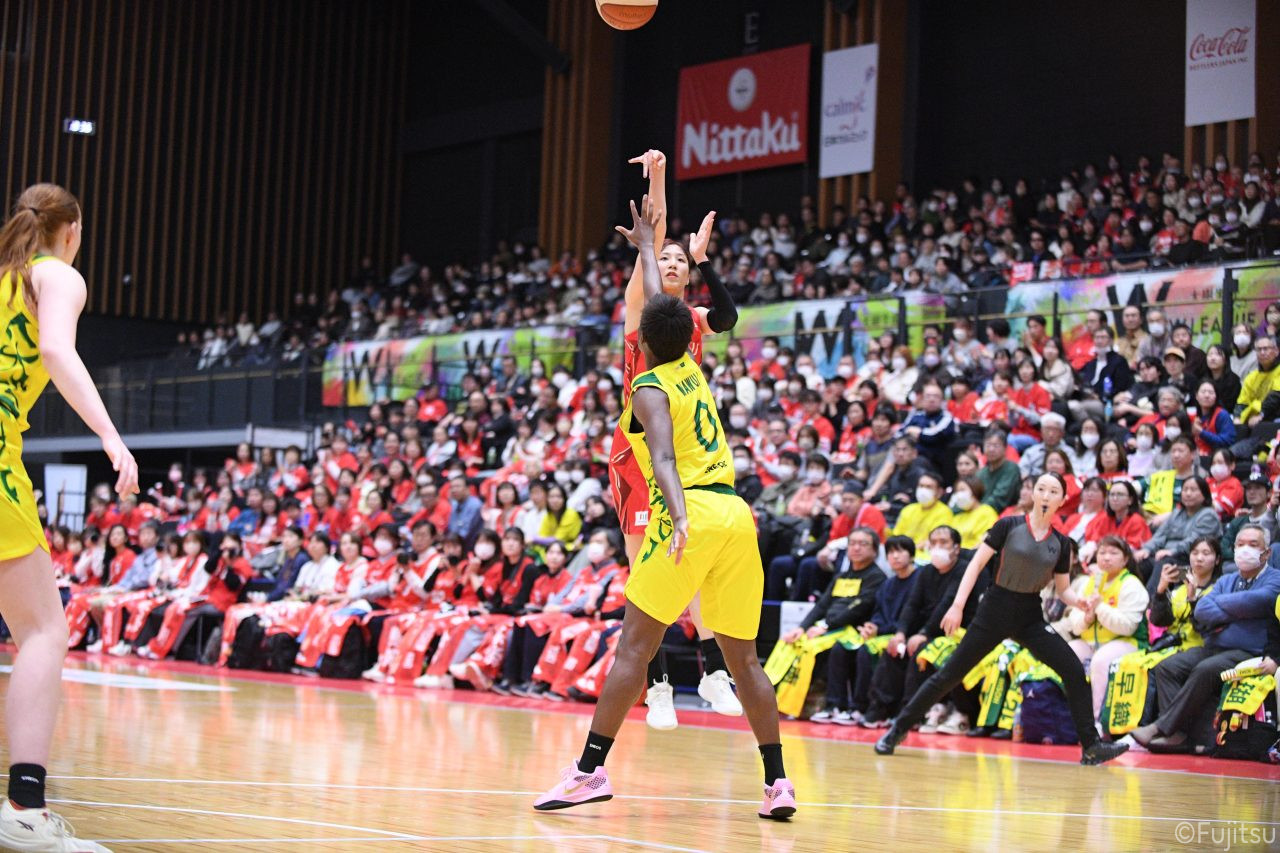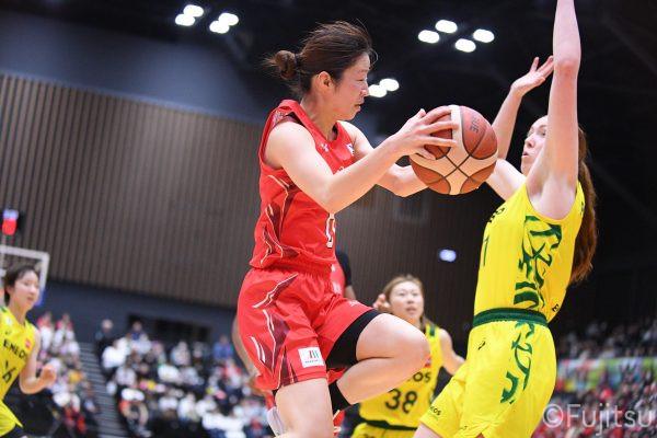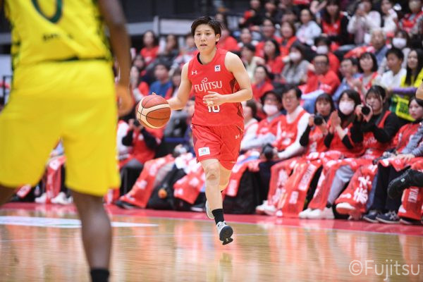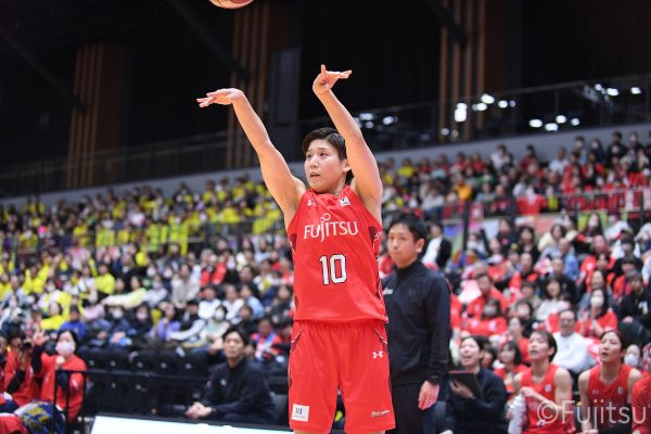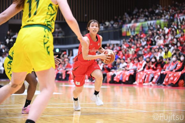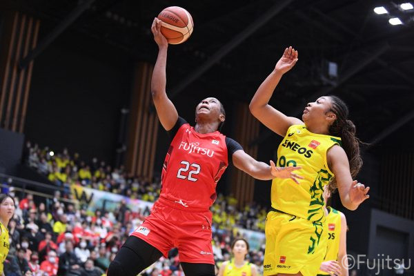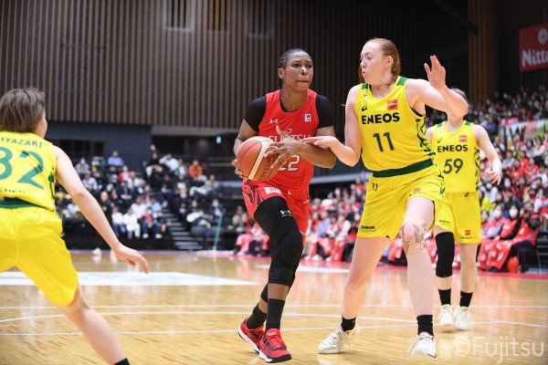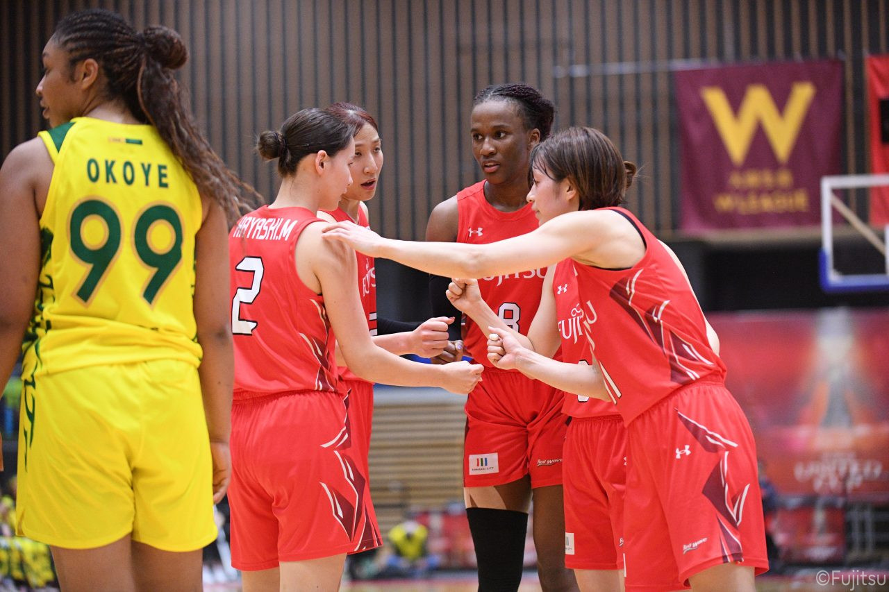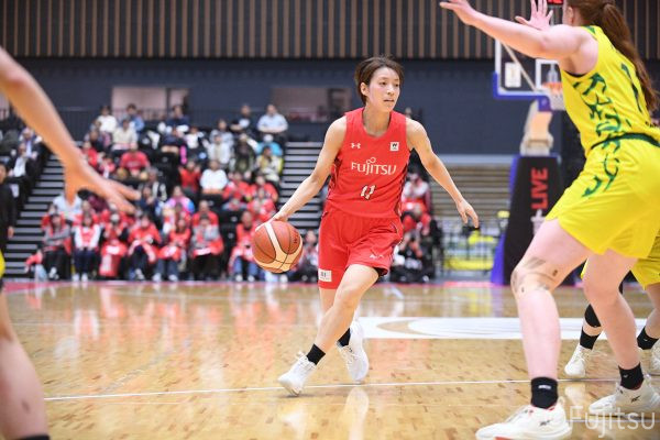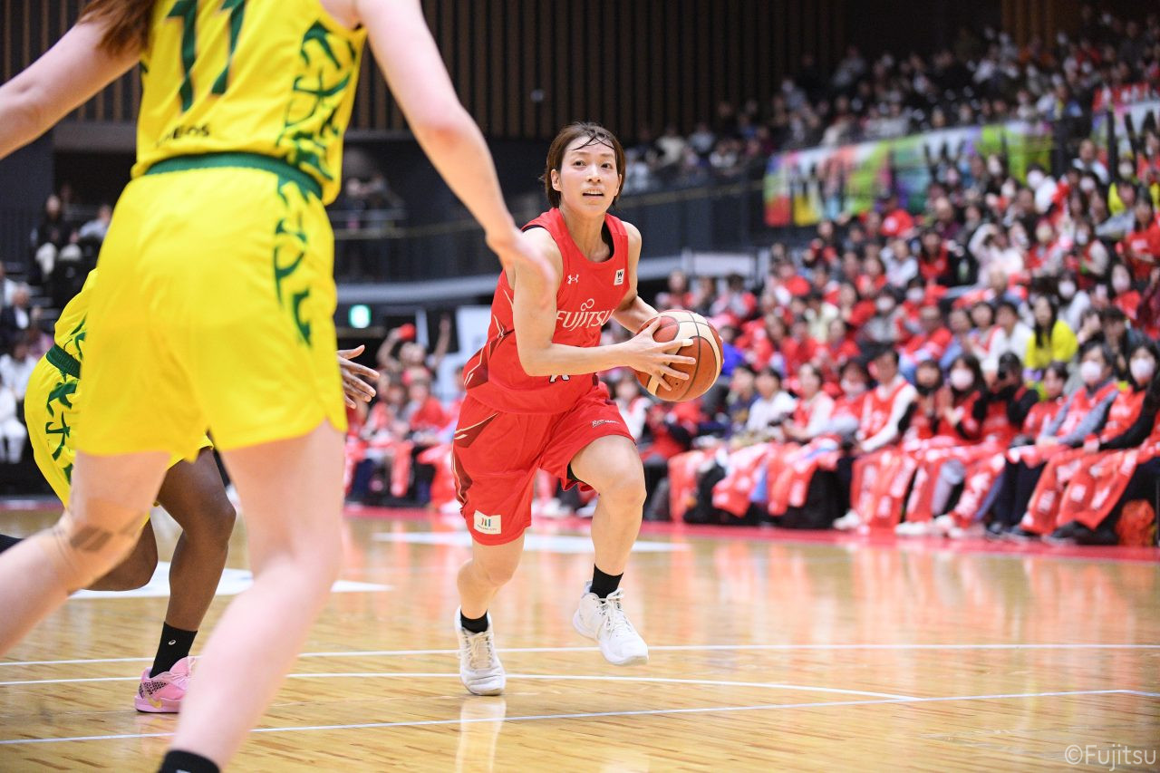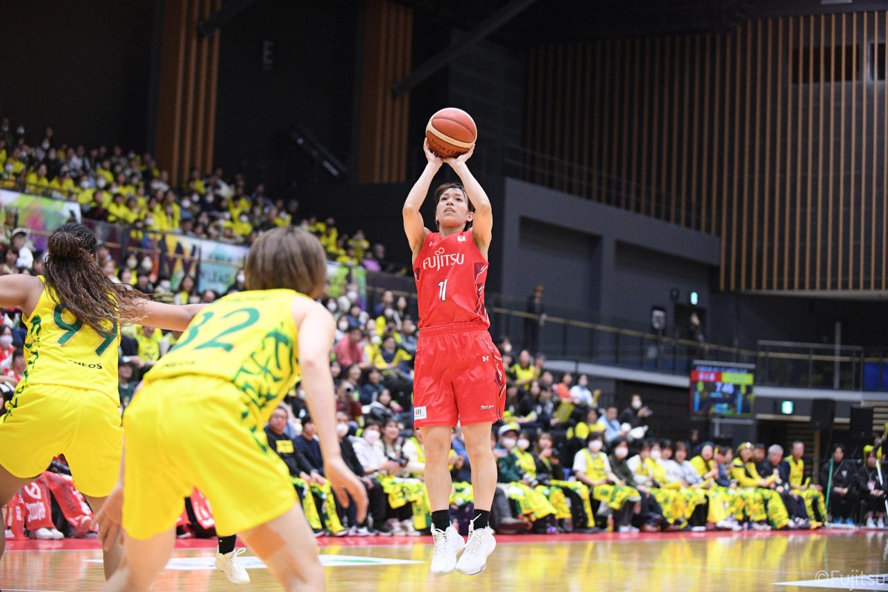 失点からスタートするが、スローインプレーで#0山田が決め返すと、#91大脇のリバウンドシュートで逆転。さらに#91大脇が速攻で連続得点をあげ、ENEOSにタイムアウトを取らせる。#22エブリンのジャンプシュートでリードを広げると、連続失点には#11前澤がステップバックのジャンプシュートで返す。中盤には#12奥が連続で3ポイントシュートを決め、#18藤本も積極的なアタックからフリースローを獲得。#0山田の3ポイントシュートや#22エブリンのバスケットカウントで得点を積み上げていく。失点もするが、最後は#52宮澤から#22エブリンにつながるプレーで得点し、47-43で前半を折り返す。