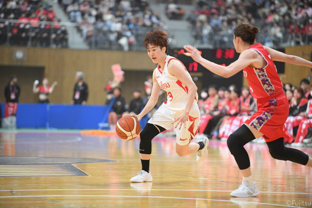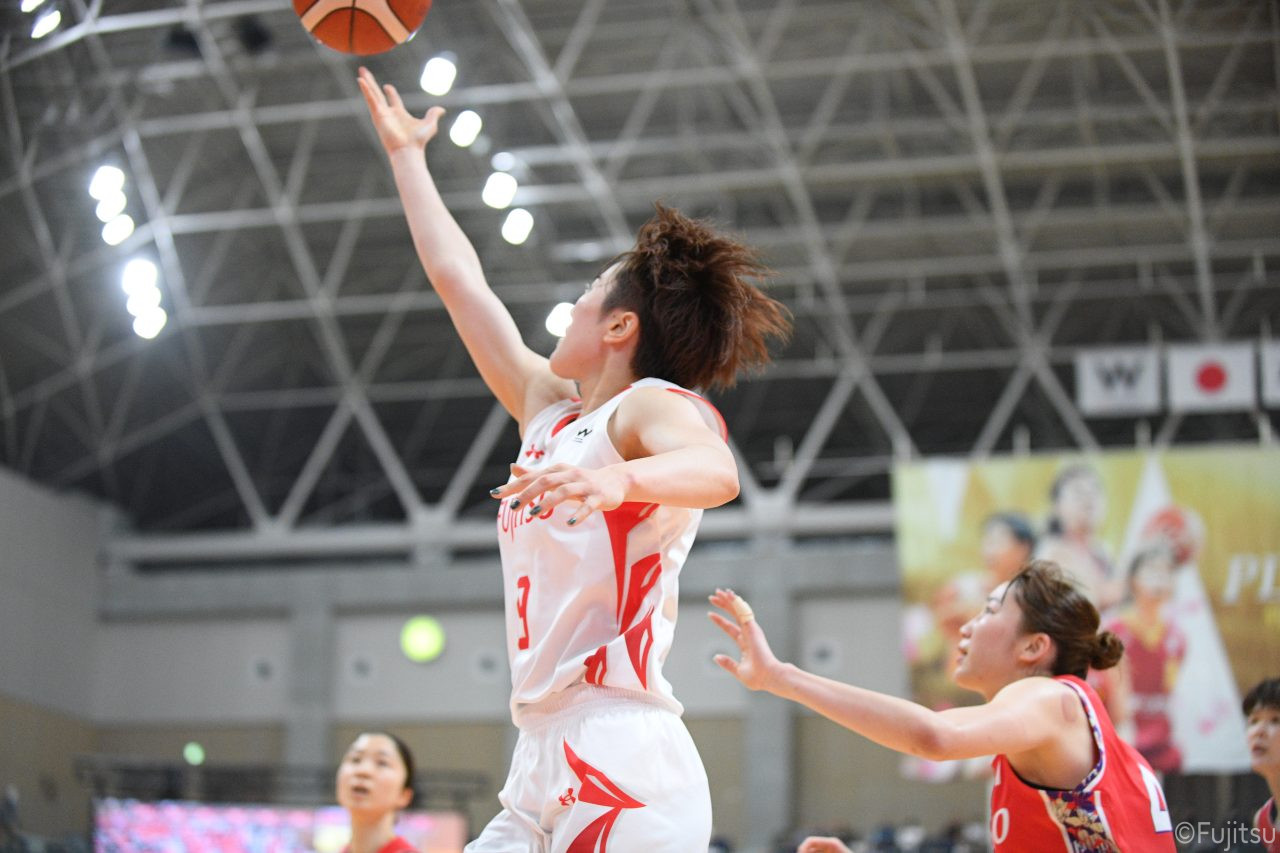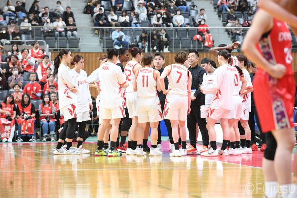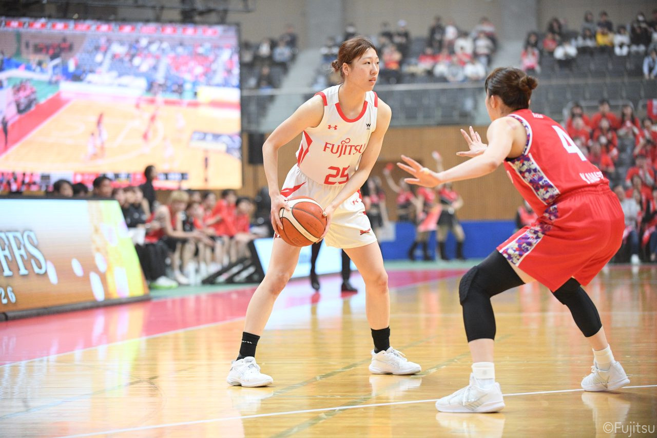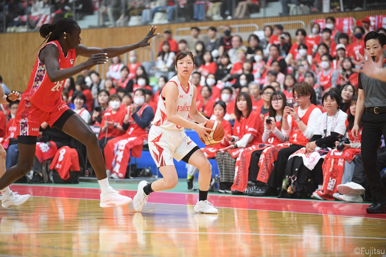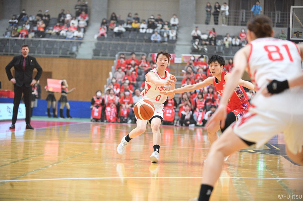 #0山田から#81宮下につながるスローインプレーで先に得点を動かすが、そこから得点が伸びていかず、その間に3連続失点し、逆転を許してしまう。タイムアウトで修正を図ると、#22エブリンのスクリーンを使った#10町田がジャンプシュートを決める。さらに#11前澤もジャンプシュートを決めるが、失点も続き、リズムをつかめないまま終盤へと進む。終盤に入ってもなかなかオフェンスの流れを作れず、#22エブリンや#8テミトペのフリースローで得点をつなぐ。その間に3ポイントシュートで失点し、前半を27-34で折り返す。