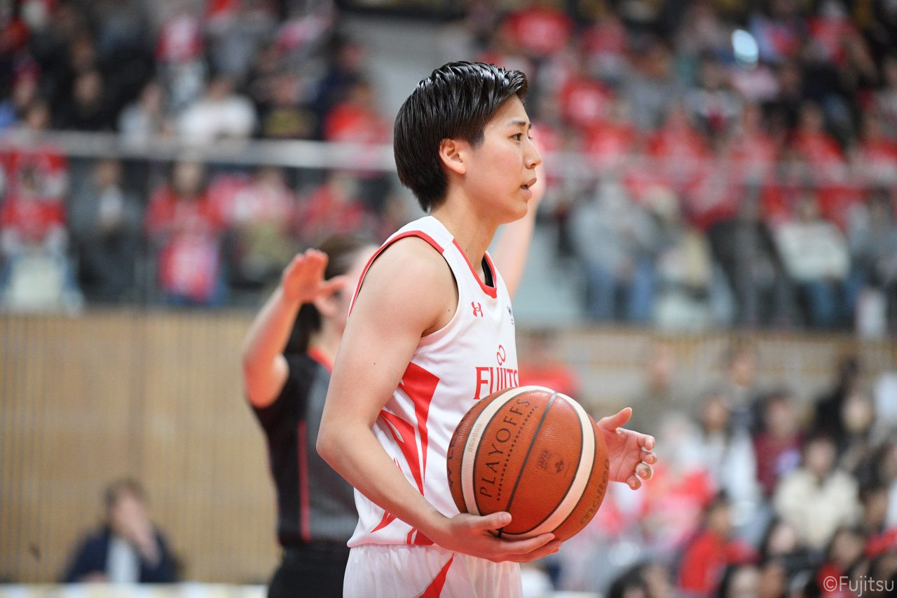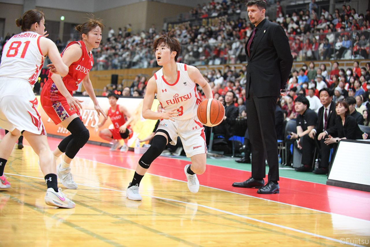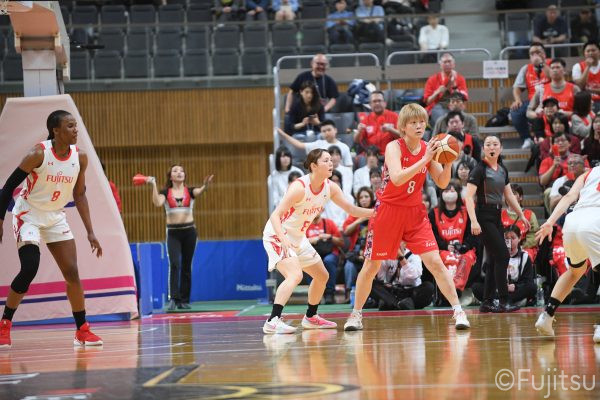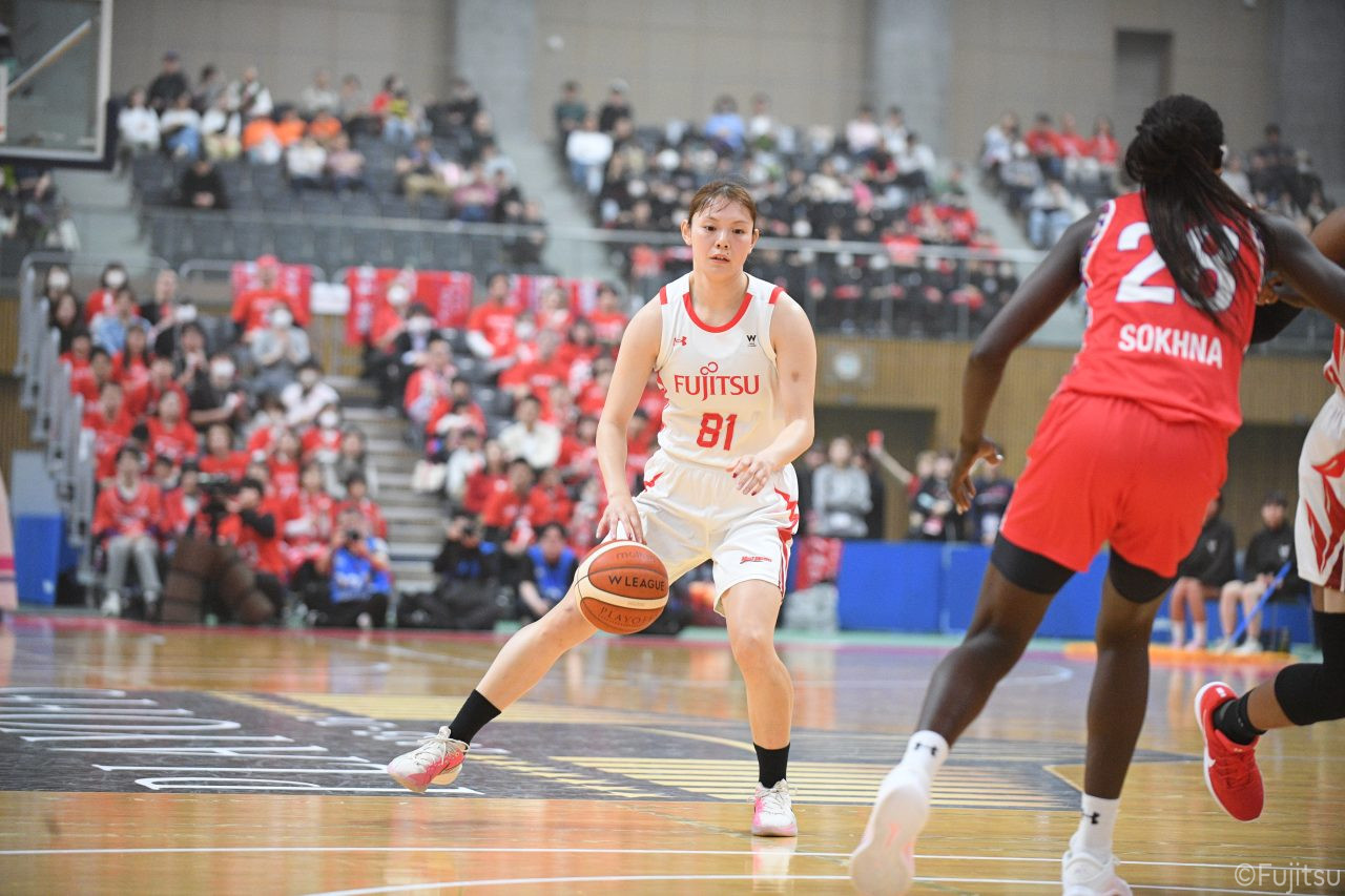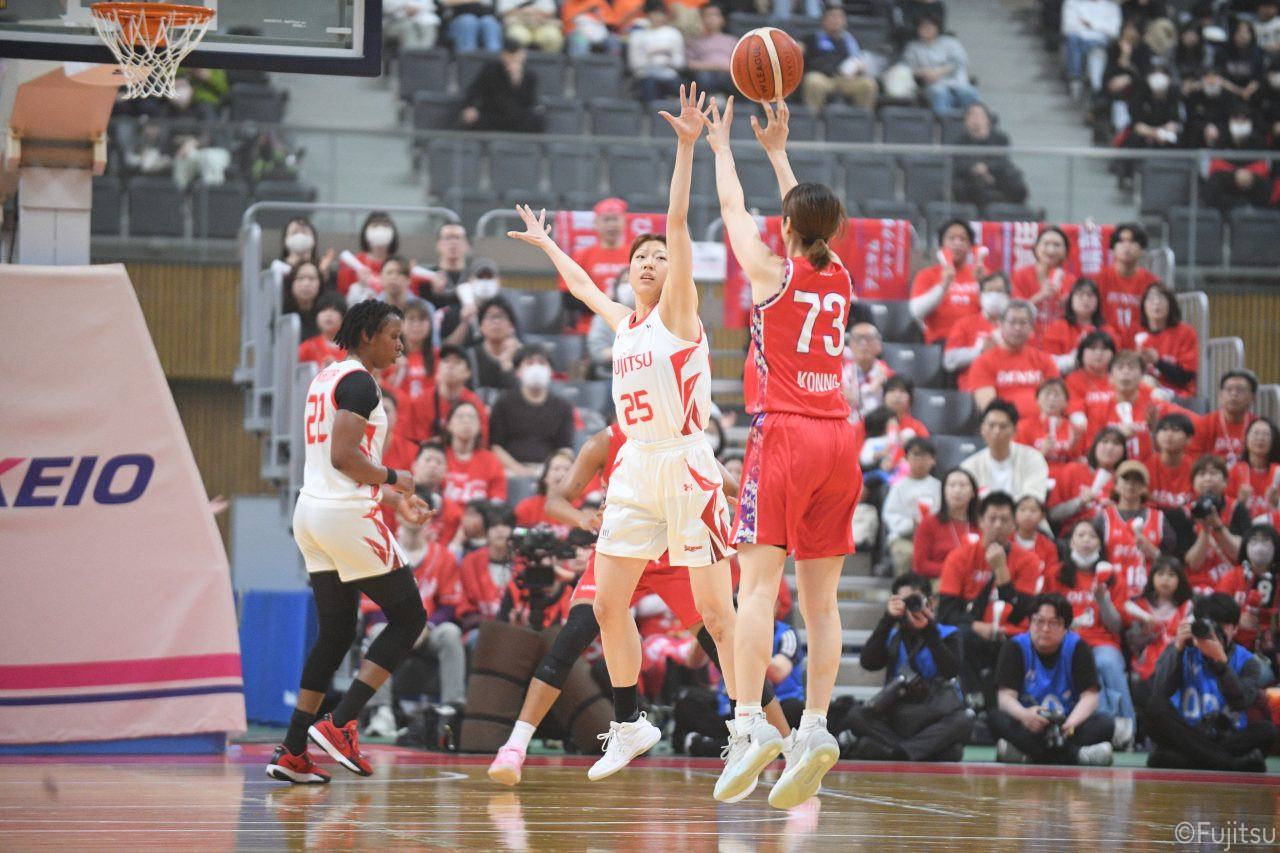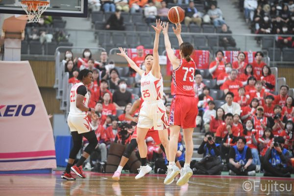 #0山田から#81宮下につながるスローインプレーで先に得点を動かすが、そこから得点が伸びていかず、その間に3連続失点し、逆転を許してしまう。タイムアウトで修正を図ると、#22エブリンのスクリーンを使った#10町田がジャンプシュートを決める。さらに#11前澤もジャンプシュートを決めるが、失点も続き、リズムをつかめないまま終盤へと進む。終盤に入ってもなかなかオフェンスの流れを作れず、#22エブリンや#8テミトペのフリースローで得点をつなぐ。その間に3ポイントシュートで失点し、前半を27-34で折り返す。