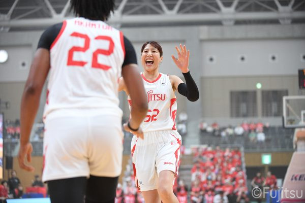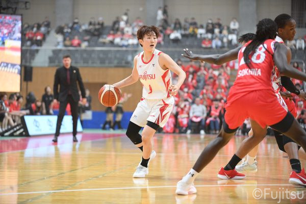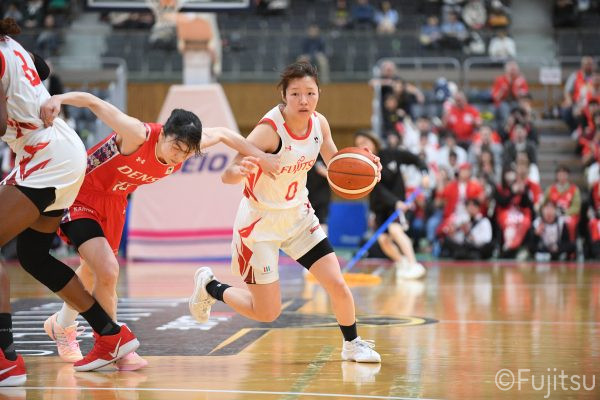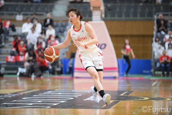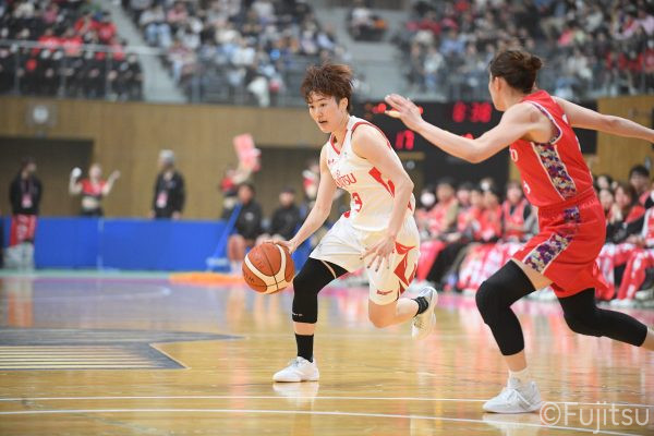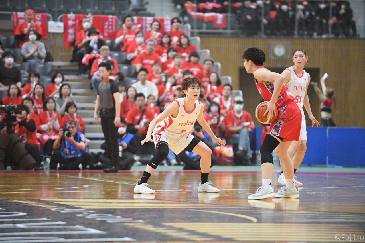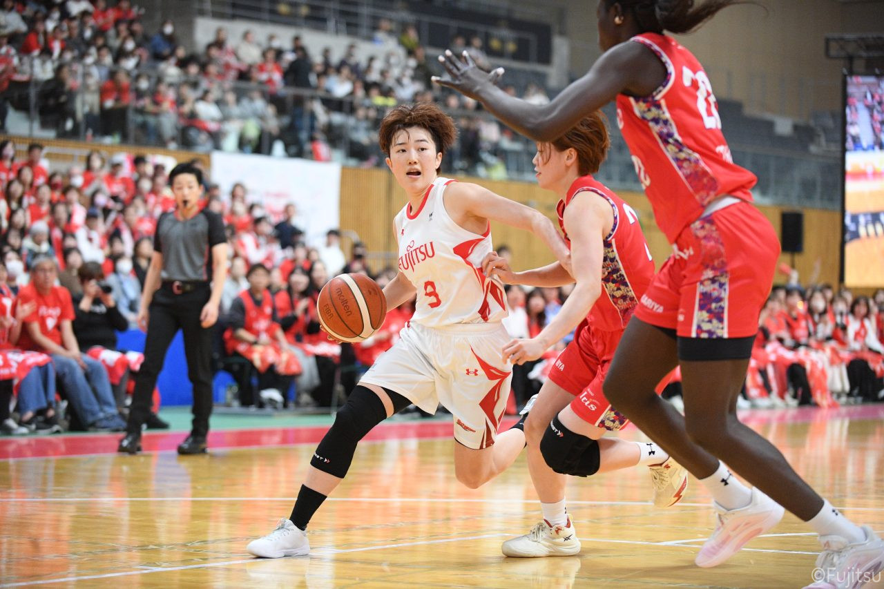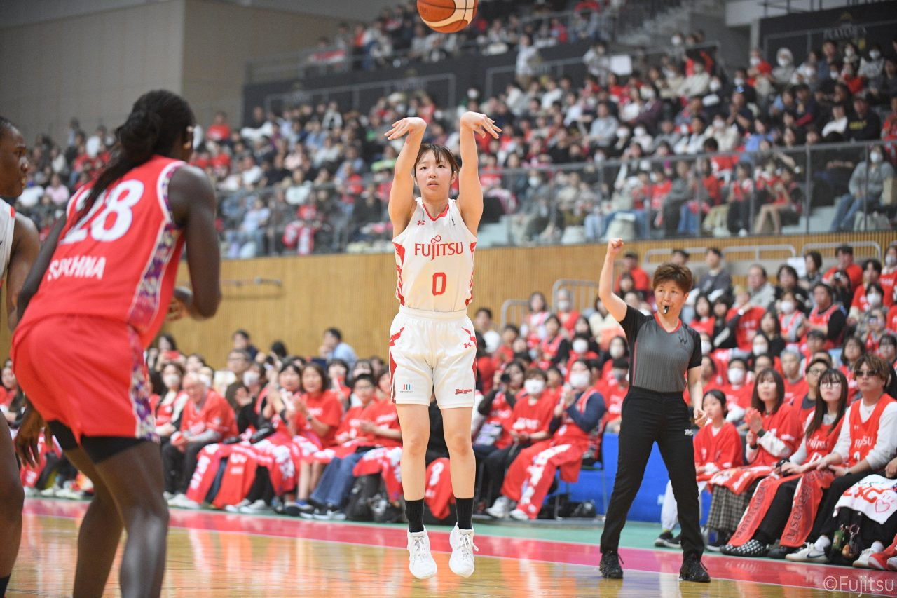 #0山田から#81宮下につながるスローインプレーで先に得点を動かすが、そこから得点が伸びていかず、その間に3連続失点し、逆転を許してしまう。タイムアウトで修正を図ると、#22エブリンのスクリーンを使った#10町田がジャンプシュートを決める。さらに#11前澤もジャンプシュートを決めるが、失点も続き、リズムをつかめないまま終盤へと進む。終盤に入ってもなかなかオフェンスの流れを作れず、#22エブリンや#8テミトペのフリースローで得点をつなぐ。その間に3ポイントシュートで失点し、前半を27-34で折り返す。