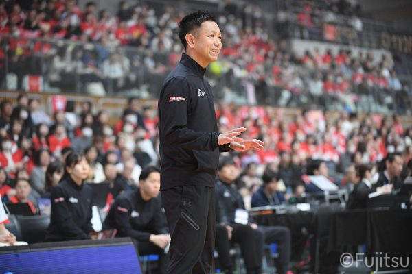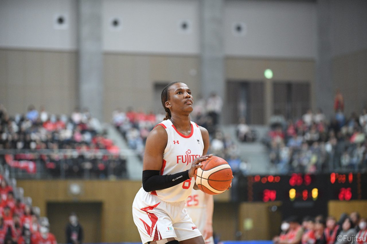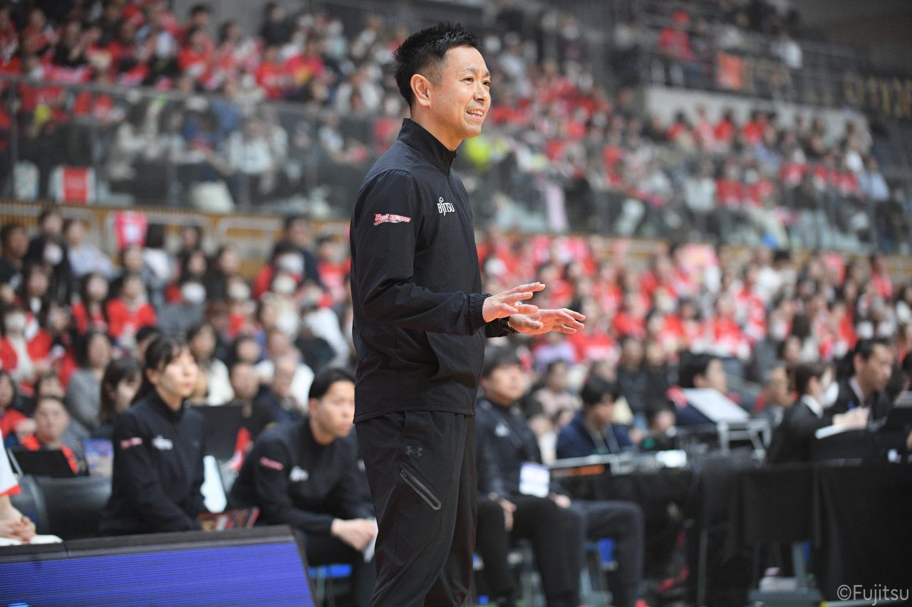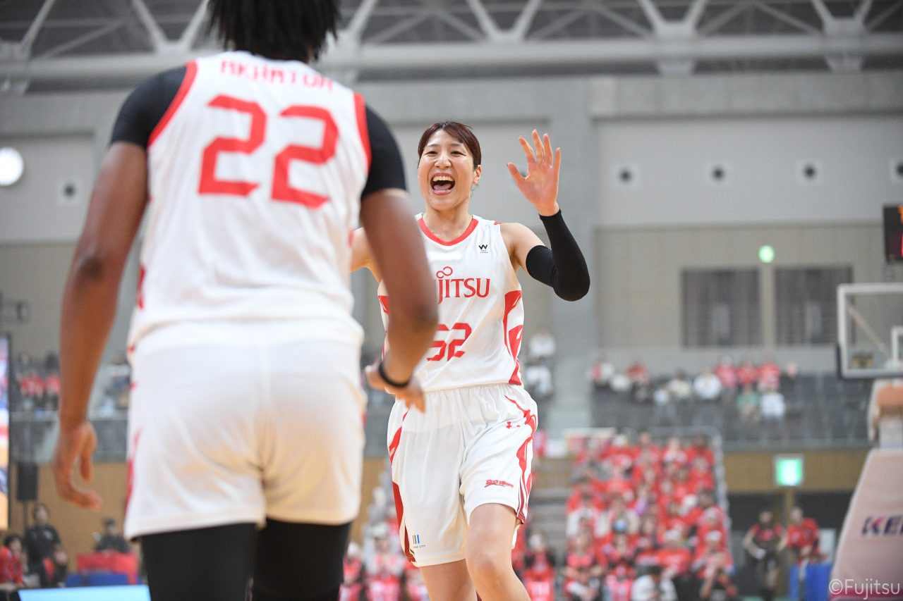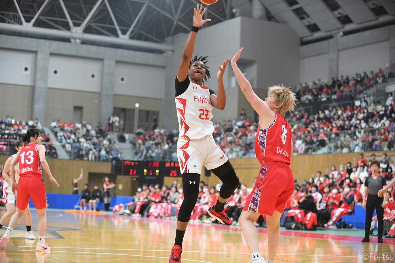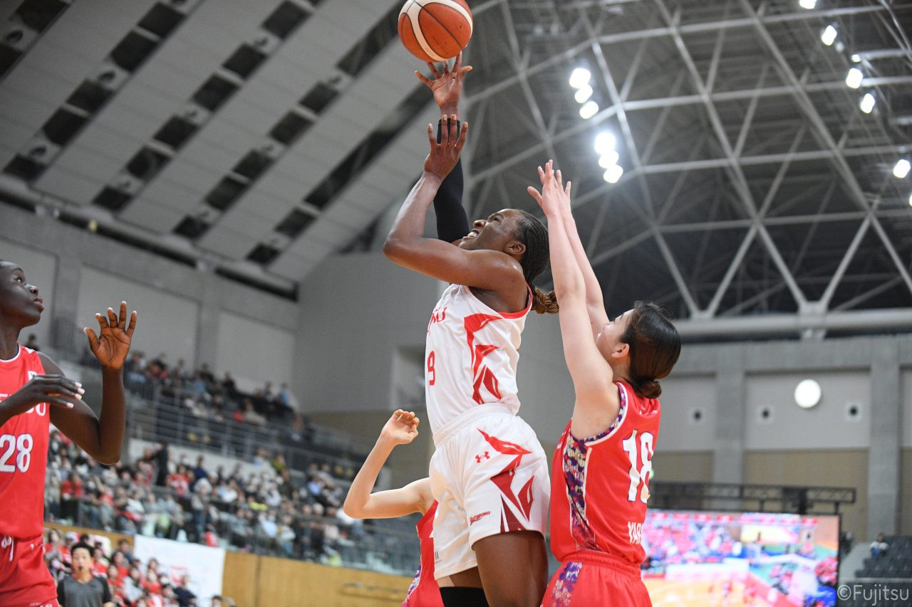 #0山田から#81宮下につながるスローインプレーで先に得点を動かすが、そこから得点が伸びていかず、その間に3連続失点し、逆転を許してしまう。タイムアウトで修正を図ると、#22エブリンのスクリーンを使った#10町田がジャンプシュートを決める。さらに#11前澤もジャンプシュートを決めるが、失点も続き、リズムをつかめないまま終盤へと進む。終盤に入ってもなかなかオフェンスの流れを作れず、#22エブリンや#8テミトペのフリースローで得点をつなぐ。その間に3ポイントシュートで失点し、前半を27-34で折り返す。