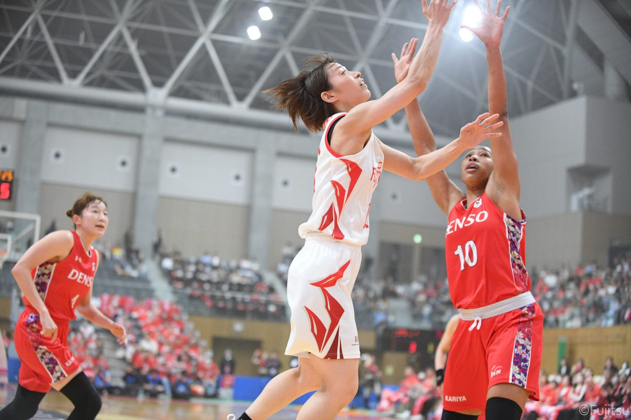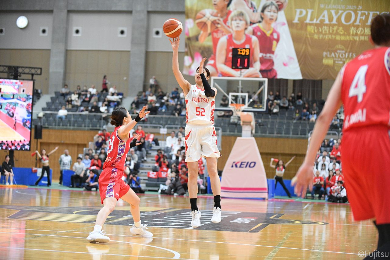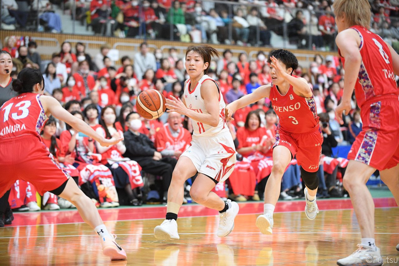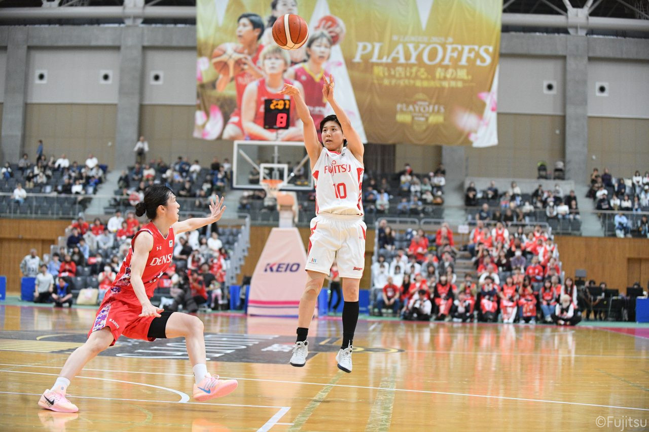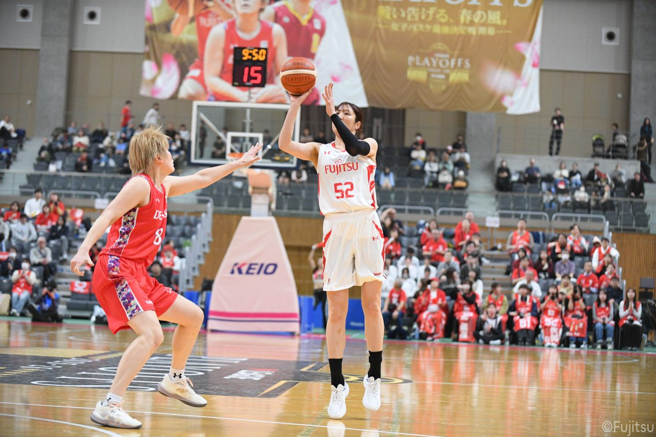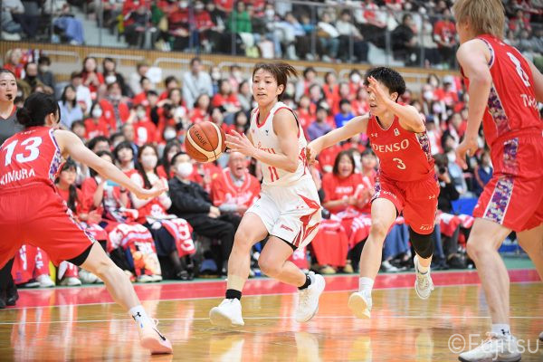 前日、勝利したデンソー アイリスとのプレーオフ・セミファイナル第2戦。レッドウェーブのスタメンは#7林(咲)、#10町田、#11前澤、#22エブリン、#52宮澤。デンソーに先制されるが、#10町田のスティールからの速攻で返すと、#22エブリンがリバウンドシュートを決めてリードする。その後はお互い譲らず、レッドウェーブは#52宮澤のWリーグ通算500本目となる3ポイントシュートや、#25内尾のドライブと速攻などで先行し、デンソーにタイムアウトを取らせる。終盤には#81宮下のパスを受けた#25内尾がフローターで決めるが、最後に連続失点し、17-15で第1Qを終える。