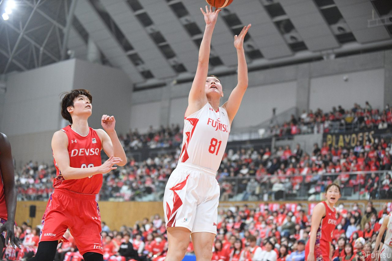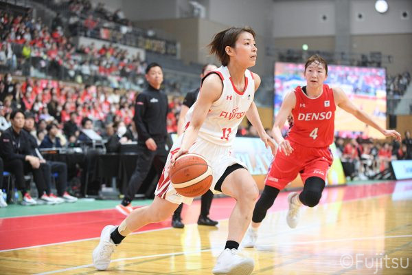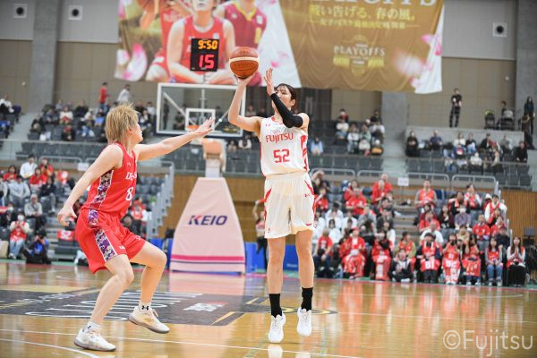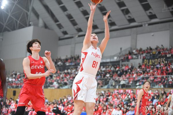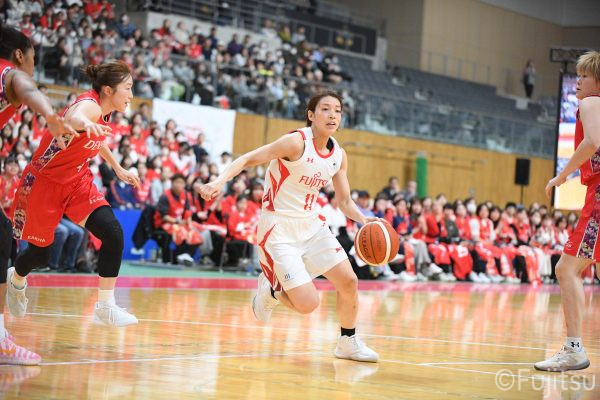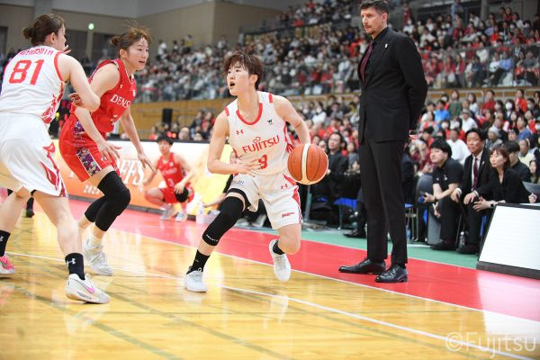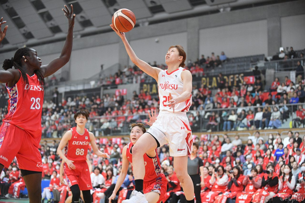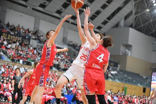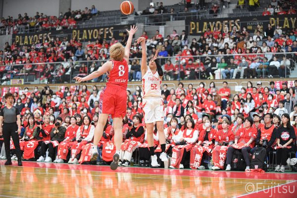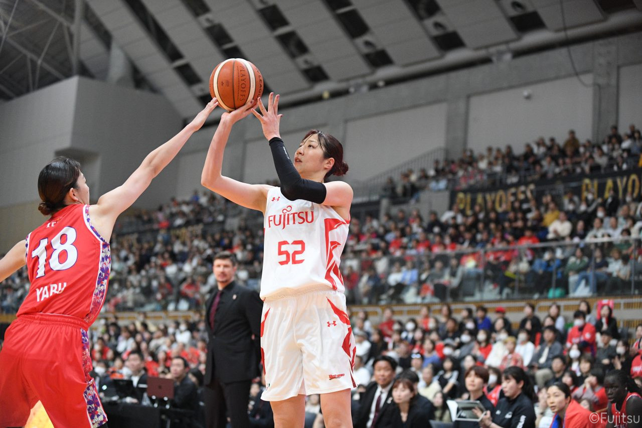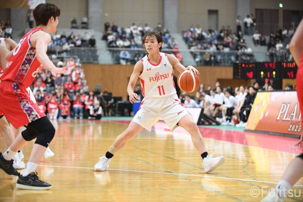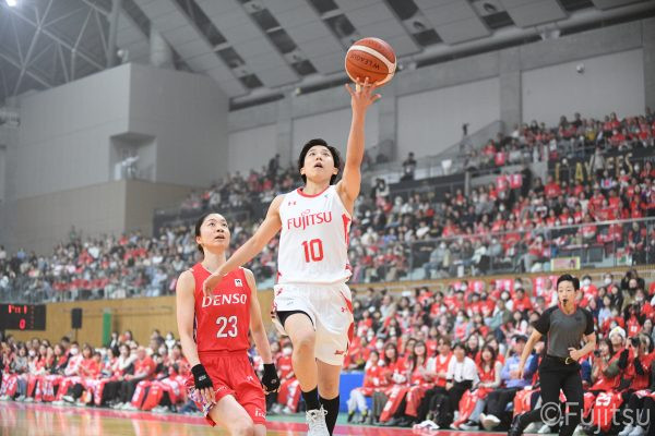 前日、勝利したデンソー アイリスとのプレーオフ・セミファイナル第2戦。レッドウェーブのスタメンは#7林(咲)、#10町田、#11前澤、#22エブリン、#52宮澤。デンソーに先制されるが、#10町田のスティールからの速攻で返すと、#22エブリンがリバウンドシュートを決めてリードする。その後はお互い譲らず、レッドウェーブは#52宮澤のWリーグ通算500本目となる3ポイントシュートや、#25内尾のドライブと速攻などで先行し、デンソーにタイムアウトを取らせる。終盤には#81宮下のパスを受けた#25内尾がフローターで決めるが、最後に連続失点し、17-15で第1Qを終える。