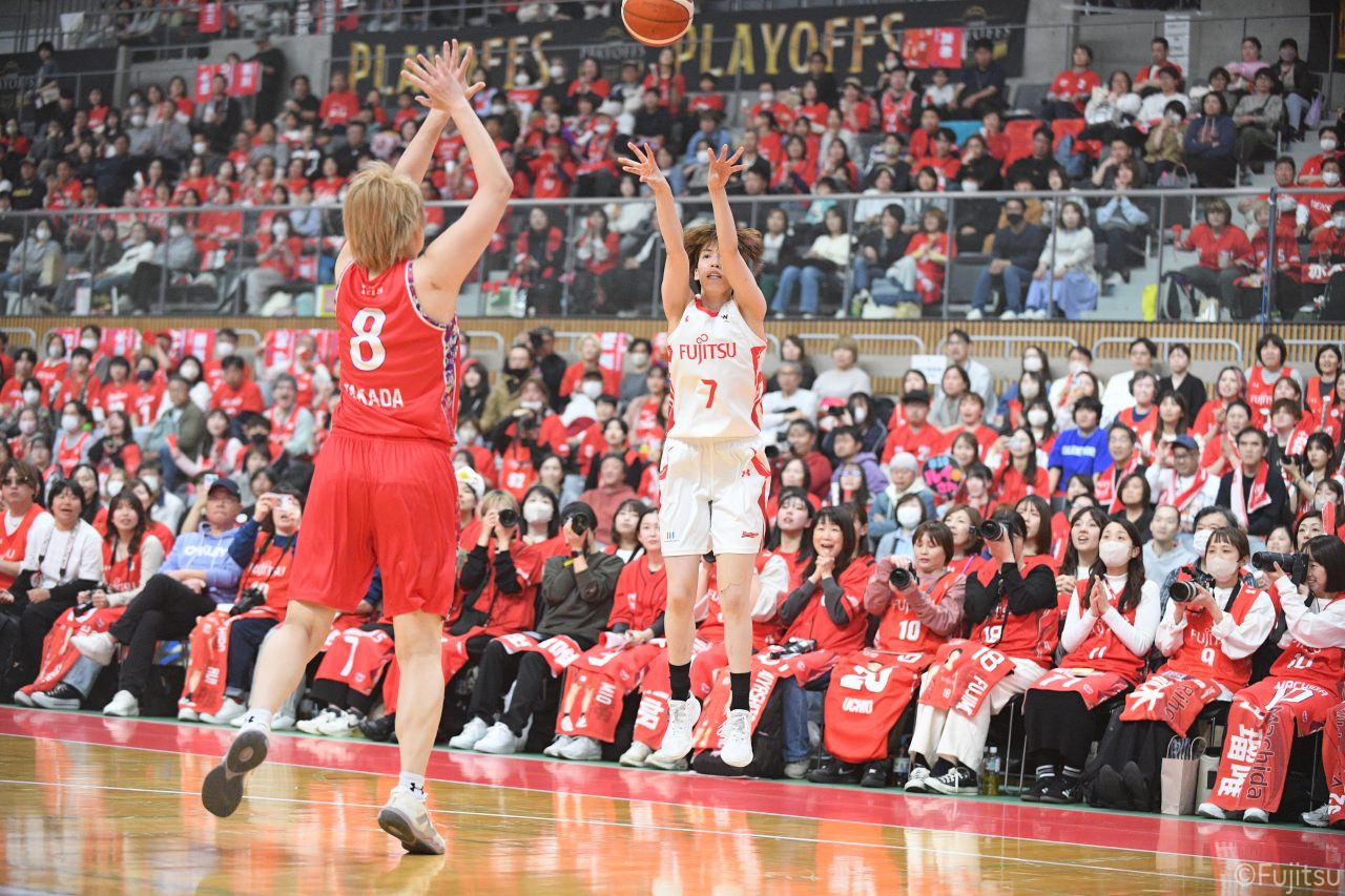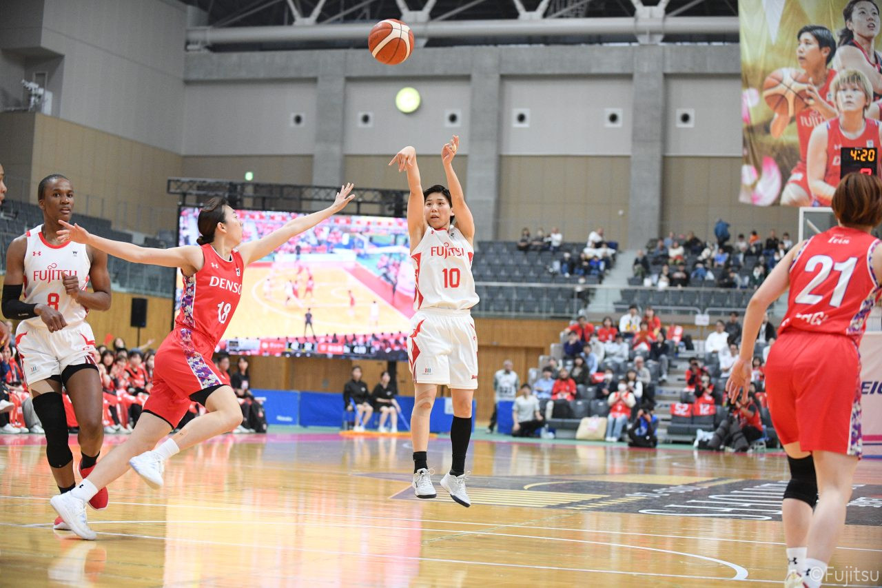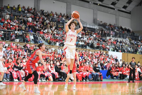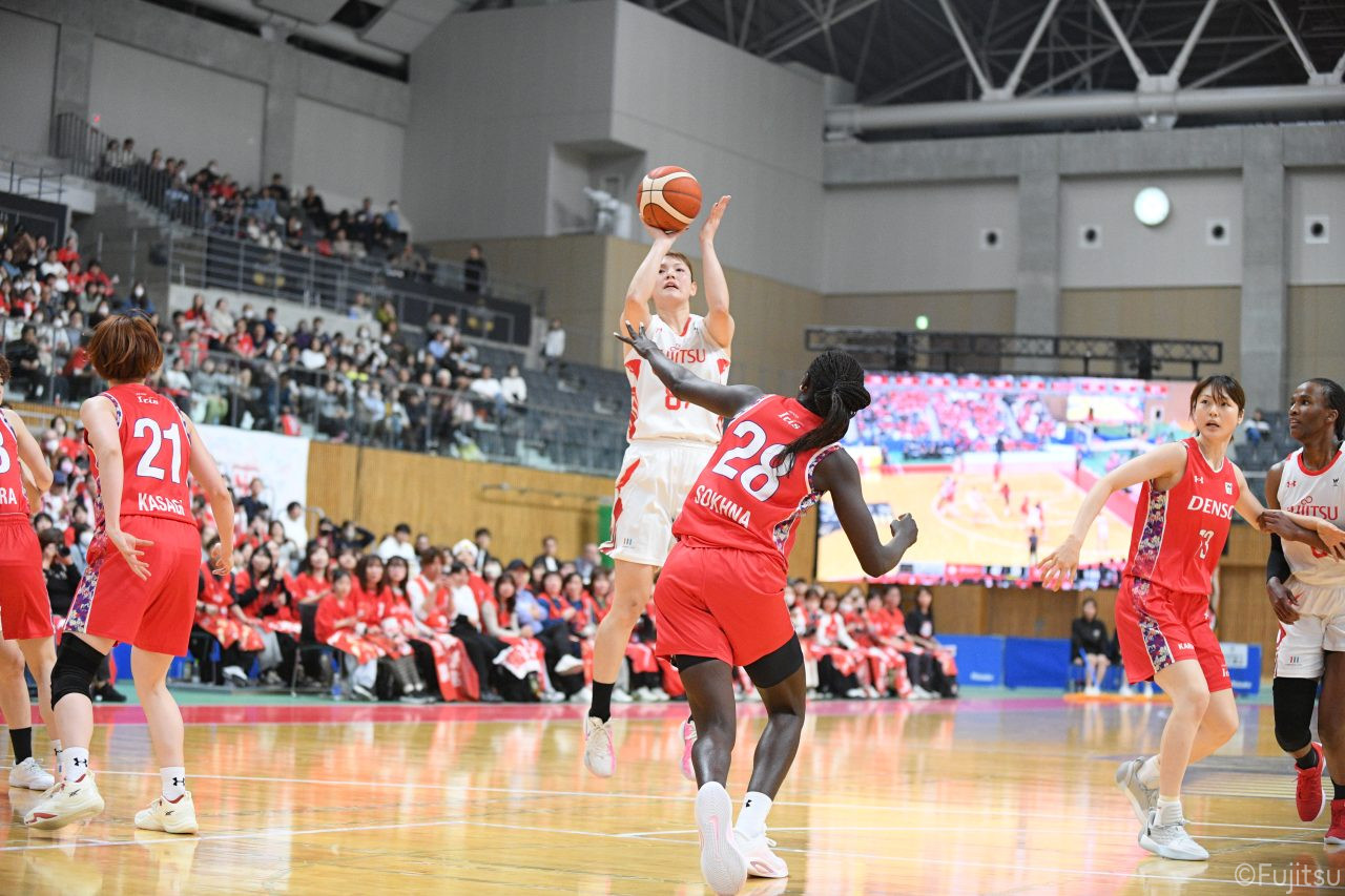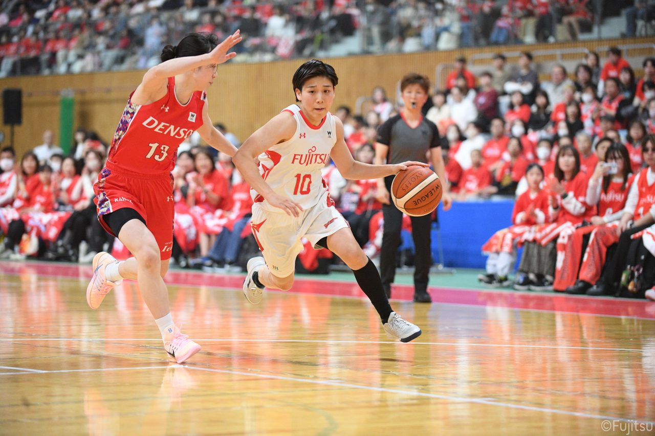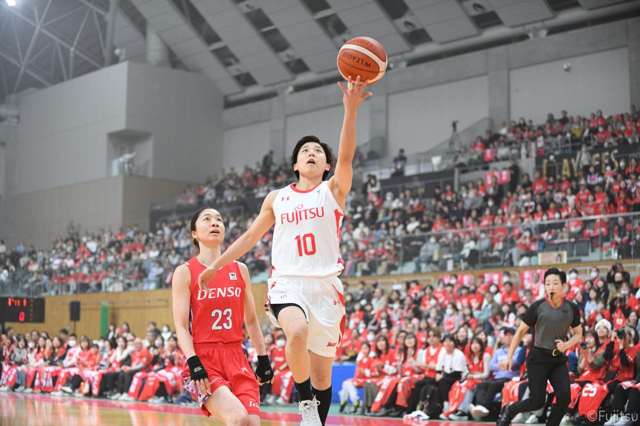 前日、勝利したデンソー アイリスとのプレーオフ・セミファイナル第2戦。レッドウェーブのスタメンは#7林(咲)、#10町田、#11前澤、#22エブリン、#52宮澤。デンソーに先制されるが、#10町田のスティールからの速攻で返すと、#22エブリンがリバウンドシュートを決めてリードする。その後はお互い譲らず、レッドウェーブは#52宮澤のWリーグ通算500本目となる3ポイントシュートや、#25内尾のドライブと速攻などで先行し、デンソーにタイムアウトを取らせる。終盤には#81宮下のパスを受けた#25内尾がフローターで決めるが、最後に連続失点し、17-15で第1Qを終える。