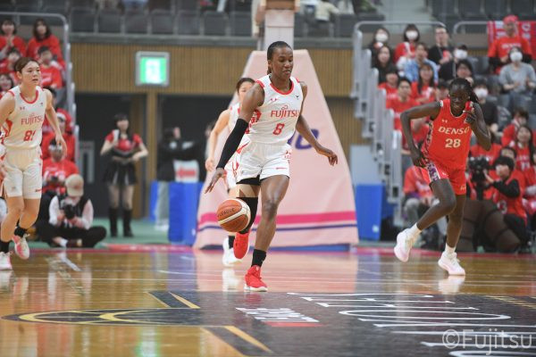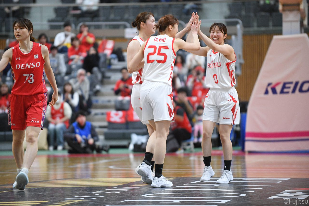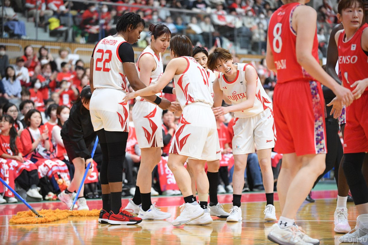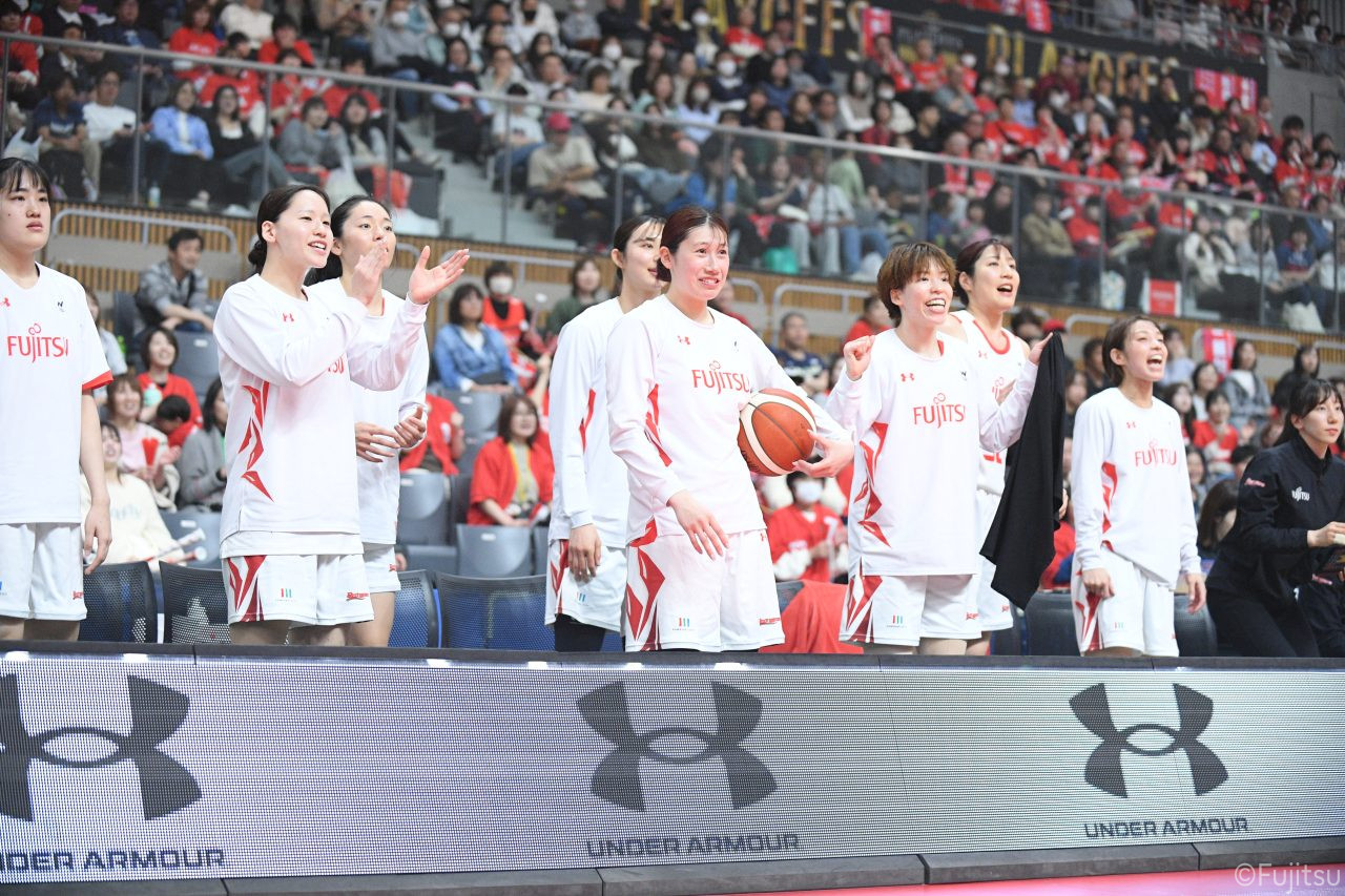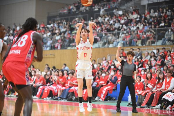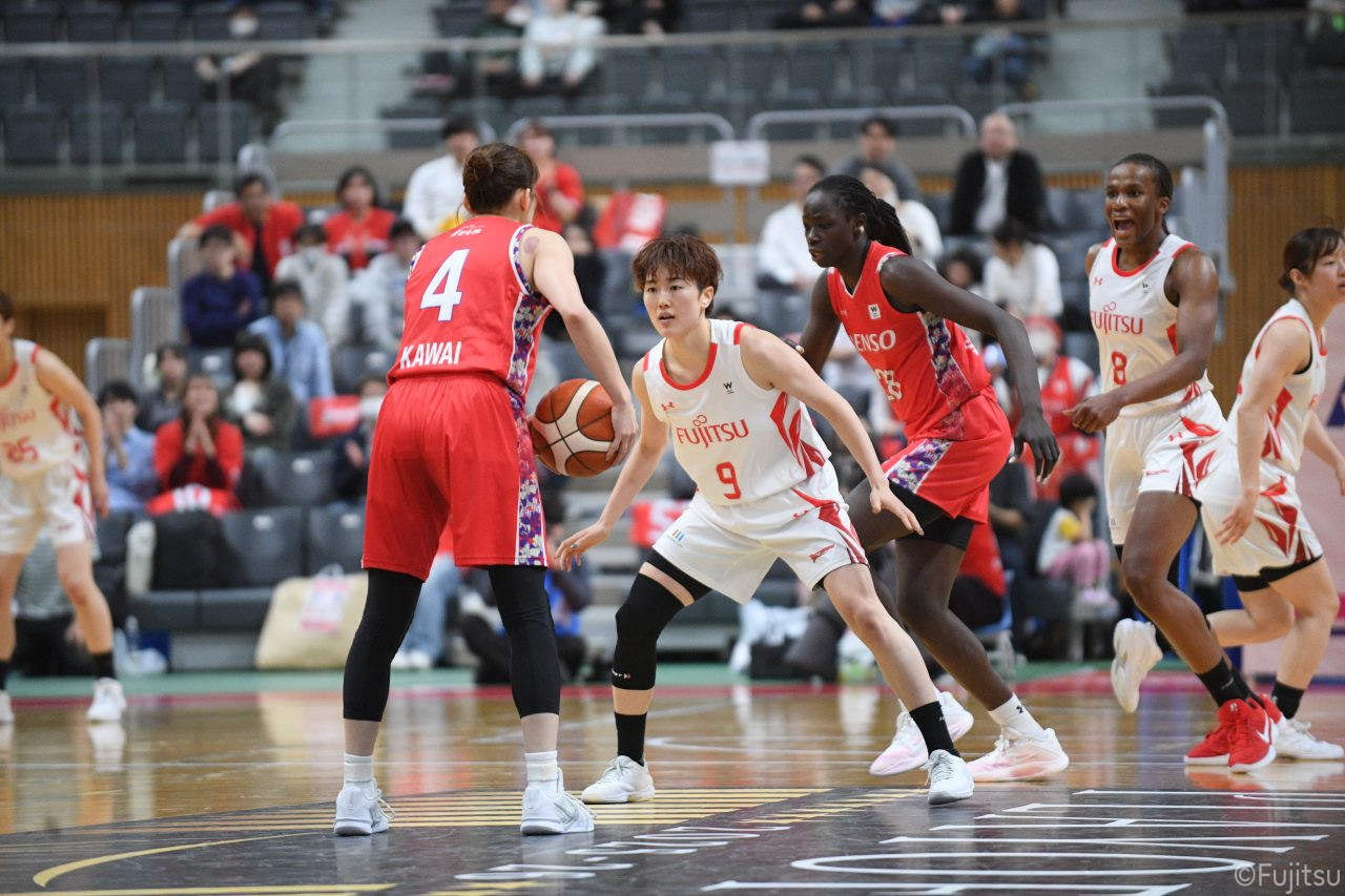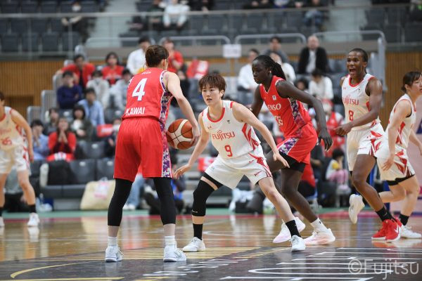 前日、勝利したデンソー アイリスとのプレーオフ・セミファイナル第2戦。レッドウェーブのスタメンは#7林(咲)、#10町田、#11前澤、#22エブリン、#52宮澤。デンソーに先制されるが、#10町田のスティールからの速攻で返すと、#22エブリンがリバウンドシュートを決めてリードする。その後はお互い譲らず、レッドウェーブは#52宮澤のWリーグ通算500本目となる3ポイントシュートや、#25内尾のドライブと速攻などで先行し、デンソーにタイムアウトを取らせる。終盤には#81宮下のパスを受けた#25内尾がフローターで決めるが、最後に連続失点し、17-15で第1Qを終える。