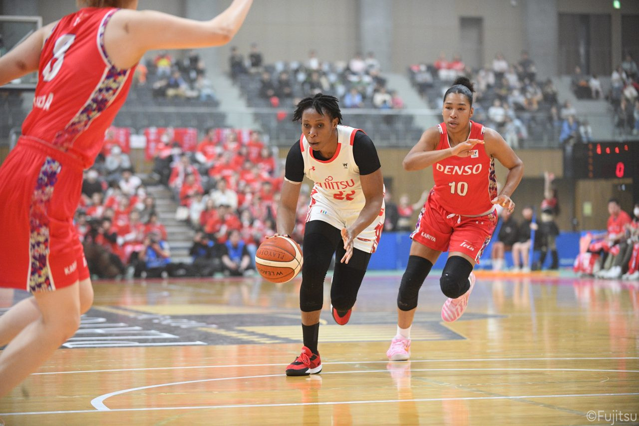 #10町田が#52宮澤のスクリーンを使ってジャンプシュートと、その宮澤が3ポイントシュートを沈めて2点差とする。しかしそこからまたも3ポイントシュート2本を含む3連続失点で10点のビハインドを背負うこととなる。宮澤の3ポイントシュート以降、約5分半得点の止まっていたレッドウェーブだったが、終盤、#25内尾のドライブを#8テミトペがリバウンドし、バスケットカウントで3点プレーを決めると、#8テミトペはさらにリバウンドシュートをねじ込んで、デンソーにタイムアウトを取らせる。しかし流れは変わらず、その後も#25内尾のドライブと#81宮下のジャンプシュートが決まって41-42。1点差で最終Qへと突入する。