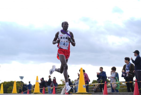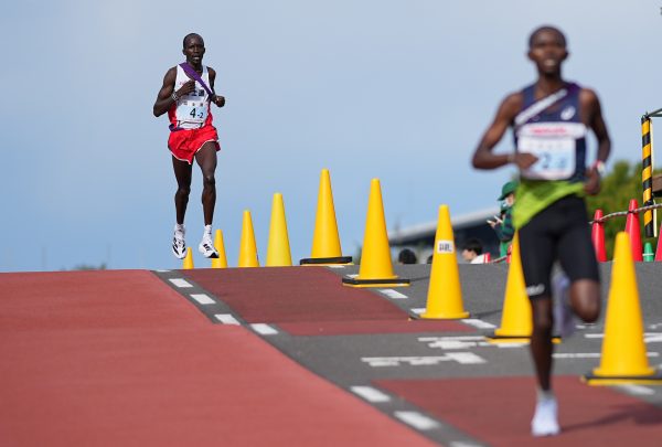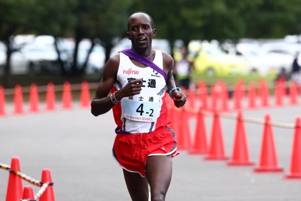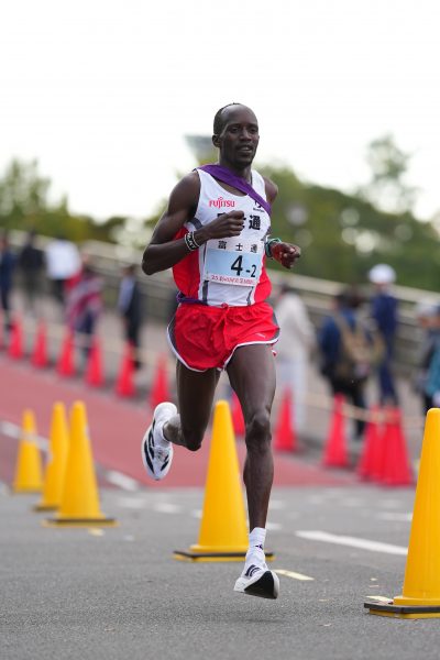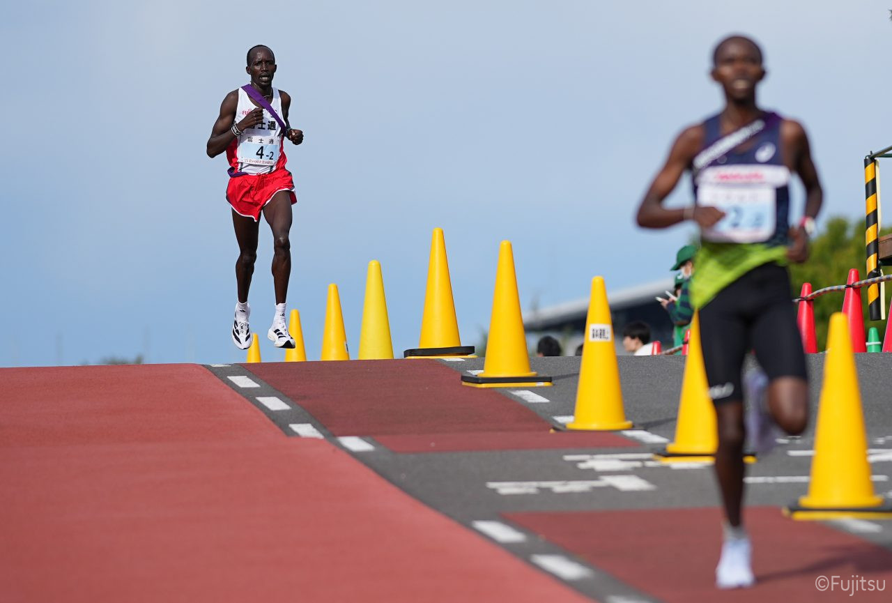 外国人ランナー対決となった2区は、ベナード・キメリが登場。トップのGMOインターネットグループを追って縦長になる展開で、1周を終えるとキメリは8番目で単独走。2周目に入ってもトップGMOインターネットグループを2位集団3チームが追う展開は変わらない。キメリは一時、ヤクルトのスタンネリー・ワイザカ選手、コニカミノルタのキベット・ロジャース選手と3人で前を追う時間もあったが、徐々に離されてしまい、トップと1分00秒差、10着での襷リレーとなった。